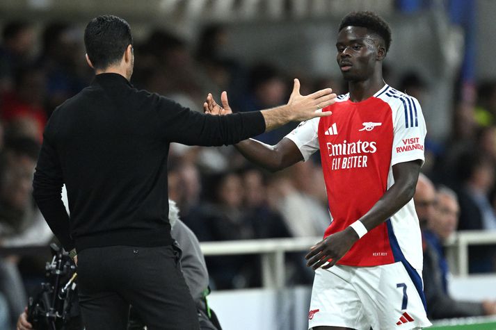 Arteta ætlar ekki að hvíla Saka fyrir Meistaradeildina Óskar Ófeigur Jónsson skrifar 23. apríl 2025 15:17 Mikel Arteta, knattspyrnustjóri Arsenal, tekur hér Bukayo Saka af velli í Meistaradeildarleik í vetur. Getty/Justin Setterfield Mikel Arteta mun að eigin sögn ekki hvíla lykilmenn liðsins fyrir undanúrslitaleikina í Meistaradeildinni. Arsenal sló Real Madrid út úr átta liða úrslitum Meistaradeildarinnar og komst því einu skrefi nær því að vinna Meistaradeildina í fyrsta skipti í sögu félagsins. Arsenal er aftur á móti þrettán stigum á eftir Liverpool í ensku úrvalsdeildinni og á aðeins tölfræðilega möguleika á því að vinna ensku deildina í ár. Mörgum fyndist það rökrétt að hvíla leikmenn fyrir undanúrslitaleikina í Meistaradeildinni á móti Paris Saint Germain en franski stjórinn virðist ekki vera líklegur til þess. Arsenal mætir Crystal Palace í ensku úrvalsdeildinni í kvöld og Liverpool verður meistari tapi Arsenal leiknum. Arsenal manager Mikel Arteta says Bukayo Saka has a "good chance" of featuring tomorrow against Crystal Palace but Riccardo Calafiori remains injured and Jorginho is set to be out for a "few weeks" 🚨 pic.twitter.com/zWOQ800Wze— Sky Sports News (@SkySportsNews) April 22, 2025 Bukayo Saka er nýkominn til baka eftir meiðsli og fékk högg í síðasta leik. Arteta segist samt ekki ætla að hvíla Saka fyrir leikina mikilvægu í Meistaradeildinni. „Við getum ekki hugsað hlutina á þessum nótum þegar leikmennirnir eru heilir og vilja spila. Þá verða þeir að fá að spila,“ sagði Arteta. „Þeir njóta sín best þegar þeir spila, ná með því upp stöðugleika og um leið eru þeir í góðu jafnvægi bæði tilfinningalega og líkamlega. Þeir eru þá í góðum takti og þá eru þeir bestir,“ sagði Arteta. „Ef þeir eru ekki leikfærir þá þarf ekkert að ræða þetta. Ef þeir eru ekki í góðum gír þá munum við ekki spila þeim. Annars spilum við þeim,“ sagði Arteta. Saka er gríðarlega mikilvægur fyrir Arsenal en hann hefur komið að 25 mörkum í 30 leikjum á leiktíðinni. Hann var mjög góður í seinni leiknum á móti Real Madrid og stóð sig einnig vel í 4-0 sigrinum á Ipswich Town um helgina. Saka fékk samt slæmt högg en Arteta var ekki búinn að ákveða neitt með kvöldið þegar hann ræddi við blaðamenn á fjölmiðlafundi fyrir leikinn. „Við verðum bara að bíða og sjá hvernig honum líður eftir æfinguna. Þetta var samt ekkert alvarlegt,“ sagði Arteta. Just Gary Cotterill talking about Bukayo Saka at Arsenal's training ground with Mikel Arteta walking Win the dog in the background 🐕 pic.twitter.com/IpDEWLFOIh— Sky Sports Premier League (@SkySportsPL) April 22, 2025 Enski boltinn Mest lesið Þessi tíu eru tilnefnd sem Íþróttamaður ársins 2025: 23 ára aldursmunur Sport Sagan ekki sönn: „Veit ekki hvaðan þetta á að hafa komið“ Íslenski boltinn Sakaður um niðurlægingu: „Við viljum ekki hafa hann sem þjálfara“ Handbolti Erfitt að vera í burtu þegar mamma greindist Fótbolti Slot mun sakna Isak í tvo mánuði eftir „glórulausa tæklingu“ Enski boltinn Einn leikmaður með samning og völlurinn ólöglegur Fótbolti Kansas frá Kansas til Kansas Sport Áfallið staðreynd og Isak búinn í aðgerð Enski boltinn Missti alveg stjórn á skapinu en það skilaði sigri Körfubolti Vildi tapa legg: „Mesti hávaði sem ég hef heyrt“ Sport Fleiri fréttir Chelsea setur sig í samband við Semenyo Jiménez jafnaði bestu vítaskyttu sögunnar Slot mun sakna Isak í tvo mánuði eftir „glórulausa tæklingu“ Sjáðu „auma“ vítið sem skilaði Fulham sigri Fulham skildi Forest eftir við fallsvæðið Áfallið staðreynd og Isak búinn í aðgerð Fagnaði titli Liverpool sem óður maður um alla borg „Allir virðast elska hann“ „Þetta mun ekki buga okkur“ Guardiola mun vigta leikmenn Man City eftir jólin „Ef þið væruð Antoine Semenyo, hvert mynduð þið fara?“ Sjáðu mörkin: Rogers sá um Manchester United Óttast að Isak hafi fótbrotnað Tvenna frá Rogers tryggði Villa sigur gegn Manchester United Fimmta sinn sem Arsenal er á toppnum um jólin: Unnu ekki titilinn í fyrstu fjögur skiptin „Viljum við að okkar verði minnst fyrir að vera skræfur?“ „Ef dómarinn hefði sinnt sínu starfi almennilega hefði Romero ekki fengið spjald“ Haaland gaf barnabarni Hareide gjöf Sjáðu mörkin úr enska: Sviptingar, sænskt þema og svakalegar tæklingar Calvert-Lewin hættir ekki að skora Gyökeres skaut Arsenal aftur á toppinn Slot fámáll um stöðuna á Isak Gleði og sorg í sigri Liverpool Dramatík er Broja reyndist hetja Burnley Haaland frábær er Manchester City komst á toppinn Andri Lucas skoraði í langþráðum sigri Blackburn Chelsea vann upp tveggja marka forskot á St James' Park Ekkert fararsnið á Guardiola sem segir að City verði að vera undirbúið Tíu bestu mörkin úr leikjum Liverpool og Tottenham Salah bað samherjana afsökunar Sjá meira