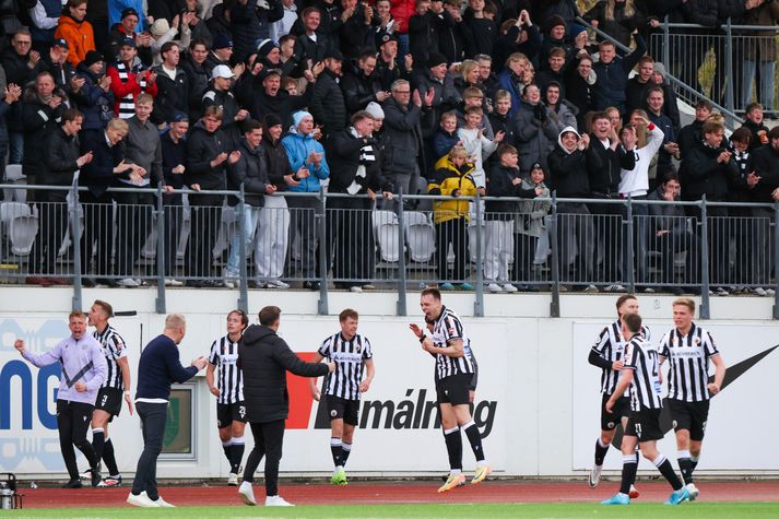 Fimm mörk að meðaltali í leik hjá KR Ingvi Þór Sæmundsson skrifar 6. maí 2025 13:32 KR-ingar fagna með stuðningsmönnum sínum á Kópavogsvelli í gær. vísir/diego Óhætt er að segja að leikir KR í Bestu deild karla í sumar hafi verið afar skemmtilegir. Það vantar allavega ekki mörkin í þá. KR gerði 3-3 jafntefli við Íslandsmeistara Breiðabliks á Kópavogsvelli í gær. KR-ingar lentu 2-0 undir, jöfnuðu og komust yfir en Blikar jöfnuðu í uppbótartíma. KR er í 4. sæti með sjö stig eftir fimm umferðir og er eina taplausa liðið í deildinni. Markatala KR er 15-10 og því hafa verið skoruð samtals 25 mörk í leikjum liðsins. Það gera fimm mörk að meðaltali í leik. Sjö leikmenn KR hafa skorað mörkin fimmtán sem liðið hefur gert. Jóhannes Kristinn Bjarnason hefur skorað fjögur mörk, Luke Rae og Eiður Gauti Sæbjörnsson þrjú hvor, Aron Sigurðarson tvö og Matthias Præst, Gabríel Hrannar Eyjólfsson og Finnur Tómas Pálmason eitt mark hver. Verða ekki sigraðir Eftir leikinn á Kópavogsvelli kvaðst Óskar Hrafn Þorvaldsson, þjálfari KR, vera hreykinn af sínu liði. „Fyrst og fremst er ég auðvitað bara mjög stoltur af liðinu, sagði við þá inni í klefa eftir leik að þeir byggju yfir mikilvægasta hráefninu sem þú getur haft þegar þú ert að búa til lið. Sem er að vita ekki hvenær þú átt að gefast, vita ekki hvenær þú ert í vonlausri stöðu. Þeir héldu áfram og áfram og áfram. Við spiluðum okkar leik, alls ekki allt sem heppnaðist, eðlilega þar sem við erum að spila á móti Íslandsmeisturunum á heimavelli. Þeir eru alltaf að fara gera þér lífið erfitt, en það er bara svo mikill karakter í þessu liði,“ sagði Óskar í samtali við Vísi. Næsti leikur KR er gegn ÍBV á AVIS-vellinum í Laugardalnum á laugardaginn kemur. Eyjamenn eru með sjö stig líkt og KR-ingar. Besta deild karla KR Mest lesið Þessi tíu eru tilnefnd sem Íþróttamaður ársins 2025: 23 ára aldursmunur Sport Sagan ekki sönn: „Veit ekki hvaðan þetta á að hafa komið“ Íslenski boltinn Sakaður um niðurlægingu: „Við viljum ekki hafa hann sem þjálfara“ Handbolti Erfitt að vera í burtu þegar mamma greindist Fótbolti Arsenal - Crystal Palace | Síðasta lausa sætið í undanúrslitum Enski boltinn Glódís framlengir samninginn við Bayern Fótbolti Öll höllin æpti nafn Gísla í spennutrylli Handbolti Slot mun sakna Isak í tvo mánuði eftir „glórulausa tæklingu“ Enski boltinn Kansas frá Kansas til Kansas Sport Einn leikmaður með samning og völlurinn ólöglegur Fótbolti Fleiri fréttir Sagan ekki sönn: „Veit ekki hvaðan þetta á að hafa komið“ Meira en 37 stöðugildi hjá Knattspyrnusambandi Íslands Óskar Hrafn um komu Arnórs Ingva: „Gífurlega dýrmætt fyrir KR“ Arnór Ingvi orðinn leikmaður KR Breiðablik kaupir Jónatan frá Norrköping Elías mættur til meistaranna KR sagt vera að landa Arnóri Ingva Hilmar Árni til starfa hjá KR Segir fjórðung í bók Óla ósannan Víkingur í úrslit Bose-bikarsins eftir sigur „Verið heiður að spila í appelsínugulu með frábærum liðsfélögum“ Þekkir Egilshöllina vel og skoraði gegn fyrrum félögum Strákar Heimis Guðjóns fengu slæman skell í fyrsta leik Axel verður áfram hjá Aftureldingu Kveður pabba sinn í Laugardalnum og fer til FH „Félag sem var í basli með að ná endum saman og greiða laun á réttum tíma“ Skrýtið og taktlaust: „Ég er ekkert sátt með niðurstöðuna“ Fanndís kveður sviðið: „Ég er búin að fella nokkur tár“ Gylfi með tvö og Víkingar byrja á sigri Frá Akureyri til Danmerkur Markadrottningin heldur að landsliðið sé búið spil Strákarnir í 2. flokki Vals þeir einu sem ekki spila fyrir áramót Dæturnar vildu norður: „Mun alltaf gera allt fyrir þær“ Stjarnan sækir markvörð í 3. deildina „Ég var orðinn algjörlega bugaður“ Jónatan áfram á Hlíðarenda: „Var alltaf jákvæður fyrir því að framlengja“ Óli Jó kallar ráðninguna á Jóa Kalla algjört bull „Ég elska þig Ísland, takk fyrir allt!“ Sextán ára með fernu fyrir meistara Víkings Valur dregur sig úr Bose-bikarnum Sjá meira
