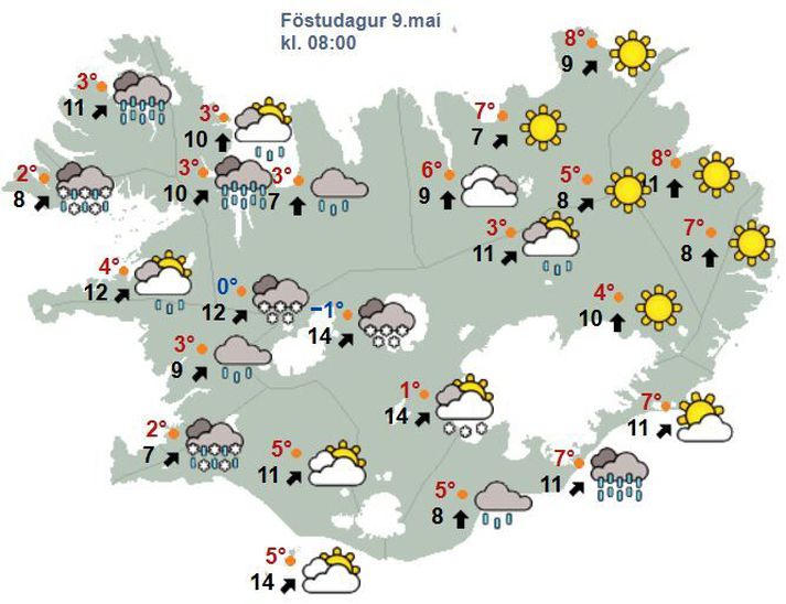 Á vef Veðurstofunnar segir að það verði þurrt og bjart á köflum norðaustantil. Gular viðvaranir eru í gildi við Faxaflóa, Breiðafjörð, Vestfirði og Strandir og Norðurland vestra vegna éljagangs til kvölds. Vegagerðin beinir því til vegfarenda um athuga að víða á Vestur- og Norðurlandi sé hálka eða hálkublettir á fjallvegum, meðal annars á Hellisheiði og í Þrengslum. Hiti á landinu verður á bilinu tvö til tólf stig, mildast austanlands. „Til morguns dregur enn frekar úr vindi og úrkomu og líkur á að sólin nái aðeins meir á milli skýja, sem aftur gefur aðeins hlýrra veður yfir daginn. Á sunnudag er að sjá að vindur verði orðinn suðvestlægari ásamt því að það hlýnar heldur og að auki gera spá ráð fyrir að þurrt verði um mest allt land. Síðan er að sjá að veðrið haldi áfram að batna enn frekar eftir helgi,“ segir á vef Veðurstofunnar. Spákort fyrir klukkan átta í dag.Veðurstofan Veðurhorfur á landinu næstu daga Á laugardag: Vestlæg átt, 5-13 m/s og dálítil él eða skúrir, en yfirleitt bjartviðri austanlands. Hiti 3 til 12 stig, svalast á Vestfjörðum. Á sunnudag: Suðvestan 3-10 m/s, skýjað með köflum og þurrt að mestu, en léttskýjað eystra. Hiti 7 til 13 stig yfir daginn. Á mánudag, þriðjudag, miðvikudag og fimmtudag: Fremur hægar suðlægar áttir og skýjað með köflum við suðvesturströndina, en annars víða léttskýjað eða bjartviðri. Hlýtt í veðri, einkum fyrir norðan og austan.