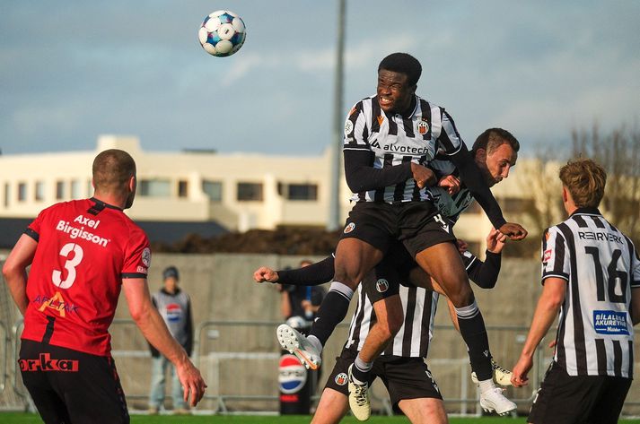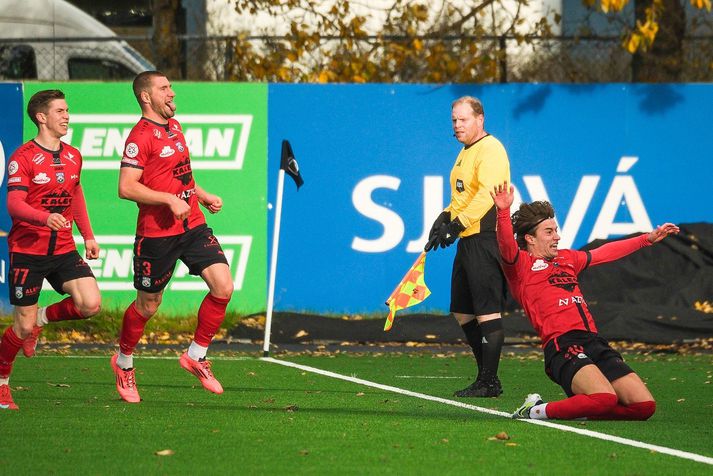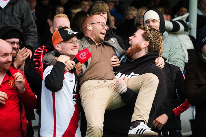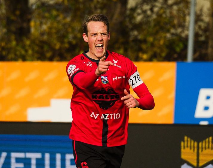 KR og Afturelding gerðu 2-2 jafntefli í þriðju umferð neðri hluta Bestu deildar karla í dag. Þrjú mörk litu dagsins ljós á lokamínútum leiksins og Elmar Kári Cogic jafnaði metin fyrir gestina á fimmtu mínútu uppbótartímans. Bæði lið eru því enn í fallsætum Bestu deildar karla þegar tvær umferðir eru eftir. Aðeins einu stigi munar milli liðanna, jöfnunarmark (mörk) Aftureldingar því afar dýrmætt. KR er í neðsta sæti með 25 stig og Afturelding þar fyrir ofan með 26 stig. Vestri er svo fyrir ofan fallsvæðið með 27 stig en á leik til góða á útivelli gegn KA á morgun. KR komst yfir snemma KR leikjum samkvæmt voru þeir svarthvítu mun meira með boltann, á meðan Afturelding nýtti sér frekar skyndisóknir. Afturelding veitti fyrsta höggið eftir átta mínútur, en það var laust skot frá Hrannari Snæ sem Halldór Snær átti auðvelt með að verja. KR tók forystuna eftir þrettán mínútna leik. Finnur Tómas átti frábæra sending yfir vörn Aftureldingar og Aron Sigurðarson, í fyrstu snertingu, lagði hann listilega vel fyrir Eið Gauta Sæbjörnsson sem afgreiddi færið fagmannlega. Eiður Gauti braut ísinn snemma en svo var ekki skorað lengi. vísir / anton Hrannar Snær helsta ógnin Það sem eftir lifði hálfleiks ógnaði KR lítið, þrátt fyrir einhverjar þrjú hundruð sendingar og valtan varnarleik Aftureldingar á köflum. Mark Eiðs Gauta reyndist þeirra eina skot í fyrri hálfleik. Afturelding tókst sömuleiðis illa að skapa sér færi, Hrannar Snær var þeirra helsta ógn en tókst ekki að töfra fram nein alvöru færi og fór illa að ráði sínu í tveimur sóknum. Afturelding jafnaði seint Í seinni hálfleik hækkaði hitastigið inni á vellinum töluvert og meira fór að heyrast úr stúkunni. Bæði lið sköpuðu sér nokkra sénsa, en ekkert mjög hættulega, og leikurinn virtist ætla að fjara út með 1-0 sigri KR, sem varð alls ekki raunin. Afturelding jafnaði leikinn með marki úr vítaspyrnu á lokamínútu venjulegs leiktíma. Hrannar Snær, þeirra hættulegasti maður, fiskaði vítið af Gyrði Hrafni sem snerti hann lítillega og var afar ósáttur. Fyrirliðinn Aron Elí steig á punktinn og skoraði. Aron Elí jafnaði leikinn. vísir / anton Dramatík í uppbótartíma Svo tók uppbótartími við og algjör dramatík með því. Michael Akoto kom KR yfir á þriðju mínútu uppbótartíma með skallamarki eftir fyrirgjöf Arons Sigurðarsonar. Aftureldingarmenn voru brjálaðir og vildu sjá brot dæmt í aðdragandanum. Akoto skoraði með skalla og hélt að hann hefði sett sigurmarkið. vísir / anton Þjálfarinn Magnús Már missti sig og fékk rautt spjald en gestirnir gátu lítið annað gert en að bruna í sókn og reyna að jafna aftur, sem þeim tókst. KR-ingar ætluðu að verja forystuna og drepa leikinn en fengu á sig klaufalegt mark eftir misheppnaða hreinsun. Elmar Kári komst í boltann og skoraði hádramatískt jöfnunarmark fyrir Aftureldingu, gestastúkan trylltist af fögnuði og heimamenn sátu eftir með sárt ennið. Elmar Kári jafnaði leikinn á lokamínútunum, í annað sinn fyrir Aftureldingu.vísir / anton Atvik leiksins Stjörnur og skúrkar Michael Akoto átti frábæran leik og virtist ætla að verða hetja KR þegar hann skoraði í uppbótartíma, en hans fyrsta mark fyrir félagið reyndist ekki vera sigurmark leiksins. Hrannar Snær er og var langhættulegasti maður Aftureldingar en Gyrðir Hrafn Guðbrandsson hafði nokkuð góðar gætur á honum, þangað til Hrannar fiskaði vítið. Gyrðir var afar ósáttur við þann dóm og skildi hreint ekkert í honum þegar hann var spurður út í brotið eftir leik. Elmar Kári var í erfiðri stöðu og spilaði sem fremsti maður í þessum leik, ógnaði lítið þangað til hann skoraði jöfnunarmark fyrir Aftureldingu á ögurstundu og gerðist hetja gestanna. Stemning og umgjörð Eins og sjá má var stemningin stórkostleg hjá stuðningsmönnum Aftureldingar, sem tóku Nabblann í sitt fang eins og hann væri sonur þeirra. vísir / anton Nú þegar mest á reyndi létu KR-ingar samt lítið í sér heyra, þrátt fyrir fína mætingu. Vesturbæingar virtust flestir mættir til að, í mesta lagi, klappa og kalla "KR!" inn á milli. Stuðningsmannasveitin, Rauða Ljónið, var fámenn og frekar óskipulögð, mætti seint og getur ekki eignað sér neinn heiður að stiginu. Lætin mögnuðust eftir því sem líða fór á leikinn en fóru aldrei upp í nein alvöru desibil. Stuðningsmannasveit Aftureldingar var hins vegar mættir löngu fyrir leik og lét vel í sér heyra allan tímann. Mosfellingar geta gengið stoltir frá leiknum með sitt framlag og fengu meira að segja tvö jöfnunarmörk til að fagna.