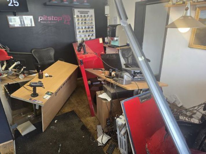 „Ætli ég hafi ekki flogið svona fjóra metra í stólnum áður en ég lenti út í horni,“ segir Jóhann oftast þekktur sem Jói í Pitstop. Hann þakkar fyrir að hafa ekki slasast alvarlega. „Ég er marinn og bólginn en það er allt í lagi. Þetta var rosalegt, ég flaug bara upp úr stólnum, sat þarna við gluggann þegar hann keyrði inn.“ „Ég var nýsestur, í tölvunni að ganga frá dekkjapöntunum og dóti og heyri þá þessi svakalegu læti, þar til ég stend allt í einu bara út í horni, það var ofn þarna á veggnum og hann braut hann í tvennt og henti honum á mig,“ segir Jói sem segir mildi að enginn hafi slasast alvarlega. Bílstjórinn er á tíræðisaldri og er til skoðunar á heilbrigðisstofnun með minniháttar áverka að sögn Jóa. Hann segist vongóður um að tryggingar muni dekka tjónið, sem ljóst er að sé mikið. „Tölvukerfin og skrifborðin, þetta muldist allt niður. Skjáirnir og allt saman, þannig þetta er mikil tjón. Þetta kemur í ljós,“ segir Jói sem var í óðaönn að gera við verkstæðið þegar Vísir náði af honum tali. Hann segir stefnt að því að opna verkstæðið aftur innan skamms. „Við opnum á eftir. Við erum að ganga frá þessu núna og stilla þessu öllu upp saman aftur.“ Eyðileggingin var töluverð eftir óhappið.