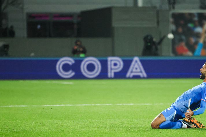 Tuttugu og sjö árum eftir jafnteflið fræga við heimsmeistara Frakka á Laugardalsvelli gerði íslenska karlalandsliðið í fótbolta annað jafntefli við Frakka á sama velli í kvöld. Lokatölur 2-2. Arnar Gunnlaugsson var í byrjunarliði Íslands í leiknum 5. september 1998 en í kvöld var hann á hliðarlínunni. Og hann sá íslenska liðið ná fræknum úrslitum gegn einu besta landsliði heims. Ísland var 1-0 yfir í hálfleik, þökk sé marki Guðlaugs Victors Pálssonar á 39. mínútu. Á ótrúlegum sjö mínútna kafla í seinni hálfleik litu svo þrjú mörk dagsins ljós. Christopher Nkunku jafnaði fyrir Frakka á 63. mínútu og fimm mínútum síðar kom Jean-Philippe Mateta þeim yfir, 1-2. En nánast í næstu sókn jöfnuðu Íslendingar. Þar var að verki Kristian Nökkvi Hlynsson eftir frábæra sókn íslenska liðsins. Þrátt fyrir stífa pressu Frakklands það sem eftir lifði leiks hélt Ísland út og troðfullur Laugardalsvöllurinn fagnaði íslensku strákunum vel og innilega þegar flautað var til leiksloka. Húh!vísir/anton Ísland er áfram í 3. sæti D-riðils undankeppni HM 2026 en nú með fjögur stig þegar liðið á tvo leiki eftir. Úkraína er þremur stigum á undan Íslandi en liðin mætast í Varsjá í lokaumferð riðilsins. Það verður að öllum líkindum hreinn úrslitaleikur um 2. sætið í riðlinum og þar af leiðandi sæti í umspili. Ef íslenska liðið spilar eins og það gerði í þessum tveimur leikjum í Laugardalnum - já, Úkraínuleikurinn var að stórum hluta góður - eru því allir vegir færir. Það er allavega eitthvað að gerjast eftir erfið ár. Og því ber að fagna. Svipuð uppskrift og í París Arnar gerði tvær breytingar á byrjunarliðinu. Daníel Tristan Guðjohnsen tók stöðu bróður síns, Andra Lucas, sem tók út leikbann og Logi Tómasson kom inn fyrir Jón Dag Þorsteinsson. Ísland spilaði ekki ósvipað og í fyrri leiknum gegn Frakklandi, með þriggja/fimm varna vörn án boltans en fjögurra manna vörn með boltann. Sterka leikmenn vantaði í franska liðið, ber þar helst að nefna Kylian Mbappé og Ousmané Dembélé, en engum datt í hug að vorkenna Didier Deschamps enda mannval Frakklands gríðarlegt. Sævar Atli Magnússon var í byrjunarliðinu en meiddist undir lok fyrri hálfleiks.vísir/anton Frakkar létu strax af sér og á 2. mínútu fékk Nkunku dauðafæri eftir hornspyrnu en Elías Rafn Ólafsson varði. Eftir að hafa verið 62 prósent með boltann gegn Úkraínu var allt annað uppi á teningnum í kvöld. Frakkar voru miklu meira með boltann og Íslendingar hörfuðu og vörðu miklum tíma aftarlega á vellinum. Íslenska liðinu gekk ágætlega að halda aftur af því franska sem var þó alltaf ógnandi. Matea, sem var í byrjunarliðinu í fyrsta sinn í landsleik, skaut framhjá á 21. mínútu. Forystunni náð Sóknir Íslands voru ekki margar en í einni þeirra sótti Albert aukaspyrnu úti við hornfánann vinstra megin. Hann tók spyrnuna, setti lágan bolta inn á hættusvæðið og hann barst á Guðlaug Victor sem teygði sig í boltann og kom honum yfir línuna. Annað mark Guðlaugs Victors í undankeppninni en hann skoraði einnig í stórsigrinum á Aserbaísjan í síðasta mánuði. Eftir nánast óaðfinnanlegan varnarleik var íslenska liðið stálheppið að fá ekki á sig jöfnunarmark í uppbótartíma fyrri hálfleiks. Þá fékk Michael Olise dauðafæri en Elías varði vel, boltinn hrökk til Mateta en Mikael Egill Ellertsson bjargaði á línu. Eftir að gengið hafði verið úr skugga um að Mikael Egill hefði ekki fengið boltann í höndina flautaði Orel Grinfeeld til hálfleiks. Guðlaugur Victor Pálsson er tveggja marka maður í þessari undankeppni.vísir/anton Kristian kom inn á fyrir Daníel Tristan í hálfleik. Í uppbótartíma fyrri hálfleiks hafði svo Brynjólfur Andersen Willumsson komið inn á fyrir Sævar Atla Magnússon. Frakkar héldu áfram að einoka boltann í seinni hálfleik og Íslendingar voru nær eingöngu í varnarhlutverki. En þar leið þeim bara býsna vel. Sverrir Ingi Ingason og Daníel Leó Grétarsson léku eina sína bestu leiki í landsliðstreyjunni og hreinsuðu frá í óteljandi skipti. Fyrir framan vörnina hlupu Skagamennirnir ungu Hákon Arnar Haraldsson og Ísak Bergmann Jóhannesson svo á við allavega þrjá. Slæmi kaflinn Það er þó erfitt að halda jafn sterku liði og Frakklandi algjörlega í skefjum og á 61. mínútu fékk Nkunku færi á fjærstöng eftir aukaspyrnu en hitti ekki markið. Nkunku var búinn að vara íslensku vörnina við og tveimur mínútum síðar jafnaði hann metin. Hann fékk boltann á vinstri kantinum, fór á hægri fótinn og skoraði með hárnákvæmu skoti í fjærhornið. Guðlaugur Victor var ragur í sínum varnarleik og aldrei þessu vant var engin hjálp í augsýn. Frakkar héldu áfram að hamra járnið meðan það var heitt. Á 68. mínútu sóttu gestirnir aftur upp vinstra megin, varamaðurinn Maghnes Akliouche fékk boltann og sendi hann þvert fyrir markið á Mateta sem skoraði af stuttu færi, sitt fyrsta landsliðsmark. Íslendingar fagna marki Kristians.vísir/anton En undrin eiga sér stað þegar maður á síst von á því og aðeins tveimur mínútum eftir markið hjá Mateta var staðan orðin jöfn, 2-2. Eftir laglegt spil íslenska liðsins sendi Ísak boltann inn fyrir vörn Frakka á Albert. Vinstra megin við hann var Kristian og Albert var meðvitaður um það. Hann renndi boltanum til hliðar á Kristian sem lagði boltann fyrir mig og afgreiddi færið svo af stakri yfirvegun og jafnaði. Þær tuttugu mínútur sem eftir voru af leiknum sóttu Frakkar. Auðvitað. En Íslendingar þéttu raðirnar og vörðust af miklum móð. Tíminn leið hægt eins og alltaf þegar maður vill að hann líði hratt en loks var hægt að anda léttar þegar Grinfeeld flautaði til leiksl