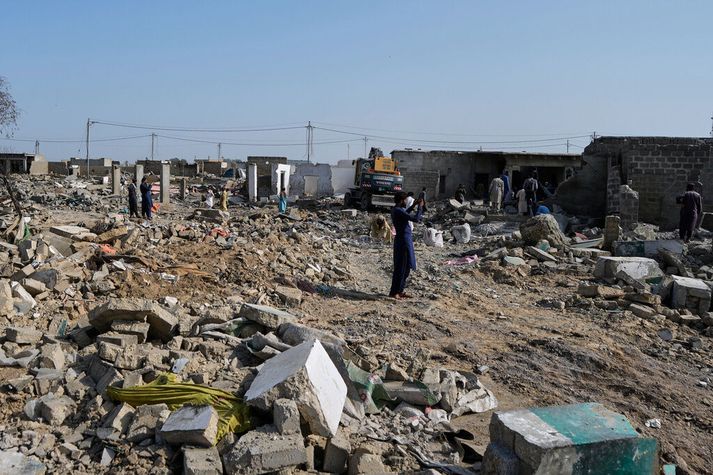 Samkomulagið náðist í kjölfar ákalls frá nágrannaríkjum á borð við Sádi-Arabíu og Katar. Óttuðust þau að átökin gætu ýtt enn frekar undir óstöðugleika á svæði þar sem hópar á borð við al-Kaída og samtökin sem kenna sig við íslamskt ríki reyna að ná fótfestu á ný. Pakistan sakar Afganistan um að hýsa vopnaða hópa en Talíbanar sem eru við stjórn í landinu vísa þessu á bug. Pakistan glímir við árásir vígamanna sem hefur fjölgað frá árinu 2021 þegar Talíbanar náðu völdum í Afganistan. Fólk gengur um húsarústir eftir niðurrif yfirvalda á mannvirkjum í útjaðri Karachi í Pakistan í dag.Ap/Fareed Khan AP-fréttaveitan greinir frá þessu en utanríkisráðuneyti Pakistans segir vopnahléið eiga að gilda í 48 klukkustundir. Fallist hafi verið á að gera hlé á átökum að beiðni yfirvalda í Afganistan. Skömmu síðar sagði Zabihullah Mujahid, aðaltalsmaður Talíbanastjórnarinnar, að vopnahléið væri tilkomið að „kröfu“ Pakistana. Í færslu hans á samfélagsmiðlum var ekkert minnst á 48 klukkustunda tímaramma. Fyrr í dag tilkynntu stjórnvöld í Pakistan að hermenn þeirra hefðu drepið tugi afganskra öryggissveita og vígamanna í bardögum í nótt. Margt á reiki Hjálparsamtökin Emergency NGO sem reka skurðlækningamiðstöð í Kabúl, höfuðborg Afganistan, sögðust hafa tekið við fimm látnum og fjörutíu særðum eftir sprengingar í höfuðborginni. Dejan Panic, landsstjóri samtakanna í Afganistan, sagði að fórnarlömbin hefðu verið með „sár eftir sprengjubrot, högg og brunasár.“ Í yfirlýsingu sagði hann að tíu væru í lífshættu. Óljóst er hvað olli sprengingunum, að sögn AP en Talíbanar staðfestu að sprenging hafi orðið í olíuflutningaskipi. Þá sögðu tveir pakistanskir fulltrúar að her þeirra hefði ráðist á felustað vígamanna. Maður sem særðist í átökum pakistanskra og afganskra hermanna á landamærasvæðinu fluttur til læknismeðferðar á sjúkrahús í Chaman, bæ við landamæri Pakistan.AP/H. Achakzai Mujahid, talsmaður Talíbana, hafði áður sagt að yfir hundrað hafi særst í árásum pakistanskra hermanna á Spin Boldak í suðurhluta Kandaharhéraðs og yfir tólf fallið. Afganskir hermenn hafi svarað skothríðinni og drepið nokkra pakistanska hermenn, að sögn Mujahid. Pakistan fullyrðir að það hafi varist „tilefnislausum“ árásum en neitar því að hafa beint árásum að óbreyttum borgurum. Á sama tíma greindu íbúar í pakistanska landamærabænum Chaman frá því að sprengjur hefðu fallið nálægt þorpum. Íbúar nálægt landamærunum væru að yfirgefa svæðið. Átök litað svæðið frá árinu 1979 Átök hafa verið viðvarandi við landamæri Pakistans frá árinu 1979, þegar það var víglínuríki í stríði sem Bandaríkin studdu gegn Sovétríkjunum í Afganistan. Árásirnar á tvíburaturnana í New York árið 2001 gerði ástandið á svæðinu enn eldfimara. „Eftir árásirnar þann 11. september skapaðist upplausnarástand á ættbálkasvæðum Pakistans þar sem hinir afgönsku Talíbanar, al-Kaída og aðrir hópar báðum megin við landamærin réðust á sveitir Atlandshafsbandalagsins og pakistanskar öryggissveitir,“ sagði Abdullah Khan, varnarmálasérfræðingur og framkvæmdastjóri Pakistan Institute for Conflict and Security Studies, við AP-fréttaveituna.
