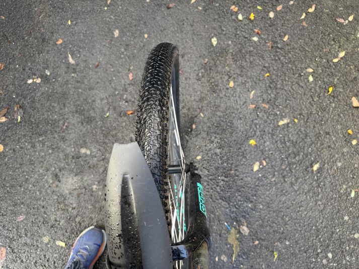 Framhjólið er beyglað eftir að bíllinn keyrði yfir það. Aðsend