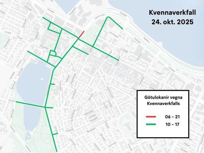 „Við verðum með öfluga löggæslu í miðborginni. Það verður fjölmörgum götum lokað,“ segir Árni Friðleifsson, aðstoðaryfirlögregluþjónn hjá lögreglunni á höfuðborgarsvæðinu. „Þetta er Sóleyjargata, Fríkirkjuvegur og Lækjargata að Geirsgötu verða lokaðar fyrir allri umferð. Það verða þarna þungar lokanir, svokallaðar öryggislokanir, og við búumst bara við fjölmenni og verðum með öfluga og sýnilega löggæslu í kringum þennan viðburð,“ segir Árni. Kortið hér að neðan sýnir þær götur sem verða lokaðar fyrir bílaumferð, flestar á milli klukkan tíu og fimm í dag, en lokun hefur þegar tekið gildi í hluta Lækjargötu við Arnarhól þar sem verður lokað til klukkan níu í kvöld, en þar fer fram mikil dagskrá í tilefni dagsins. Svona verða götulokanir í miðborginni í dag. Áhrif á leiðir Strætó en venjulegt fargjald Götulokanir munu einnig hafa áhrif á akstursleiðir Strætó í miðbænum sem vara muni fram á kvöld. Samkvæmt tilkynningu á vef Strætó verður breyting á ákveðnum akstursleiðum og munu leiðir 1, 2, 3, 6, 11, 12, 13 og 14 aka um hjáleiðir. Kort af hjáleiðum má finna á vef Strætó. Tíðni ferða verður eins og venjulega á föstudegi og almennt fargjald gildir í Strætó. Bent er á að hægt er að borga um borð í vagninum stakt fullorðinsfargjald með snertilausum greiðslum, kaupa miða í Klappinu, nota Klapp tíu eða Klapp kort. Þá kunni að verða takmörkuð þjónusta í þjónustuveri Strætó vegna kvennaverkfallsins. Hrútafýla í löggunni í dag Aðspurður segir Árni, í góðlátlegu gríni, að það verði mögulega „hrútafýla“ í lögreglunni í dag þar sem mannauðssvið lögreglunnar hafi gert ráðstafanir vegna þátttöku kvenna og kvára sem þar starfa og vilja taka þátt í deginum. „Við gerum ráðstafanir til að allar konur og kvár sem starfa hjá lögreglunni geti komist á þennan viðburð, þær sem vilja,“ segir Árni. Undirbúningur vegna viðburðarins hafi staðið yfir í nokkurn tíma í samstarfi við aðstandendur Kvennafrís. „Við erum búin að sitja fundi með viðburðarhaldara og svo innan húss hjá okkur eru áætlanir um öryggis- og löggæslu í kringum þennan viðburð. Þetta er bara eins og lítil Menningarnótt,“ segir Árni, en skipuleggjendur og Reykjavíkurborg búast við að á milli sextíu til áttatíu þúsund manns leggi leið sína í bæinn. „Við óskum bara öllum konum til hamingju með þennan dag,“ segir Árni.