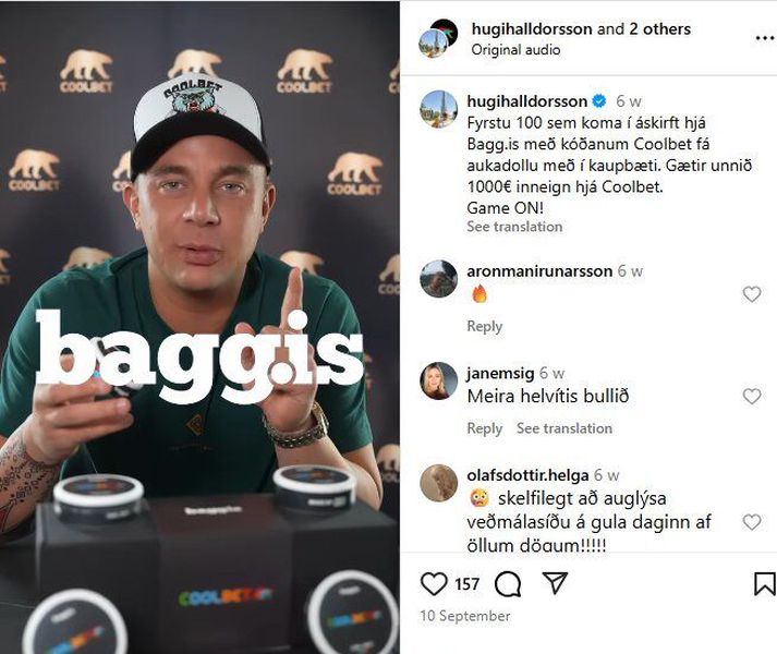 Stjórnarmaður KKÍ auglýsir ólöglega veðmálastarfsemi Valur Páll Eiríksson skrifar 24. október 2025 10:01 Hugi er stjórnarmaður hjá KKÍ og er í virku samstarfi við erlenda veðmálafyrirtækið Coolbet. Vísir/Vilhelm/Skjáskot Hugi Halldórsson, stjórnarmaður hjá KKÍ, hefur reglulega auglýst erlenda veðmálafyrirtækið Coolbet, bæði á samfélagsmiðlinum X sem og í hlaðvarpinu 70 mínútum. Framkvæmdastjóri sambandsins vildi lítið tjá sig um málið. Hugi var kjörinn í stjórn KKÍ á ársþingi sambandsins í apríl. Hann hefur auglýst Coolbet undanfarin ár og engin breyting orðið á við stjórnarsetu hans hjá sambandinu. Hugi rekur einnig tóbakssölufyrirtækið Bagg.is þar sem þeim fyrstu 100 sem tryggðu sér áskrift að tóbakssöluþjónustu hjá fyrirtækinu áttu möguleika á að vinna 1.000 evru inneign hjá Coolbet. Coolbet er áberandi í auglýsingu happdrættisleiks þess á samfélagsmiðlinum Instagram. Í auglýsingu Bagg.is má sjá nikótíndósir merktar fyrirtækinu og kóðinn „Coolbet“ veitir möguleika á vinningi. Hugi birti færsluna ásamt Sigurði Gísla Bond, sem sjá má í mynd, ásamt aðgangi Coolbet á miðlinum Instagram.Skjáskot/Instagram Umfang veðmálastarfsemi hérlendis hefur vaxið í umræðunni undanfarnar vikur. Auglýsing Kristófers Acox fyrir Coolbet kom ákveðinni umræðu af stað. Enn er til skoðunar hvort refsa eigi Kristófer fyrir auglýsinguna. Þar voru til veðmál á leiki í Bónus-deild karla, sem hann sjálfur spilar í fyrir Val. Leikmönnum er bannað að veðja á leiki í sinni deild í öllum íþróttum hér á landi en regluverk KKÍ hvað varðar auglýsingar leikmanna á veðmálum er öllu óskýrara. Hannes S. Jónsson, framkvæmdastjóri KKÍ, sagði við íþróttadeild í gær að mál Kristófers og önnur því lík kynnu að hafa neikvæð áhrif á ímynd hreyfingarinnar. KKÍ hafi þá borist ábendingar um önnur möguleg veðmálabrot eða álíka auglýsingar innan hreyfingarinnar eftir að mál Kristófers komst í fréttirnar. „Það hafa fleiri mál komið inn á borð til okkar eftir að þetta kom upp. Við erum að skoða þetta heilt yfir,“ sagði Hannes í Sportpakkanum í gær. Klippa: Ummæli framkvæmdastjóra KKÍ um veðmálaauglýsingar stjórnarmanns Samkvæmt heimildum íþróttadeildar hefur sambandinu til að mynda verið bent á auglýsingar stjórnarmanns þess, og þar vísað til Huga. Hannes vildi aftur á móti lítið tjá sig um auglýsingar stjórnarmanns þegar eftir því var leitað í viðtali sem hann veitti íþróttadeild í gær. „Það er erfitt fyrir mig sem framkvæmdastjóra sambandsins að tjá mig um þá sem eru í stjórn KKÍ. Það verður hver og einn að gera það upp við sjálfan sig hvað mönnum finnst um það,“ segir Hannes. Sjá má ummælin í spilaranum að ofan. KKÍ Fjárhættuspil Tengdar fréttir Pallborðið: Dómgreindarbrestur hjá CoolBet Íslendingar eyða tugum milljarða á ári á ólöglegum veðmálasíðum. Eigendur þeirra greiða enga skatta eða gjöld hér á landi vegna úreltra laga sem hefur ekki verið breytt síðan árið 2005. Dómsmálaráðherra vill breytingar en í hvaða átt skal fara? Leyfa eða banna? Málið var rætt í Pallborðinu á Vísi í dag. 23. október 2025 12:02 Kristófer fjarlægir sig frá Coolbet fjölskyldunni Kristófer Acox og Coolbet hafa fjarlægt allar færslur þar sem leikmaðurinn sést á samfélagsmiðlum veðmálasíðunnar. Körfuknattleiksdeild Vals vildi ekki tjá sig um málið. 10. október 2025 15:00 Auglýsir ólögleg veðmál: „Hryggir mig mjög að Kristófer fari þessa leið“ Körfuboltamaðurinn Kristófer Acox gæti átt yfir höfði sér sekt frá Körfuknattleikssambandi Íslands fyrir að auglýsa erlenda veðmálasíðu. Kristófer var andlit auglýsingar um veðmál á leiki í deildinni sem hann spilar sjálfur í; Bónus-deildinni. 10. október 2025 07:02 Mest lesið Stjórnarmaður KKÍ auglýsir ólöglega veðmálastarfsemi Körfubolti Mál Kristófers enn til skoðunar og fleiri komin á borð KKÍ Körfubolti Vildu fagna endalaust með Frey: „Þetta lið hættir aldrei að heilla“ Fótbolti Gaf öllum liðsfélögunum iPhone til að sleppa við að syngja Sport Handtökur í NBA: Lak upplýsingum um meiðsli James og bað um bita af kökunni Körfubolti Seldu bleika búninginn hennar Herrem fyrir meira en milljón Handbolti Benítez orðinn stjóri Sverris og sprengir launaskalann Fótbolti Ætla stelpurnar okkar með flugi eða á fleka á HM í Brasilíu? Fótbolti Mo Salah fjarlægði nafn Liverpool af miðlum sínum Enski boltinn Stjarna Manchester City hætti næstum því í fótbolta Enski boltinn Fleiri fréttir Nær fimmtán árum og ætlar með Ísland á HM Stjórnarmaður KKÍ auglýsir ólöglega veðmálastarfsemi Handtökur í NBA: Lak upplýsingum um meiðsli James og bað um bita af kökunni Mál Kristófers enn til skoðunar og fleiri komin á borð KKÍ Uppgjörið: Ármann-Keflavík 94-107 | Öruggt hjá Keflvíkingum Daníel: Ég fór í smá ævintýra starfsemi Uppgjörið: Þór Þ. - Valur 117-119 | Vals sigur eftir tvær framlengingar Uppgjörið: Njarðvík-Tindastóll 98-90 | Njarðvíkingar skelltu Stólunum Átti sumar engu öðru líkt „Ég held að bæði lið séu ekkert himinlifandi með sína frammistöðu“ Uppgjörið: Grindavík-KR 78-77 | Arnór Tristan með sigurkörfuna Þjálfari og leikmaður í NBA handteknir Sá eftirsóttasti treystir bara á pabba gamla Þrenna Maddie Sutton dugði ekki á Hlíðarenda Elvar tapaði á grátlegan hátt á móti gömlu félögunum Uppgjör: Keflavík - Haukar 94-84 | Keflvíkingar tóku Íslandsmeistarana Nablinn sparkaði upp hurðinni í byrjun þáttarins Pedersen með landsliðið til 2029 Breyta reglum eftir brellu Stjörnunnar Troðslur og Braveheart fagn í Kemi tilþrifum umferðarinnar Uppgjörið: Grinda