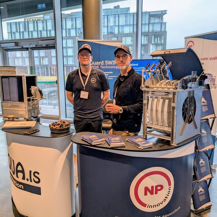 Nafnabreytingin frá Aqua.is yfir í NP Innovation endurspeglar alþjóðlega þróun innan greinarinnar. „Það er mikilvægt fyrir okkur að vera hluti af viðurkenndu alþjóðlegu tengslaneti sem deilir okkar sýn á nýsköpun og sjálfbærni,“ segir Magnús Þór Ásgeirsson, framkvæmdastjóri NP Innovation á Íslandi. „Þessi breyting sýnir bæði styrk og vilja til að mæta kröfum ört vaxandi markaðar.“ Sterkar rætur – alþjóðleg sýn Aqua.is hefur verið traust nafn í íslensku fiskeldi um árabil. Með viðamikla reynslu af krefjandi íslenskum aðstæðum hefur teymið djúpan skilning á vatnsgæðum, staðbundnum áskorunum og innleiðingu búnaðar, þekking sem áfram verður kjarninn í starfsemi NP Innovation á Íslandi að sögn Magnúsar. „Þekking og reynsla okkar gerir okkur kleift að innleiða kerfi sem virkilega henta hverju verkefni.“ Gunnar Helgason (t.v.), sölustjóri á Íslandi og Magnús Þór Ásgeirsson, framkvæmdastjóri NP Innovation á Íslandi, að sýna þrívíddarprentaðar smáútgáfur af vörum fyrirtækisins á sýningunni Lagarlíf 2025. Sem hluti af NP Innovation hefur íslenska teymið nú aðgang að sterkara baklandi, auk lausna sem hafa sannað gildi sitt í krefjandi aðstæðum á borð við tromlusíur, diskasíur og CO₂-loftara sem er lykilatriði í skilvirkum landeldiskerfum. „Fiskeldisiðnaðurinn er í mikilli uppsveiflu og við erum nú betur í stakk búin til að taka að okkur stærri og flóknari verkefni,“ segir Magnús. „En það að vera nálægt viðskiptavinum okkar, byggja upp traust sambönd, skilja þarfir þeirra og vera til staðar þegar á þarf að halda, verður ávallt forgangsmál.“ Spennandi framtíðarsýn Fyrir starfsfólk NP Innovation á Íslandi er þessi umbreyting bæði fagleg og persónuleg. Fram undan eru spennandi tímar og hvort sem samstarfsaðilar eru að skipuleggja ný eldisfyrirtæki eða betrumbæta starfandi rekstur, vill NP Innovation vera hluti af samtalinu og hjálpa til við að takast á við áskoranir og nýta tækifærin. „Þetta er ákveðinn áfangi fyrir okkur,“ segir Magnús. „Við erum að taka skref frá því að standa ein til þess að standa saman með teymi sem deilir okkar framtíðarsýn og hefur burði til að mæta kröfum iðnaðarins.“ Markmið fyrirtækisins á komandi árum er að vaxa í takt við markaðinn, efla tæknilega getu, styrkja teymið enn frekar og byggja upp öflugt samstarf. „Kerfi NP Innovation má líkja við lungu landeldisstöðva því þau halda vatninu hreinu og súrefnisríku svo fiskurinn dafni,“ bætir Magnús við.„Við ætlum að halda áfram að bjóða íslenskum viðskiptavinum lausnir sem eru skilvirkar, áreiðanlegar og hannaðar til að styðja við heilbrigðan vöxt og sjálfbæra framtíð.“