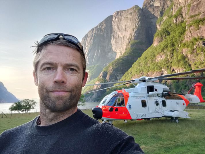 Litlu munaði að þyrlan þyrfti að nauðlenda Boði Logason skrifar 15. nóvember 2025 08:02 Eiríkur Ingi Jóhannsson komst einn lífs af þegar Hallgrímur SI-77 sökk við Noregsstrendur í janúar 2012. Slysið er rifjað upp í nýjustu Útkallsbók Óttars Sveinssonar. Útkall/Grafík Vísir Á tímabili leit út fyrir að þyrlan sem bjargaði Eiríki Inga Jóhannssyni í fárviðri í Noregshafi árið 2012 næði ekki til lands og yrði að nauðlenda í hamfarasjó vegna eldsneytisskorts. Ófyrirséðar aðstæður höfðu komið upp – gríðarlegt sjórok og saltaustur urðu til þess að mjög hægðist á vélinni þannig að hún eyddi mun meira eldsneyti en reiknað hafði verið með. Þetta kemur fram í bók Óttars Sveinssonar, Útkall - Ég er á lífi. „Ég vissi ekki að þetta hafi verið svona tæpt og sé það núna að björgunin var miklu umfangsmeiri en ég taldi fyrst. Ég vissi heldur ekki að þyrlan sem bjargaði mér varð að taka eldsneyti á olíuborskipi á leiðinni að slysstað og þeir komust í stórhættu þegar þeir lentu þar,“ er haft eftir Eiríki Inga í bókinni. Eiríkur Ingi viss ekki f,yrr en nýlega, að spilvírinn sem notaður var særðist þegar verið var að hífa hann og sigmanninn upp í þyrluna. Litlu munaði að vírinn slitnaði. Eiríkur Ingi fannst á lífi í sjónum tæpum fjórum klukkutímum eftir að fiskiskipið Hallgrímur SI-77 sökk þann 25. janúar fyrir tæplega fjórtán árum. Skipið hafði verið selt til Noregs og átti að sigla því þangað. Fjórir voru um borð. Þegar skipið var statt um 400 kílómetra frá Noregi komst sjór í stýrisvélarrúmið, það varð stjórnlaust og leki varð til þess að skipið sökk á skömmum tíma. Í bókinni Útkall - Ég er á lífi eru frásagnir Eiríks Inga, fjölskyldu hans og áhafna á tveimur þyrlum úr norska flughernum sem í raun lögðu líf sín í hættu við að bjarga honum og reyna að finna finna þrjá íslenska félaga hans. Þremenningarnir fórust allir og er bókin helguð minningu þeirra. Öldurnar á við fimm hæða hús Vebjørn Bjørstad, sem var 35 ára sigmaður, segist aldrei hafa séð annað eins sjólag þar sem öldurnar voru á við fimm til sex hæða hús. Þegar flogið var áleiðis á slysstað átti hann ekki von á að geta bjargað neinum á lífi: „Þegar við sáum loðnuskipið Herøyhav fannst mér það líta út fyrir að vera meira neðansjávar en ofan. Það var rosalegt að sjá hvernig öldurnar köstuðu skipinu til og frá. Ég virti senuna fyrir mér og hugsaði: Hvernig í ósköpunum á ég að komast í sjóinn til að bjarga einhverjum fyrst skip af þessari stærð lætur svona í hrikalegum öldunum? Og það sem meira var: Hvernig á að vera nokkur möguleiki á að finna fólk í þessu ofsaveðri og hvítfyssandi særoki?“ Sjóslysið við Noregsstrendur árið 2012 er rifjað upp í nýjustu bók Óttars Sveinssonar. Rætt er við Eirík Inga og þyrluáhöfnina sem bjargaði honum.Útkall Hugsaðu um börnin þín Eiríkur Eiríkur Ingi, sem var þrjátíu og fimm ára á þessum tíma, átti fjögur börn heima á Íslandi; Jónatan Jón, eins og hálfs árs, Vigdísi Sól fjögurra ára, Adam Valgeir fimm ára og Selku Sólbjörtu ellefu ára: „„Eiríkur, þú verður að hætta þessu. Þú verður að vera brattur! Hugsaðu um börnin þín. Þú verður að komast heim til barnanna þinna og konu,“ sagði ég upphátt við sjálfan mig, mér til hvatningar. Ég hélt áfram að hugsa, tala og berjast. Ég einfaldlega varð! Ég fór líka að syngja einhver lög þótt ég kynni ekki einn einasta texta. Ég söng bara eitthvað á meðan mig rak áfram.“ Selka Sól, ellefu ára dóttir Eiríks, var á fimleikaæfingu í Reykjavík: „Ég skynjaði að eitthvað skrýtið var í gangi. Eitthvað alvarlegt. Þjálfarinn minn sagði að ég mætti fara. Nú fór ég að verða áhyggjufull enda mjög óvenjulegt að mamma væri komin með öll systkini mín að sækja mig. Ég hljóp og náði í dótið mitt og fór til mömmu. Hún leiddi okkur út í bíl … það var eitthvað í gangi með pabba. Ég held að hún hafi sagt að hann væri týndur,“ er haft eftir Selku Sól í bókinni. Þú VERÐUR að ná þessari þyrlu Þegar Eiríkur Ingi sá aðra þyrluna koma yfir slysstað var hún í mörg hundruð metra fjarlægð frá honum: „Hugur minn var á fleygiferð og ákvörðunin um að synda áfram eða ekki togaðist á í mér. Það er allt of langt að þyrlunni. Ég á aldrei eftir að ná þessu. En svo gnísti ég tönnum og hrópaði: „Eiríkur, þú VERÐUR að ná þessari þyrlu!“ Og ég gargaði áfram: „Strákar, strákar. SJÁIÐ ÞIG MIG? Strákar, sjáið þið mig?“ Ég var staðráðinn í að ná sambandi við þá þótt ég vissi að þeir heyrðu ekki í mér.“ Í bókinni er einnig rætt við Olve Arnes flugstjóra sem kom auga á Eirík, eða réttara sagt á endurskinsborða á hettunni á gallanum hans. Eiríkur Ingi hafði þá barist fyrir lífi sínu í á fjórðu klukkustund og synt í um 20 til 25 mínútur í haugasjó. Þegar Vebjørn sigmaður ætlaði að fara út um dyrnar varð óhapp: „Þegar ég kom út úr þyrlunni og ætlaði að byrja að síga greip fárviðrið mig um leið. Þetta var versta veður sem ég hafði sigið í og nú gerðist svolítið sem ég hafði aldrei lent í áður. Ég fór ekki niður heldur hreif vindurinn mig aftur með þyrlunni og utan í hana. Um leið hafði Johnny spilmaður stungið höfðinu út úr vélinni til að fylgjast með mér en þá festist vírinn í hjálminum hans. Ég missti jafnvægið...,“ er haft eftir Vebjørn í bókinni. Þyrluflugstjórinn Olve Arnes segist aldrei hafa lent í eins miklu óveðri og þennan örlagaríka dag. Það telst kraftaverk að þyrlan hafi náð til lands - spaðarnir útataðir í salti og lítið eldsneyti eft