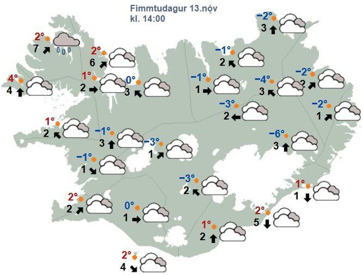 Á vef Veðurstofunnar segir að á vestanverðu landinu geti rigning ofan á frosin jörð valdið fljúgandi hálku á stöku stað. Hiti verður um eða undir frostmarki, en allt að fimm stigum vestast á landinu. Á morgun verður suðlæg átt 3-8 m/s, en suðvestan 8-13 norðantil eftir hádegi. Skýjað, sums staðar dálítil riging eða slydda og hiti 1 til 6 stig vestanlands, en yfirleitt bjart með vægufrosti austantil. Spákort fyrir klukkan 14 í dag.Veðurstofan Veðurhorfur á landinu næstu daga Á föstudag: Suðlæg átt 3-8 m/s, en suðvestan 8-15 norðantil síðdegis. Skýjað á vesturhelmingi landins, sums staðar smásúld og hiti 0 til 5 stig. Yfirleitt bjart og vægt frost austanlands. Á laugardag: Minnkandi vestanátt, 5-10 m/s síðdegis. Skýjað að mestu og lengst af þurrt um landið vestan- og norðanvert. Bjartviðri í öðrum landshlutum. Hiti 0 til 5 stig, en um eða undir frostmarki austantil. Frystir víða um kvöldið. Á sunnudag og mánudag: Breytileg átt 3-8 og dálítil rigning, slydda eða snjókoma, en yfirleitt úrkomulaust á Norður- og Austurlandi. Hiti um eða yfir frostmarki, en frost að 10 stigum í innsveitum fyrir norðan og austan. Á þriðjudag: Norðlæg átt og kólnandi veður. Él norðan- og norðaustanlands, en þurrt sunnan- og vestantil. Á miðvikudag: Útlit fyrir suðvestlæga átt. Skýjað og lengst af þurrt, en yfirleitt bjart sunnan- og austanlands. Talsvert frost austantil, en nálægt frostmarki vestanlands.