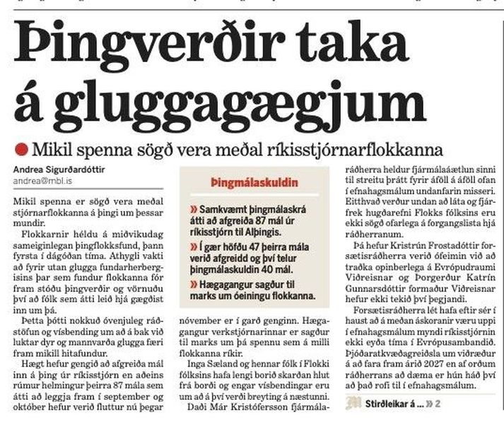 Hádegismóri hefur miklar áhyggjur af því að ekki ríki nógu mikil samstaða milli stjórnarflokkanna og sendi fulltrúa sinn til að gægjast inn um glugga Alþingis þar sem þingflokkar þeirra áttu reglulegan sameiginlegan fund til að fá þær áhyggjur sínar staðfestar. Eftir að þingverðir höfðu stuggað við Gluggagjægi hélt hann þegar til Hádegisfjalla og hóf að rita dómadags lýsingu sína á ástandinu á stjórnarheimilinu. „Gremjan er orðin mikil og uppsöfnuð innan þingflokks Flokks fólksins, sem bar skarðan hlut frá borði á síðasta þingi. Nær öll hans mál og þau pólitískt mikilvægustu fyrir flokkinn voru sett til hliðar á síðasta þingi,“ sagði Gluggagægir sem var svo miður sín fyrir hönd réttlætismála flokksins að hann gleymdi alveg sex vikna málþófsblaðri bestu vina Hádegismóra á Alþingi. Gluggagægir kenndi aftur á móti forseta Alþingis um allar tafirnar og þar með að hluta til um „gríðarlegt sundurlyndi í stjórnarliðinu.“ En Gluggagægir hafði varla sleppt orðinu í óútskýringum sínum þegar Alþingi samþykkti tvenn lagafrumvörp Ingu Sæland félags- og húsnæðismálaráðherra sem hafa verið meðal helstu baráttumála Flokks fólksins allt frá því hann fékk fyrst kjörna fulltrúa á Alþingi árið 2017. Samningur Sameinuðu þjóðanna um réttindi fatlaðs fólks og breytingar á lögum um fjöleignarhús eru orðin að lögum. Mikilvægt réttindamál fatlaðs fólks Samningur SÞ tryggir jöfn mannréttindi fatlaðs fólks á öllum sviðum á við aðra íbúa landsins og bætir réttarstöðu þess til mikilla muna. Löggilding samningsins felur í sér lagalega viðurkenningu á því að öll mannréttindi og grundvallarfrelsi eru algild, ódeilanleg, innbyrðis háð og samtvinnuð og áréttar nauðsyn þess að tryggja að fatlað fólk njóti þeirra að fullu án mismununar. Sjálfstæðir, Framsæknir og Þykjustumiðju vinir Hádegismóra fundu þessu frumvarpi allt til foráttu á vorþingi og héldu áfram að vinna gegn málinu nú á haustþingi. Mannréttindi fatlaðs fólks væru ekkert annað en óútfylltur tékki á sveitarfélögin. Þau sjálfstæðu og framsæknu gerðu sig hins vegar heilög í framan á síðustu metrunum þegar ljóst var að samningurinn yrði að lögum og sögðust að sjálfsögðu styðja þetta góða mál og greiddu því atkvæði sitt. Þykjustumiðjan lengst til hægri í salnum stóð hins vegar hálfpartinn við samvisku sína og sat hjá í fússi við atkvæðagreiðsluna. Allar fimmtíu lagagreinar samnings SÞ fela meira og minna í sér markmið fyrir hið opinbera í mannréttinda- og réttaröryggismálum fatlaðs fólks. Á þeim tæplega tuttugu árum sem liðin eru frá því íslensk stjórnvöld undirrituðu samninginn og tæplega tíu árum frá því Íslendingar staðfestu samninginn, hafa stjórnvöld í raun tekið mið af honum við ýmsa lagasetningu og bragarbót á gildandi fjölmörgum lögum. Hæst bera auðvitað lögin um notendastýrða persónulega aðstoð (NPA) frá árinu 2018 sem hafa tryggt fjölmörgum sem lifa með fötlun nauðsynlega þjónustu. Lögin miða að því að tryggja rétt fatlaðs fólks til menntunar, atvinnuþátttöku, húsnæðis og almennrar þátttöku í samfélaginu og jafnrar stöðu almennt. Þá er eitt mikilvægasta atriði samningsins að hann tryggir réttarstöðu fatlaðs fólks fyrir dómstólum. Það er rétt að nú eru um 400 fatlaðir einstaklingar víðs vegar um land á biðlista eftir sértæku húsnæði. Ekki er ólíklegt að það muni kosta sveitarfélögin um 14 milljarða króna að útvega öllu þessu fólki viðeigandi húsnæði. En þetta lá fyrir löngu áður en Alþingi færði samning Sameinuðu þjóðanna um réttindi fatlaðs fólks í lög. Ríkisstjórnin mun að sjálfsögðu halda áfram uppbyggilegum viðræðum við sveitarfélögin um þessi mál og önnur sem snúa að réttindum og aðstæðum fatlaðs fólks í landinu. Gæludýrahald í fjöleignarhúsum Flokkur fólksins hefur lengi barist fyrir því að eigendur hunda og katta væru ekki fyrirfram útilokaðir frá því að kaupa eða flytja inn í leiguíbúðir í fjöleignarhúsum. Með nýsamþykktum lögum um fjöleignarhús er afnumin sú regla í fyrri lögum að tveir þriðju íbúa í fjöleignarhúsi eða stigagangi þurfi að heimila íbúa í húsinu að halda hund eða kött í íbúð sinni. Þessi regla þrengdi mjög eignarrétt fólks sem á hunda eða ketti og útilokaði það nánast frá kaupum á húsnæði í fjölbýli. Í nýju lögunum er engu að síður tryggt að húsfélög geta brugðist við skapi hundar og kettir íbúum skaða eða ama og eigandi dýrs hefur ekki brugðist við umkvörtunum vegna þess. „Ef hundur eða köttur veldur íbúum fjöleignarhúss verulegum ama, ónæði eða truflun og eigandi dýrsins ræður ekki bót þar á þrátt fyrir áminningar húsfélags getur húsfélagið með samþykki 2/3 hluta eigenda, bæði miðað við fjölda og eignarhluta, bannað viðkomandi hunda- eða kattahald og gert eigandanum að fjarlægja dýrið úr húsinu. Hið sama gildir brjóti eigandi dýrs verulega eða ítrekað gegn skyldum sínum þrátt fyrir áminningar húsfélags,“ segir orðrétt í nýju lögunum. Það er hins vegar mikilvægt að eigendur hunda og katta eru ekki fyrir fram útilokaðir frá því að festa kaup á eða búa í fjöleignarhúsum þar sem íbúar deila sameiginlegum inngangi. Þetta er áríðandi réttarbót. Slegið á áhyggjur Hádegismóra Ég mælti einnig fyrir frumvarpi á miðvikudag um eingreiðslu fyrir jól til þeirra sem fá greiðslur frá almannatryggingum, eða svo kallaðan jólabónus. Slíkar greiðslur hafa verið samþykktar á síðustu stundu árlega á Alþingi allt frá því covid faraldurinn hófst árið 2020. Fyrir síðustu jól var útlit fyrir a