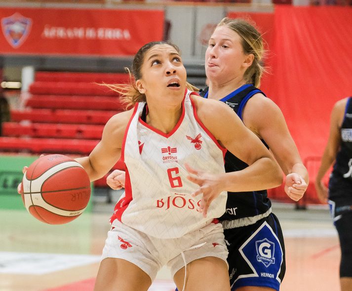 Valur lagði Grindavík að velli, 87-80, eftir framlengdan leik liðanna í áttundu umferð Bónus-deildar kvenna í körfubolta í N1-höllinni að Hlíðarenda í kvöld. Valskonur hófu leikinn betur og voru komnar 13-4 yfir um miðjan fyrsta leikhluta. Reshawna Rosie Stone fór vel af stað í leiknum og skoraði átta af þessum 13 stigum. Þá tók Þorleifur Ólafsson, þjálfari Grindavíkur, leikhlé sem skilaði tilætluðum árangri og undir lok leikhlutans voru gestirnir búnir að minnka muninn í 15-14. Jenný Geirdal Kjartansdóttir sá svo til þess að Grindavík fór með 23-21 forystu inn í annan leikhluta með þriggja stiga körfu sinni á lokaandartökum fyrsta leikhluta. Jafnræði var með liðunum framan af öðrum leikhluta og Alyssa Marie Cerino jafnaði metin í 34-34 með þriggja stig körfu sinni um miðbik leikhlutans. Alyssa Marie Cerino skoraði fimm þriggja stiga körfur og alls 22 stig í leiknum. Vísir/Anton Brink Þegar liðin gengu til búningsherbergja í hálfleik var Grindavík 39-42 yfir. Reshawna Rosie Stone var stigahæst hjá Val í fyrri hálfleik með 14 stig og Alyssa Marie Cerino kom næst með 11 stig. Farhiya Abdi var hins vegar atkvæðamest hjá Grindavík með sín 13 stig. Liðin skiptust svo á að eiga góða kafla í þriðja leikhluta. Valur náði forystunni í fyrsta skipti síðan undir lok fyrsta leikhluta þegar tvær mínútur voru eftir af leikhlutanum. Heimkonur skoruðu þá fimm stig í röð og komust í 54-53. Grindavík átti hins vegar góðan lokasprett og var 54-62 yfir fyrir fjórða og síðasta leikhlutann. Grindavík var skrefinu á undan lungann úr fjórða leikhluta en þegar 1,08 mínúta var eftir af leiknum fékk Reshawna Rosie Stone þrjú vítaskot í stöðunni 67-70. Reshawna sýndi stáltaugar, setti öll vítin niður og jafnaði metin, 70-70. Liðin fengu bæði tækifæri til þess að tryggja sér sigurinn en ofan í vildi boltinn ekki og leikurinn þar af leiðandi framlengdur. Valskonur voru svo sterkari á svellinu í framlengingunni og fóru að lokum með 87-80 sigur af hólmi. Njarðvík er á toppi deildarinnar með 14 stig en Valur komst upp að hlið Grindavík í öðru til þriðja sæti deildarinnar með þessum sigri en liðin hafa hvort um sig 12 stig. Jamil Abiad, þjálfari Vals, fer yfir málin með leikmönnum sínum. Vísir/Anton Brink Jamil Abiad: Frábær karakter sem skilaði þessum sigri „Þetta var hörkuleikur tveggja góðra liða þar sem liðin skiptust á að vera með yfirhöndina. Sem betur fer áttum við síðasta áhlaupið og náðum að sigla sigrinum í höfn,“ sagði Jamil Abiad, þjálfari Vals, sáttur að leik loknum. „Við sýndum mikla þrautseigju og baráttu og það skilaði þessum sigri. Ég er mjög ánægður með hvað leikmenn mínir lögðu mikið í þennan leik og að við höfum haldið áfram þrátt fyrir að vera komnin í erfiða stöðu,“ sagði Jamil enn fremur. „Það var frábært að sjá varnarleikinn hjá okkur í fjórða leikhluta þar sem við fáum einungis á okkur átta stig sem er mjög vel af sér vikið. Við vorum hreyfanlegar og hjálpuðum hvor annarri vel við það að verjast þeim. Varnarleikurin skilaði þessum sigri,“ sagði hann stoltur. Þorleifur: Fengum á okkur klaufalegur villur undir lokin „Þetta var svolítið skrýtinn leikur. Mér fannst frammistaðan heilt yfir bara góð en ég er auðvitað fúll með að við höfum ekki náð að klára leikinn og ná í tvö stig. Við vorum í góðri stöðu en fengum á okkur klaufalegur villur undir lokin sem reyndust okkur dýrar,“ sagði Þorleifur Ólafsson, þjálfari Grindavíkur, eftir leikinn. „Við fengum færi til þess að hrifsa til okkar sigurinn og Abby skorar eða leggur upp í níu af hverjum tíu skiptum í þeim stöðum sem hún var að skapa í lokasókninni. Það gekk þvi miður ekki upp að þessu sinni. Það var líka vont að missa Isabellu Ósk en við misstum ógn undir körfunni eftir að hún fór meidd af velli,“ sagði Þorleifur þar að auki. „Ég er sáttur við margt í þessum leik og við erum komin með skýrar vinnureglur í liðið. Samskiptin eru líka jákvæð og talandinn í liðinu góður. Mér finnst liðið á góðum stað og þeir hlutir sem við erum að vinna í á æfingum að skila sér inn í leikina. Það er margt sem við getum tekið með okkur úr þessum leikí næstu verkefni þrátt fyrir tapið,“ sagði hann borubrattur. Þorleifur Ólafsson, þjálfari Grindavíkur, á hliðarlínunni að Hlíðarenda í kvöld. Vísir/Anton Brink Atvik leiksins Það hafði mikil áhrif á Grindavíkurliðið að missa Isabellu Ósk Sigurðardóttur meidda af velli um miðjan þriðja leikhluta. Isabella Ósk tekur mikið til sín undir körfunni og það vantaði framlag þaðan á ögurstundu í leiknum. Reshawna Rosie Stone sýndi svo úr hverju hún er gerð þegar hún kom leiknum í framlengingu með þremur vítaskotum þegar skammt var eftir af venjulegum leiktíma. Leikmenn Vals litu aldrei um öxl eftir það. Stjörnur og skúrkar Téð Reshawna Rosie Stone var stigahæst hjá Val með 28 stig. Alyssa Marie Cerino kom næst með 22 stig og Þóranna Kika Hodge-Carr skilaði 20 stigum á töfluna. Þóranna tók einnig 11 fráköst og gaf fjórar stoðsendingar. Ásta Júlía Grímsdóttir var sömuleiðis atkvæðamikil í frákastabaráttunni en hún tók 10 fráköst. Alyssa tók svo níu fráköst. Ellen Nystrom var atkvæðamest hjá Grindavík með 27 stig en henni gekk best við að brjóta á bak aftur þétta vörn Valsliðsins þegar leið á leikinn. Þóranna Kika Hodge-Carr skilaði góðu kvöldverki. Vísir/Anton Brink Dómarar leiksins Dómarar leiksins, þeir Bjarni Hlíðkvist Kristmarsson, Birgir Orn Hjörvarsson og Bergur Daði Ágústsson, slógu fáar sem engar feilnótur í fagmannlega útfærðum flautkonsert sínum. Dómaratríóið fær því