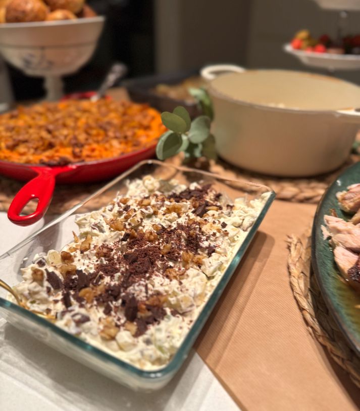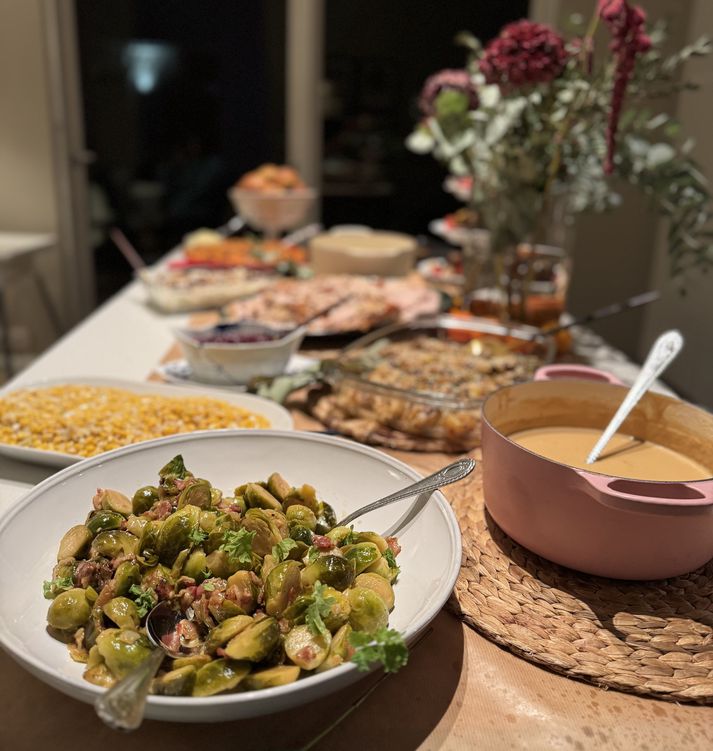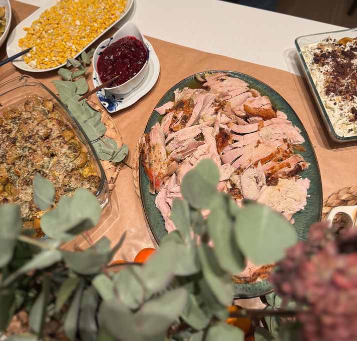 Eva Laufey Kjaran, dagskrárgerðarkona og markaðs- og upplifunarstjóri Hagkaups, er ein þeirra sem fagnar deginum ár hvert. Síðastliðinn sunnudag bauð hún stórfjölskyldunni í ljúffenga þakkargjörðarmáltíð og deilir nú uppskriftum að kræsingunum úr veislunni með lesendum Vísis. Kalkúnaskip með öllu tilheyrandi Eva Laufey bauð upp á smjörsprautað kalkúnaskip með öllu tilheyrandi. Hún setti kalkúnin í eldast mót ásamt smá soðnu vatni í botninn til að fá auka soð fyrir sósuna. „Ég einfaldaði líka matarboðið með því að kaupa tilbúna fyllingu sem var svakalega góð — það eina sem þarf að gera er að setja hana í fallegt form og baka í ofninum,“ segir Eva. Hráefni: 3 kg smjörsprautað kalkúnaskip Salt og pipar Smjör, magn eftir smekk 1 askja fylling með beikoni og eplum, tilbúin fylling. Aðferð: 1. Hitið ofn í 180°C.2. Setjið smá smjör eða olíu í botninn á fatinu og setjið kalkúnaskipið yfir. Kryddið með salti og pipar.3. Eldið kalkúnaskipið eftir leiðbeiningum á pakkanum en það er sirka 45 mínútur fyrir per kíló. Best er að nota kjarnhitamæli og þegar hann segir 70 gráður þá er kalkúnaskipið tilbúið.Það er mjög mikilvægt að leyfa kjötinu að hvíla og ég sker ekki í það fyrr en eftir 20-30 mínútur. Ljúffeng sósa Hráefni: 3 msk smjör 300 g sveppir, smátt skornir 500 ml kalkúnasoð (soðið vatn + kalkúnakraftur, magn eftir smekk) 300 ml rjómi Sósuþykkjari Salt og pipar Góð sulta Aðferð: 1. Smjörsteikið sveppi og kryddið til með salti og pipar.2. Hellið soðinu saman við og sjóðið niður, magnið af kraftinum fer eftir smekk. Gott að smakka sig til!3. Bætið rjómanum saman við og notið sósuþykkjara ef þið viljið þykkja sósuna. Það er einnig eftir smekk.4. Setjið smávegis af sultu til þess að fá smá sætu, ráð sem ég fékk frá tengdamömmu og ég hef alltaf gert síðan. Sætkartöflumús með kornflexmulningi Eva segist hafa kolfallið fyrir þessari dísætu og góðu sætkartöflumús þegar hún gerði innslag fyrir Ísland í dag fyrir nokkrum árum í tengslum við þakkargjörðarmáltíð, og hefur hún útbúið hana sjálf á hverju ári síðan. Hún segir músina vera fullkomna með kalkúninum og algjörlega ómissandi á veisluborðið. Hráefni: 5 stk sætar kartöflur 100 g sykur 1 ½ tsk lyftiduft ¼ tsk salt 3 egg 100 g smjör, brætt 1 tsk vanilludropar Kornflexmulningur (sjá uppskrift neðar) Aðferð: 1. Stingið göt á kartöflunar með gaffli. Setjið í 180°c heitan ofn í um klukkustund eða þar til þær eru orðnar linar. Skerið í tvennt og skafið kjötið úr þeim.2. Öllum hráefnum fyrir kartöflumúsina er hrært vel saman. Sett í eldfast mót og bakað í 20 mínútur og tekið út.3. Gerið kornflexmulninginn og setjið yfir kartöflumúsina og látið aftur inní ofn í 20 mínútur. Kornflex-karamella Hráefni: 3 msk smjör 50 g púðursykur 1 1/2 bolli kornflex, mulið Aðferð: 1.Bræðið smjörið og setjið púðursykurinn saman við.2. Bætið þá kornflexinu út í og hrærið vel. Trufflu Mac & Cheese Hráefni: 500 g makkarónur 3 msk smjör 3 msk hveiti 600 ml mjólk 200 ml rjómi 250 g cheddar, rifinn 100 g parmesan 1-2 tsk truffluolía, magn eftir smekk. Það má líka nota trufflumauk . Salt og pipar Aðferð: 1. Sjóðið makkarónur „al dente“.2. Bræðið smjör, hrærið hveiti saman við og hellið mjólk+rjóma út í.3. Bætið osti við og hrærið þar til bráðnað.4. Kryddið og bætið truffluolíu út í.5. Blandið saman við makkarónur og bakið í 180°C í 15 mín. Rósakál með beikoni og hvítvíni Hráefni: 800 g rósakál, skorið í tvennt 200 g beikon í bitum 1 laukur 100 ml hvítvín 3 msk smjör Salt og pipar Aðferð: 1. Skerið rósakál í tvennt og sjóðið í söltu vatni þar til mjúkt í gegn. Hellið vökvanum frá og þerrið.2. Steikið beikonið og laukinn þar til beikonið er stökkt og laukurinn mjúkur í gegn.3. Bætið rósakálinu út á pönnuna og hellið hvítvíni út á, sjóðið niður.4. Hellið rjómanum saman við og leyfið að malla í smá stund. Kryddið til með pipar. Trönuberjasósa Hráefni: 300 g fersk eða frosin trönuber 150 g sykur (ca. ¾ bolli) 150 ml appelsínusafi (ca. ⅔ bolli) Börkur af ½ appelsínu. ½ tsk kanill 1–2 msk vatn ef þarf Aðferð: 1. Settu trönuber, sykur, appelsínusafa og appelsínubörk í pott.2. Láttu malla við miðlungshita í 10–15 mín eða þar til berin springa og sósan þykknar.3. Bættu við örlitlu vatni ef hún verður of þykk.4. Leyfðu henni að kólna, hún þykknar enn meira þegar hún kólnar.