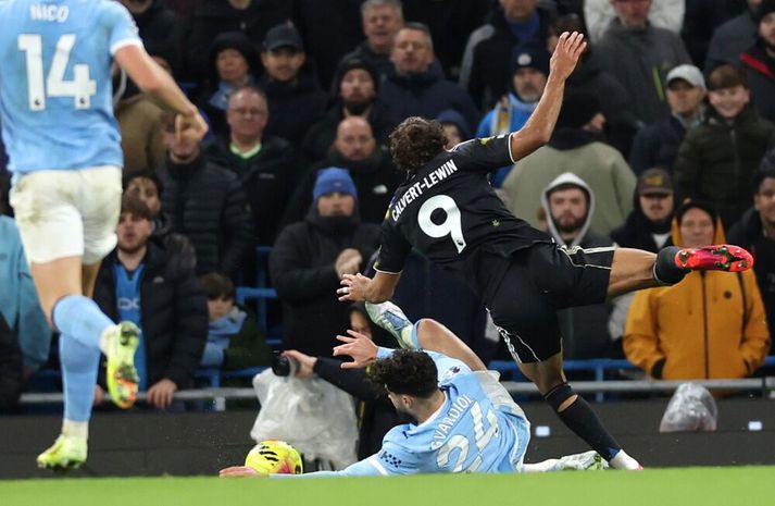 Eftir tvo tapleiki í röð á öllum keppnum komst Manchester City aftur á beinu brautinu á ensku úrvalsdeildinni í dag þegar liðið lagði Leeds 3-2. City-menn fengu sannkallaða draumabyrjun strax á 1. mínútu þegar Phil Foden skoraði með góðri afgreiðslu í teignum og Joško Gvardiol tvöfaldaði forskotið svo á 25. mínútu með mark upp úr hornspyrnu. Þannig stóðu leikar í hálfleik en gestirnir frá Leeds litu varla á markið í fyrri hálfleik. Þeir voru öllu hressari í seinni þar sem Dominic Calvert-Lewin minnkaði muninn í 2-1 á 49. mínútu. Hann var svo aftur á ferðinni um það bil 20 mínútum seinna þegar Gvardiol fór í glórulausa tæklingu í teignum og gaf Leeds vítaspyrnu. Nmecha fór á punktinn en Donnarumma sá við honum. Hann náði þó ekki að halda boltanum og Nmecha fylgdi skotinu vel eftir og jafnaði metinn. Josko Gvardiol fer í algjörlega galna tæklingu sem kostaði City næstum sigur.EPA/ADAM VAUGHAN Phil Foden reyndist svo hetja City þegar hann skoraði sigurmarkið í upphafi uppbótartíma sem var tíu mínútur. Heimamenn höfðu sótt af miklum þunga undir lokin og uppskáru mark að lokum þar sem Foden náði hnitmiðuðu skoti á rammann utan úr teignum. Boltinn fór í gegnum allan pakkann og Lucas Perri sá boltann seint og átti ekki möguleika á að verja. Lokatölur 3-2 og City aftur á sigurbraut. Liðið er í 2. sæti deildarinnar, fjórum stigum á eftir Arsenal og tveimur á undan Chelsea en þessi lið mætast í Lundúnarslag á morgun.