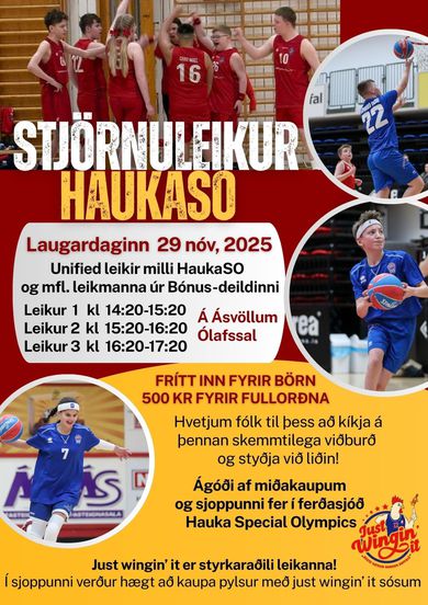 Þrír stjörnuleikir verða spilaðir og er frítt inn fyrir börn en fyrir litlar 500 krónur geta fullorðnir keypt miða en aðgangseyrir rennur óskiptur í ferðasjóð special olympics liðs Hauka sem er ætlað börnum með fatlanir. Körfuboltavika special olympics stendur nú yfir í Evrópu og Bára Fanney, þjálfari hjá Haukum, segir sína leikmenn mjög spennta fyrir laugardeginum þar sem að þau munu spila með og á móti leikmönnum úr efstu deild og landsliðum Íslands. „Þetta verður geggjuð upplifun. Þau hafa verið dugleg að mæta á leiki hjá meistaraflokkum og líka á landsleiki. Þau þekkja þessa leikmenn og því mikil spenna bæði fyrir því að spila á móti þeim en líka að vera með þeim í liði.“ Fann sig í körfuboltanum Edvard Þór Ingvarsson er einn þeirra leikmanna sem tekur þátt í stjörnuleikjunum þremur. Það er margt við körfuboltann hjá Haukum sem heillar hann. „Vinirnir sem þú færð með því. Þú getur hlupið, gert allt sem þú vilt, skotið á körfuna eins oft og þú getur. Það er alltaf gaman. Ég byrjaði að æfa þegar að ég fékk einhverfugreininguna þegar að ég var ellefu ára. Ég var bara að reyna finna íþrótt sem væri fyrir mig og þetta var í raun eini hópurinn sem hjálpaði mér að vera ég sjálfur.“ Einstaklingum mætt þar sem þeir eru Og góðu áhrifin sem körfuboltaiðkunin hefur á Edvard fara ekki fram hjá móður hans, Helgu Kristínu Olsen. „Edvard Þór er búinn að prófa ýmsar íþróttagreinar og maður er alltaf að reyna finna hvað hentar og passar sem og hvar áhugasviðið liggur. Hann byrjaði sem sagt í körfuboltanum hér hjá Haukum fyrir um sex og hálfu ári síðan og þetta svona smellpassaði. Þarna fann hann sig algjörlega. Það er náttúrulega svo rosalega mikilvægt fyrir alla að finna fyrir því að þeir séu góðir í einhverju. Hér er unnið frábært starf, mikil hvatning í gangi og einstaklingum er mætt þar sem að þeir eru. Svo er það félagslegi þátturinn sem skiptir okkur foreldrana gríðarlega miklu máli. Hann fær alveg útrás fyrir það hér í Haukunum.“ Hún segir stjörnuleiki dagsins ekki bara eftir að nýtast krökkunum hjá Haukum heldur einnig þeim stjörnum sem munu spila með og á móti þeim. „Þau eru með heilmikið keppnisskap hjá okkur og gríðarlegar framfarir sem hafa orðið hjá þeim undanfarin ár. Það er meiriháttar sem foreldri að taka eftir framförum, ekki bara hjá sínu eigin barni heldur hjá hans félögum. Ég held að þetta eigi líka eftir að gefa þeim leikmönnum sem eru að koma sem gestir til okkar heilmikið. Því þú færð ekki betri og skemmtilegri körfuboltamenn heldur en þessa.“ Samfélag sem er að stækka Margir leikmanna Hauka eru að fara spila á stórum velli, sérútbúnum treyjum og með alvöru umgjörð eins og sést í efstu deild í fyrsta skipti „Þessir krakkar mæta rosalega vel á æfingar,“ segir Bára þjálfari. „Þau eru áhugasöm, vilja læra körfubolta, bæta sig og keppnisskapið hjá þeim er mikið. Þeim finnst ótrúlega skemmtilegt að keppa.“ Einstakur hópur sem kemur að þjálfun hjá Haukum Special Olympics. Hingað til hefur lið Hauka þurft að fara erlendis til þess að keppa við önnur special olympics lið og er markmiðið með stjörnuleikjunum að safna í ferðasjóð fyrir liðið svo það geti keppt á fleiri mótum erlendis. En stutt gæti þó verið í að þau geti mætt svipuðum liðum hér á Íslandi því mikil gróska hefur verið í því starfi. „Það frábæra við þetta er að special olympics körfuboltasamfélagið hér á Íslandi er að stækka. Njarðvík byrjaði með lið núna í október, Vestri á Ísafirði hefur nú verið með starfandi lið í tvö ár og á Akureyri hafa verið körfuboltanámskeið og Fylkir býður upp á körfuboltaæfingar fyrir heyrnarskerta þar sem þjálfarinn notar táknmál. Svo er í boði hjólastólakörfubolti. Það er svo gaman að sjá þetta samfélag stækka og fleiri lið koma upp, við hlökkum bara til að fá að keppa á móti öðrum special olympics liðum hér á landi.“ Mun gefa allt í leikina Edvard er afar spenntur fyrir leikjum dagsins, hann býst við þó við erfiðum leikjum „Ég held að við munum tapa.“ En þið gefið allt í þetta? „Já, alltaf.“