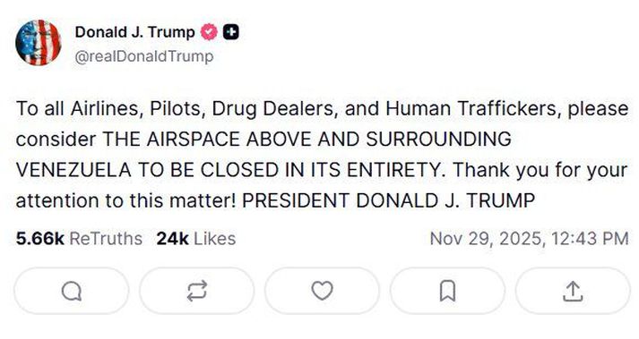 Í færslu á samfélagsmiðlinum sínum Truth Social skrifaði Donald Trump Bandaríkjaforseti að flugfélög, flugmenn, fíkniefnasmyglarar og mansalsfólk ætti að líta á lofthelgina yfir Venesúela sem lokaða. Engin útskýring á af hverju forðast ætti lofthelgi Venesúela fylgdu. Samkvæmt Reuters gátu hvorki samskiptafulltrúar Venesúela né fulltrúar Varnarmálaráðuneytis Bandaríkjanna veitt viðtöl. Undanfarna mánuði hefur bandaríski herinn ráðist 21 sinni á skip í Karabíhafinu sem þeir telja vera að flytja fíkniefni. Alls hafa 83 látist í árásunum. Bandaríski herinn hefur einnig aukið hernaðarleg umsvif sín á svæðinu. Þá heimilaði Trump CIA að ráðast í leynilegar aðgerðir í Venesúela og átti hann einnig að hafa sagt starfsmönnum hersins að fljótlega myndi herinn hefja aðgerðir í Venesúela til að stöðva meinta fíkniefnaframleiðendur. Í lok október átti forsetinn einnig að hafa gefið bandaríska hernum skipun um að hefja loftárásir í Venesúela á herstöðvar. Trump sakaði Nicolas Maduro, forseta Venesúela frá árinu 2013, um að heimila fíkniefnaframleiðslu í herstöðvunum. Maduro hefur verið ákærður af Bandaríkjamönnum fyrir fíkniefnasmygl og hryðjuverkastarfsemi og er hann sakaður um að stýra glæpasamtökum sem koma að því að smygla fíkniefnum til Bandaríkjanna.