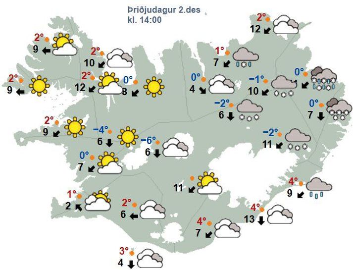 Bjartviðri suðvestantil en hvasst suðaustanlands Atli Ísleifsson skrifar 2. desember 2025 07:13 Hiti á landinu verður í kringum frostmark. Vísir/Vilhelm Djúpa lægðin sem hefur blásið hressilega frá hjá okkur síðustu daga stefnir nú á Skotland og er farinn að grynnast. Á vef Veðurstofunnar kemur fram að það verði norðaustlæg átt í dag, yfirleitt kaldi eða stinningskaldi en að verði hvassir vindstrengir á Suðausturlandi. Hiti verður um eða yfir frostmarki. „Slydda eða snjókoma norðaustan- og austanlands, jafnvel rigning á Austfjörðum, en stöku él norðvestantil og bjartviðri um landið suðvestanvert. Á morgun og á fimmtudag er útlit fyrir áframhaldandi norðaustanátt með éljum eða lítilsháttar snjókomu norðan- og austanlands, en lengst af þurru á Suður- og Vesturlandi. Hiti um eða undir frostmarki,“ segir í hugleiðingum veðurfræðings. Spákort fyrir klukkan 14.Veðurstofan Veðurhorfur á landinu næstu daga Á miðvikudag: Norðaustan 8-15 m/s, hvassast suðaustantil. Víða él, en bjart með köflum á Suður- og Vesturlandi. Hiti um eða undir frostmarki. Á fimmtudag og föstudag: Norðaustan 5-13 og snjókoma eða él um landið norðan- og austanvert. Hiti breytist lítið. Á laugardag: Norðaustanátt og lítilsháttar rigning eða slydda með köflum. Hiti um eða yfir frostmarki. Á sunnudag og mánudag: Útlit fyrir norðaustanátt með dálitlum skúrum eða éljum norðan- og austanlands. Veður Mest lesið Segir Pokrovsk geta orðið stökkpall lengra inn í Úkraínu Erlent Var að horfa á þátt í farsímanum á meðan hann ók Innlent Bjóða Rússum flotastöð við Rauðahafið Erlent Borgaði sig fyrir kirkjuna að breyta um merki Innlent Sagði hvern sem er hafa getað fyllt BMW-inn af kókaíni Innlent Þota til Egilsstaða í kvöld til að flytja veðurteppta Innlent Leitar bróður sem hún hefur aldrei hitt Innlent Trump sagður hafa sett Maduro afarkosti Erlent Tónhöfundar spyrja út í notkun gervigreindar Innlent Ræningjarnir hefðu aldrei sloppið á Íslandi Innlent Fleiri fréttir Bjartviðri suðvestantil en hvasst suðaustanlands Blæs hressilega af austri Stormur í kortunum Snjódýptin geti náð fjörutíu sentimetrum Gul viðvörun vegna snjókomu Snjókoma í kortunum Kuldinn bítur í kinnar landsmanna Slær í storm suðaustantil en höfuðborgarsvæðið í skjóli Allvíða él eða skúrir og flughált víða um land Hlýnar í veðri og gæti orðið flughált Vara við flughálku í fyrramálið Skúrir á víð og dreif og hiti að sex stigum Hefðbundin lægð með rigningu og allhvössum vindi Hvít jörð á höfuðborgarsvæðinu og víðar Frost og víða fallegt vetrarveður Víða vindasamt á landinu Töluvert bjartviðri í dag en sums staðar þokuloft Skýjað og dálítil él Skýjað og útkomulítið vestantil og þurrt fyrir austan Dálítil rigning eða slydda en lengst af þurrt sunnantil Víðast bjart veður en hvasst austast á landinu Gul viðvörun á Austfjörðum Norðaustanátt og strekkingur nokkuð víða Víða lítilsháttar rigning eða snjókoma „Hvorki dropi né snjókorn úr lofti eins langt og séð verður“ Hvassir vindstrengir með suðausturströndinni Hvassir vindstrengir og kraparegn með köflum Þurrt um vestanvert landið en dálítil úrkoma austantil Þungbúið austantil en annars þurrt og nokkuð bjart Skýjað með köflum og sums staðar úrkoma Sjá meira