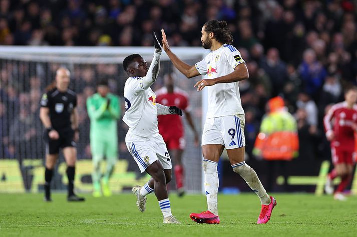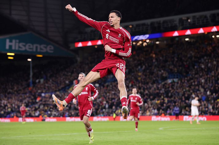 Leeds United og Liverpool skildu jöfn, 3-3, í stórskemmtilegum leik á Elland Road í ensku úrvalsdeildinni. Gestirnir glutruðu niður tveggja marka forystu og fengu á sig jöfnunarmark í blálokin. Arne Slot, knattspyrnustjóri Liverpool, gerði fjórar breytingar á liði sínu frá 1-1 jafntefli við Sunderland í miðri viku en hélt þó Mohamed Salah áfram á varamannabekknum, þriðja leikinn í röð. Leedsarar mættu fullir sjálfstrausts til leiks eftir sterkan sigur á Chelsea í miðri viku á sama velli en ekkert var skorað í fyrri hálfleik þrátt fyrir fína sénsa á báða bóga. Hugo Ekitiké var einn þeirra sem kom inn í lið Liverpool, fyrir Svíann Alexander Isak, en sá franski hafði ekki skorað í deildinni síðan í 2-1 sigri á Everton þann 20. september. Ekitiké skoraði fyrstu deildarmörkin síðan í september.Alex Livesey/Getty Images Hann fékk gefins mark frá varnarmanninum Joe Rodon sem átti misheppnaða sendingu í öftustu línu á 48. mínútu, beint á Ekitiké, sem geystist að marki og afgreiddi laglega með vinstri fæti í vinstra horn. Tveimur mínútum og átta sekúndum síðar skoraði Ekitiké öðru sinni eftir laglega fyrirgjöf Conors Bradley frá hægri og staðan 2-0 eftir 50 mínútna leik. Tuttugu mínútum síðar kastaði Ibrahima Konaté sér í glæfralega tæklingu innan teigs og Wilfried Gnonto féll við. Eftir skoðun á skjá benti Anthony Taylor, dómari á punktinn. Dominic Calvert-Lewin skoraði af punktinum og minnkaði muninn á 73. mínútu. Leedsarar gerðu eins og Liverpool og skoruðu tvö á þremur mínútum.Robbie Jay Barratt - AMA/Getty Images Það veitti Leedsurum kraft og aðeins tveimur mínútum síðar höfðu þeir jafnað þökk sé marki Antons Stach úr teignum. Leedsarar virtust ætla að hamra járnið áfram en gestirnir fundu kraft til að svara fyrir sig. Ungverjinn Dominik Szoboszlai veitti liðinu aftur forystuna eftir snarpa sókn fimm mínútum síðar. Útlit var fyrir að mark Szoboszlai dyggði fyrir sigri, en svo var ekki.Robbie Jay Barratt - AMA/Getty Images Á 96. mínútu jafnaði Ao Tanaka hins vegar fyrir Leedsara eftir hornspyrnu. Japaninn að skora annan leikinn í röð og allt ætlaði um koll að keyra á Elland Road. Enn voru þá þrjár mínútur eftir af uppgefnum uppbótartíma en hvorugu liðinu tókst að pota inn sigurmarki. 3-3 urðu því úrslit leiksins eftir hreint ótrúlegan síðari hálfleik. Leeds fær mikilvægt stig í 17. sæti deildarinnar, þar sem liðið er þremur stigum fyrir ofan fallsæti. Liverpool er með 23 stig í áttunda sæti deildarinnar, tveimur stigum frá Meistaradeildarsæti.