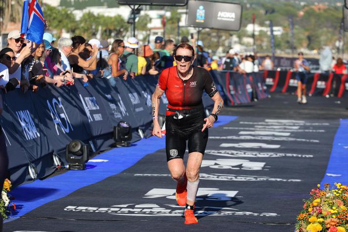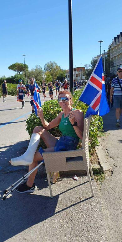 Það að þreita Iron Man keppni er ekki á færi allra, aflraun sem inniheldur langa kafla hjólandi syndandi og hlaupandi. Eftir að hafa klárað Landvættina hér heima með eiginmanni sínum Jóni Axelssyni sextíu ára gömul vann Kristín til verðlauna í sinni fyrstu keppni. „Þá er ég í raun ekkert búin að vera gera í tuttugu til þrjátíu ár annað en að vera í fjallgönguhópi þegar að ég var fimmtug. Þá klifum við alla helstu tinda landsins, mjög langar ferðir. Jón Gauti Jónsson fór fyrir þeim hópi. Flottur og góður félagsskapur. Og í dag þegar að ég er að fara hefja langar keppnir hugsa ég alltaf með sjálfri mér: „þú ert búin að gera þetta áður, þú ert búin að fara í tuttugu tíma fjallgöngu eða hvað sem er.“ Ég er með það haldreipi að hugsa að ég geti þetta alveg.“ Á palli í sinni fyrstu keppni Kristín bjó hins vegar að reynslu frá því að keppa í þríþraut. Hlaup, hjól og sund skipa mismunandi kafla í Iron man keppnum. Hér er Kristín á fleygiferð í einni slíkri keppni.Aðsend mynd „Ég varð að þjálfa allt upp. Ég átti ekki einu sinni hjól þegar að ég var sextíu ára og var að fara í Bláa lóns þrautina. Það var bara að kýla á þetta. Ég æfði mig bara áður en ég fór í vinnu og svo eftir vinnu. En það gekk rosalega vel. Þrautseigjan og seiglan í mér er þannig.“ Þú endar svo á verðlaunapalli í þinni fyrstu Iron Man keppni? „Já. Það var mjög sérstakt. Það var stór hópur héðan sem fór í þessa keppni og ég var sú eina sem endaði á verðlaunapalli. Ég gerði mér kannski ekki grein fyrir því þegar að ég var yngri, í mínum heimabæ á Ólafsvík, að yfirleitt var það staðan líka þá. Það kannski rifjaðist dálítið upp hjá mér eftir á. Að ég hefði upplifað þetta kannski sem unglingur líka. En þarna er ég komin út í heim og það var svolítið skrítið að það skyldi vera líka raunin þar.“ Samrýnd hjón á sömu vegferð Sjö keppnum síðar, þar af tveimur heimsmeistarakeppnum, er Kristín enn að bæta sig nú 66 ára gömul, þrautseigjan og seiglan frá heimabænum Ólafsvík til staðar og stefnan sett á keppnir númer átta og níu á næsta ári. „Það er ekkert smá. Ég sá þetta aldrei fyrir þegar að ég byrjaði. En eitt hefur bara leitt að öðru. Maðurinn minn sá um að skrá okkur í þessar keppnir og stundum fékk ég bara tölvupóst þar sem að var staðfesting á skráningu. Að ég væri að fara í þessa og hina keppnina. Sem var ágætt, ég hefði sjálf verið svo lengi að hugsa mig um.“ Þið gerið þetta saman. Er það lykillinn í þessu? „Algjörlega. En ég sleppi engum æfingum þó svo að hann, sem starfandi sjómaður, sé úti á sjó. Ég þurfti mjög mikið að vera ein að æfa fyrir heimsmeistarakeppnina í Nice í fyrra.“ Kristín og eiginmaður hennar Jón Axelsson hafa verið saman í Iron Man bröltinu. Oft veit Kristín ekki af því að hún sé á leiðinni í keppni fyrr en henni berst staðfesting á því í tölvupósti. Þá er Jón búinn að skrá þau í næstu keppni.Aðsend mynd Hvað gefur það þér að vera með honum í þessu brölti? „Það gefur mér bara allt. Við höfum um nóg að ræða, erum endalaust að skipuleggja. Það er ótrúlegur styrkur í því og dásamlegt að geta verið saman í þessu.“ Blóð bullaði upp úr skónum En svona vegferð er ekki bara dans á rósum. Það krefst mikils aga að æfa fyrir Iron Man keppnir, álagið er mikið og sólarhring fyrir keppni á Ítalíu árið 2022 lenti Kristín í krefjandi lífsreynslu. Kristín, á krefjandi tímapunkti, einblíndi á jákvæðan hugsunarhátt og af því að hún gat ekki sjálf keppt ákvað hún að styðja við bakið á samlöndum sínumAðsend mynd „Við komum út tímanlega. Ég var búin að æfa alveg rosalega vel. Þá er spennustigið í líkamanum orðið rosalega mikið og maður þarf að passa sig og fara í hvíld. En morguninn eftir að við komum út var boðið upp á brautarskoðun á hjóli. Hún var lengri en ég gerði ráð fyrir. Rétt áður en ég kem til baka að hótelinu kemur einhver smá slinkur á mig. Ég datt þó ekki en skil svo ekkert í því þegar ég sé blóð bulla upp úr skónum mínum. Ég rétt næ að komast að hótelinu þar sem fólkið var. Þau grípa mig bara þar. Þá var ég búin að missa svo mikið blóð. Þá hafði komið rifa, brot og tognun á vinstri fótinn. Það var bara komin það mikil spenna á húðinni að hún bara gefur sig. Ég enda bara upp á spítala í aðgerð og gifsi. Það var alveg rosalega erfitt. Að vera þarna á skurðarborðinu komin í þetta form á leiðinni að keppa. Það tók rosalega á.“ Allar þessar æfingar að baki. „Þetta fær mann til að hugsa. Þetta er ekki ókeypis. Maður er búin að leggja allt í þetta. Ég sneri þessu bara upp í að vera á hliðarlínunni að hvetja félagana með íslenska fánanum á stól fyrir utan hótelið. Hvatti þau áfram þar.“ Hún er með augun á Iron Man keppni á svipuðum slóðum á næsta ári en er nú þegar einnig búin að skrá sig til leiks í keppni, ásamt eiginmanni sínum, á Sardiníu á næsta ári. Þú átt óklárað verk á Ítalíu? „Mér finnst það. Þetta hefur blundað í mér og eftir heimsmeistarakeppnina í Marbella er ég farin að hugsa með mér að klára þetta. Þá verða níu Iron Man keppnir frá. Mig dreymdi ekki einu sinni um þann fjölda í byrjun. Alls ekki. En ég segi að það sé aldrei of seint að byrja. Mér finnst ég hafa efni á því að segja það við aðra. Kýldu bara á það, þetta er ekkert mál. En vissulega, þegar að maður er orðin þetta gamall þá stoppar ekki eitthvað. Það tekur alltaf lengri tíma að koma sér af stað aftur eftir því sem þú eldist. Það er svo dásamlegt að fin