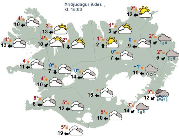 Veður Mest lesið Sextán ára martröð strætóbílstjóra í Reykjanesbæ Innlent Krúttlegi jólamarkaðurinn í félagsheimilinu endaði á borði lögreglu Innlent Gunnar lögmaður: „Ég er rosalega vinsæll á meðal Albananna“ Innlent Fjórir látnir á Tenerife eftir að alda sópaði þeim úr saltvatnslaug Erlent „Við munum berjast fyrir því til síðasta dags að fá pabba aftur“ Innlent Farþeginn enn í haldi lögreglu Innlent Langþráð verk í vegagerð bíða fram á næsta áratug Innlent Fólk farið að reykja kókaínið Innlent Tæplega tvö hundruð þúsund vottorð gefin út af læknum á ári Innlent Eldri kona stórslösuð og vitni gefa sig fram Innlent Fleiri fréttir Hvasst sunnantil og víða rigning eða slydda Hvassviðri syðst á landinu Smá rigning eða slydda víða Hiti gæti náð upp undir 10 gráður Rigning eða slydda sunnan- og vestanlands Bjart sunnan- og vestanlands en él norðan- og austantil Allhvasst syðst en hægari vindur annars staðar Bjartviðri suðvestantil en hvasst suðaustanlands Blæs hressilega af austri Stormur í kortunum Snjódýptin geti náð fjörutíu sentimetrum Gul viðvörun vegna snjókomu Snjókoma í kortunum Kuldinn bítur í kinnar landsmanna Slær í storm suðaustantil en höfuðborgarsvæðið í skjóli Allvíða él eða skúrir og flughált víða um land Hlýnar í veðri og gæti orðið flughált Vara við flughálku í fyrramálið Skúrir á víð og dreif og hiti að sex stigum Hefðbundin lægð með rigningu og allhvössum vindi Hvít jörð á höfuðborgarsvæðinu og víðar Frost og víða fallegt vetrarveður Víða vindasamt á landinu Töluvert bjartviðri í dag en sums staðar þokuloft Skýjað og dálítil él Skýjað og útkomulítið vestantil og þurrt fyrir austan Dálítil rigning eða slydda en lengst af þurrt sunnantil Víðast bjart veður en hvasst austast á landinu Gul viðvörun á Austfjörðum Norðaustanátt og strekkingur nokkuð víða Sjá meira