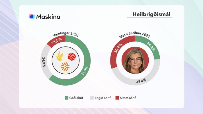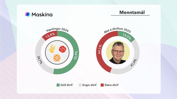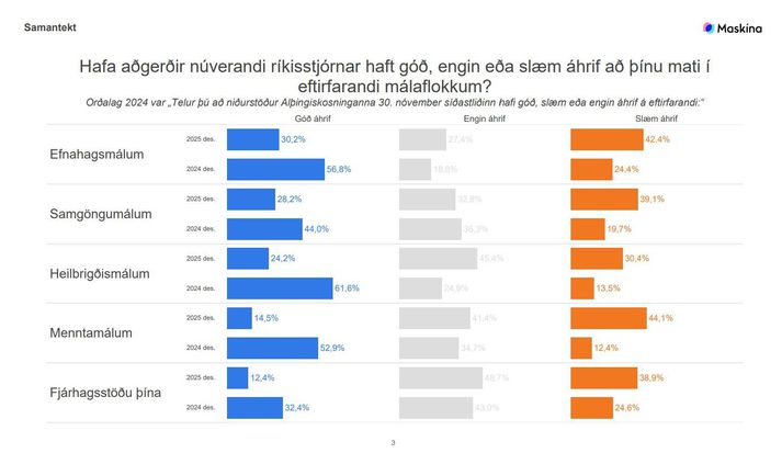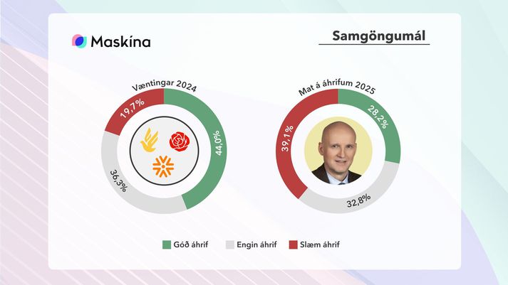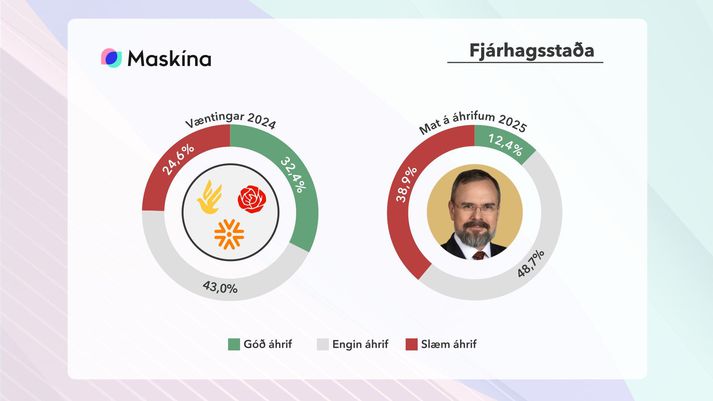Í desember í fyrra gerði Maskína könnun þar sem spurt var hvort svarendur teldu að niðurstöður Alþingiskosninganna þann 30. nóvember í fyrra myndu hafa góð, slæm eða engin áhrif í nokkrum málaflokkum. Í desember á þessu ári var aftur spurt hvort aðgerðir núverandi ríkisstjórnar hafi haft góð, slæm eða engin áhrif að mati svarenda. Séu niðurstöður kannananna tveggja bornar saman gefa svörin til kynna að ríkisstjórnin hafi ekki staðist væntingar meirihluta almennings í neinum af þeim málaflokkum sem spurt var um. Þess má geta að ekki er óalgengt að fylgi við ríkisstjórnarflokka dali frá kosningum og eftir því sem lýður á kjörtímabilið og vera kann að það sama eigi við um væntingar um árangur aðgerða. Fyrri könnunin fór fram dagana 12. til 19. desember 2024 og voru svarendur 2.062 talsins. Á þeim tíma í desember í fyrra áttu Samfylkingin, Viðreisn og Flokkur fólksins í stjórnarmyndunarviðræðum, og lá stjórnarsáttmáli og skipan ráðherraembætta fyrir örfáum dögum síðar. Síðari könnunin var tekin dagana 11. til 17. desember 2025 og svöruðu 2.032 einstaklingar könnuninni. Svona dreifðust svörin eftir málaflokkum þegar bornar eru saman kannanir Maskínu í ár og í fyrra. Maskína Minnstar sveiflur í samgöngumálum Í fyrra sögðust hátt í 57% svarenda hafa væntingar um að kosningaúrslitin hefðu góð áhrif í efnahagsmálum. Í ár segja hins vegar aðeins rúm 30% að aðgerðir ríkisstjórnarinnar hafi haft góð áhrif, og ríflega 40% segja þau hafa verið slæm. Í desember 2024 var spurt um væntingar svarenda í kjölfar kosninga og í ár var spurt hvort fólk teldi áhrif aðgerða ríkisstjórnarinnar góð, slæm eða engin.Vísir/Maskína Í samgöngumálum er munurinn minni milli ára en þó segjast fleiri telja að aðgerðir ríkisstjórnarinnar hafi haft verri áhrif en fólk hafði væntingar um í fyrra. Þannig sögðust 44% telja áhrifin verða góð í fyrra en 19,7% að þau yrðu slæm. Í ár segja þó fleiri að áhrifin hafi verið slæm, eða 39,1% á móti 28,2% sem telja áhrifin hafa verið góð. Um þriðjungur svarenda telur áhrifin í samgöngumálum þó engin, hvort sem litið er til væntinganna sem fólk hafði í fyrra eða hvernig svarendur meta árangur aðgerða ríkisstjórnarinnar í ár. Vel undir væntingum í heilbrigðis- og menntamálum Þegar litið er til heilbrigðismála segir aðeins tæpur fjórðungur svarenda að aðgerðir ríkisstjórnarinnar hafi haft góð áhrif, en í fyrra sögðust yfir 60% eiga von á að niðurstöður kosninga hefðu góð áhrif í heilbrigðismálum. Stærstur hluti svarenda segist þó telja að aðgerðir stjórnvalda hafi ekki haft nein áhrif eða rúm 45%. Væntingar til jákvæðra áhrifa í heilbrigðismálum voru umtalsvert meiri í fyrra en virðist hafa skilað sér í árangri aðgerða til þessa að mati svarenda.Vísir/Maskína Stökkið niður á við er einna mest þegar litið er til menntamála. Tæp 53% prósent sögðust í fyrra eiga von á að niðurstöður kosninga hefðu góð áhrif í menntamálum og aðeins um 12% töldu þau verða slæm. Í ár er þessu hins vegar öfugt farið þegar innan við 15% segja að aðgerðir núverandi ríkisstjórnar hafi haft góð áhrif í menntamálum en 44% prósent telja þau hafa verið slæm. Þá hefur hlutfall þeirra sem telja áhrifin engin vaxið eilítið á milli ára. Guðmundur Ingi Kristinsson tók við embætti mennta- og barnamálaráðherra af Ásthildi Lóu Þórhallsdóttur í mars.Vísir/Maskína Flestir telja áhrif á eigin fjárhagsstöðu vera engin Þegar spurt er um áhrif á fjárhagsstöðu svarenda sjálfra sögðust flestir telja að áhrifin séu engin, bæði hvað lítur að aðgerðum ríkisstjórnarinnar í ár og hvað varðar væntingarnar sem fólk hafði til hennar fyrir ári. Ólíkt því sem væntingar virðast hafa verið um eftir kosningarnar á síðasta ári, segist mikill minnihluti telja aðgerðir stjórnvalda hafa haft góð áhrif á fjárhagsstöðu sína, eða 12,4% en hátt í 40% telja áhrifin hafa verið slæm. Í fyrra töldu ríflega 32% að áhrifin yrðu góð en aðeins tæp 25% að þau yrðu slæm. Í þessum málaflokki eru þó hvað flestir sem telja áhrif aðgerða ríkisstjórnarinnar á eigin fjárhag hafa verið engin, eða tæp 49%, en í fyrra sögðust 43% ekki eiga von á neinum áhrifum af niðurstöðu kosninganna á eigin fjárhag. Það eru ýmsir þættir og málaflokkar þvert á ráðuneyti sem geta haft áhrif á fjárhagsstöðu almennings, en Daði Már Kristófersson er fjármála- og efnahagsráðherra.Vísir/Maskína