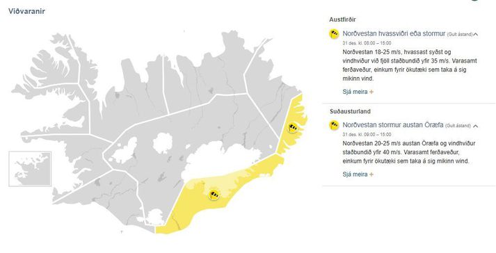 Gular viðvaranir taka gildi Sólrún Dögg Jósefsdóttir skrifar 31. desember 2025 07:35 Hvassast verður á Suðausturlandi og á Austfjörðum í dag. Vísir/Vilhelm Nú með morgninum léttir til um landið vestanvert og þar á eftir sunnantil, en fyrir norðan og austan með kvöldinu. Gular viðvaranir vegna vinds eru í gildi á Suðausturlandi, austan Öræfa og á sunnanverðum Austfjörðum þar til síðdegis. Þetta kemur fram í hugleiðingum veðurfræðings á vef Veðurstofunnar. Samkvæmt viðvaranakorti er spáð norðvestan 18-25 m/s og vindhviðum allt að 40 m/s á Suðausturlandi í dag. Samhliða því að léttir til og lægir, kólnar smá saman. Um miðnætti ætti samkvæmt spá veðurfræðings að vera mjög gott veður til að skjóta upp flugeldum þótt hægur vindur sums staðar geti verið það hægur að svifryk eða reykur sitji lengur yfir með tilheyrandi mengun. Norðlæg átt á mogun, nýársdag og dálítil él, en yfirleitt bjart sunnan heiða. Frost 0 til 10 stig, svalast í innsveitum fyrir norðan. Síðan er svipað veðurlag um helgina. Varasamt ferðaveður verður í dag, sérstaklega fyrir ökutæki sem taka á sig mikinn vind.Veðurstofa Íslands Veður Mest lesið „Margir sem því miður eru ekki jafn heppnir og ég“ Innlent Enn fleirum sagt upp hjá Árvakri Innlent „Við bara svolítið sitjum uppi með þetta“ Innlent Grunaður um stórfellda líkamsárás og frelsissviptingu Innlent Dótturdóttir JFK er látin Erlent Börn niður í leikskólaaldur um helmingur þeirra sem slasast Innlent Gular viðvaranir taka gildi Veður Eftirminnilegasta augnablikið á ferlinum: „Hann sat á móti mér nokkuð rauður og þrútinn og hvæsti“ Innlent Árangur aðgerða ekki staðist væntingar almennings Innlent Þessir Íslendingar kvöddu á árinu 2025 Innlent Fleiri fréttir Gular viðvaranir taka gildi Hvessir þegar líður á daginn Spáin fyrir gamlárskvöld að teiknast upp Frystir norðaustantil í kvöld Væta vestantil eftir hádegi Kuldaskil á leið yfir landið Fyrstu þreifingar áramótaveðurspár Gefur lítið fyrir staðhæfingar um nýfallið hitamet Hitinn fór í 19,8 stig og desembermetið slegið Jólin verða rauð eftir allt saman Gengur í langvinnt hvassviðri seinni partinn Hiti geti mest náð átján stigum Vara við hættu á skriðuföllum og krapaflóðum Líklegt að hitamet verði slegið um jólin Appelsínugular og gular viðvaranir á aðfangadag Ákveðin suðaustanátt, milt og skúrir síðdegis Hiti að sjö stigum og mildast syðst Fer að lægja norðvestantil um hádegi Djúp lægð grefur um sig Gular viðvaranir vegna norðaustan hríðar Tíðindalítið veður en bætir í vind í kvöld Dálítil snjókoma norðantil en þurrt sunnan heiða Lægðin á undanhaldi Víða allhvass vindur og rigning Siggi stormur spáir rauðum jólum Hellidemba í kortunum og líkur á þrumum Stormur gengur yfir sunnan- og vestanvert landið Austan stormur og gular viðvaranir á morgun Hvassviðri eða stormur og gular viðvaranir Bæta við gulri viðvörun á Vestfjörðum og miðhálendi Sjá meira