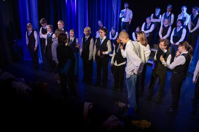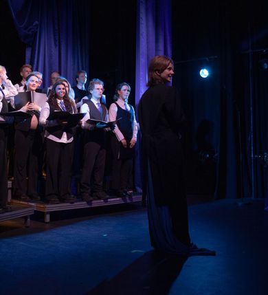 Katrín Lóa Hafsteinsdóttir er höfundur og leikstjóri Mergs sem var upprunalega útskriftarverkefni hennar af sviðshöfundarbraut Listaháskóla Íslands árið 2024. Hún fínpússaði verkið og vann það áfram með stærri kór í Tjarnarbíói þar sem það verður frumsýnt á föstudag. Fjöldi fólks kemur að sýningunni, kórinn samanstendur af 28 söngvurum auk tíu manna bak við tjöldin sem sjá um leikmynd, búninga og sviðssetningu. Blaðamaður heyrði hljóðið í Katrínu Lóu til að forvitnast út í þetta óvenjulega verk og andstæðurnar sem mynda það. „Ég var smeyk við að fara í þessa átt“ „Hugmyndin kemur út frá því að mig langaði að gera óhefðbundið kórverk. Ég hef alltaf verið mjög hrifin af kórforminu og vildi upphaflega gera kórverk með óhefðbundnum textum um tilfinningar fólks í játningaformi,“ segir Katrín Lóa um aðdragandann að verkinu. Þróun Mergs hófst í samsköpunarferli tíu manna leikhóps þar sem þau gerðu ýmiss konar skriflegar æfingar. Líkaminn er krafinn til mergjar í Mergi. „Við tókum eina umferð af æfingum þar sem við vorum að skrifa játningar og leyndarmál og þetta varð óvænt gróteskt. Ég man eftir augnablikinu þar sem ég var að lesa þessar ógeðslegu játningar og fann alveg: „Nei nei, ég vil ekki fara í þessa átt.“ En þetta var algjörlega móment þar sem hugmyndin tók yfir og ég þurfti að elta hana.“ Um var að ræða játningar tengdar mannslíkamanum og atvik sem fólk hafði lent í sem tengdust honum, til að mynda saga um gyllinæð. Vindar hvína um rass míns kinnar, hvíslað er um ilminn þann. „Ég var smeyk við að fara í þessa átt en það er samt alltaf spennandi staður til að vera á í sviðslistum. Ég var líka búin að vera að pæla í þessu íslenska kórformi því það er svo brjálæðislega háfleygt form og hvernig það tengist þjóðinni og menningararfinum,“ segir Katrín Lóa. Hér að neðan má heyra tvö tóndæmi úr verkinu. Viðbjóðurinn sem við kjósum að tala ekki um Kórformið er að sögn Katrínar afar háfleygt og lýsir hún því hvernig maður fyllist þjóðarstolti við að heyra íslensk verk á borð við „Heyr himna smiður“ eftir Kolbein Tumason eða „Lofsönginn“ eftir Matthías Jochumsson. „Það er líka gaman að pæla í því hvar kórar syngja, í hvaða aðstæðum og samhengi, það er oftast í kirkjum og við jarðarfarir. Mér fannst spennandi að smella þessu tvennu saman, þessum ótrúlega gróteska texta um líkamann og þessu brjálæðislega háfleyga kórformi,“ segir Katrín sem heillast almennt af andstæðum í listum. Kórstjórinn Katrín stýrir kórnum af miklum krafti.Kolbrún Hulda Geirsdóttir Það leynist meiri gróteska í fornum textunum en við gerum okkur grein fyrir. Útsetningar séu allar mjög fallegar og sönglögin vísi á einn eða annan hátt í kunnugleg lög, til að mynda „Ólaf Liljurós“ eða „Brennið þið vitar“. „Útsetningarnar eru samdar á fallegan og fágaðan hátt en textarnir eru allir uppfullir af viðbjóði sem við þekkjum samt öll. Þessi sammannlegi viðbjóður, sem við kjósum að tala ekki um, fær að vera þarna í sviðsljósinu,“ segir Katrín. Er þetta vítt svið? „Þetta er aðallega um líkamsvessa, ekki endilega tengt manneskjunni sem kynveru heldur sem veru sem þarf að glíma við alla þessa hluti sem við skömmumst okkur fyrir og viljum halda leyndum,“ segir Katrín. Innanvert var lærið rautt, lakið allt af blóði blautt. Eitt lag verksins er samið út frá sagnadansinum Ólafi Liljurós og formi hans nema textinn fjallar um baráttu söguhetjunnar við túrblóð. Melódía lagsins er öðruvísi en hrynjandinn og kórsvörin eins uppbyggð. „Við erum ekki að hæðast eða gera grín“ Ólíkt venjulegum kórtónleikum myndar söngurinn í kórverki gjarnan samhangandi heild. Það er raunin í Mergi sem Katrín lýsir sem ferðalagi. „Ég myndi segja að við tökum áhorfendur með í ákveðið ferðalag, bæði í söng og sviðshreyfingum, hvernig kórinn ferðast um sviðið. Það er stígandi í lögunum og við tökum fyrir alls konar ólíka gróteska staði,“ segir Katrín. Katrín segir krefjandi að stýra svona fjölmennu verki.Kolbrún Hulda Geirsdóttir „Við förum um víðan völl og drögum þetta saman undir lokin í hálfgerðu uppgjöri þar sem líkaminn verður að þessari fósturjörð,“ segir Katrín án þess að vilja spilla of miklu. Hið gróteska er spennandi en líka vandmeðfarið. Hvernig fetarðu milliveginn án þess að verða kjánalegur? „Ég held að fyrir mig hafi verið mjög mikilvægt að hafa fegurðina að leiðarljósi í öllu sköpunarferlinu, að hugsa um að endatakmarkið sé að setja upp eitthvað fallegt en nota hið ógeðslega til að komast þangað. Þá er líka búið að vera mikilvægt að halda í ákveðna einlægni. Við erum ekki að hæðast eða gera grín, þetta er alvara og okkur finnst þetta skipta máli,“ segir Katrín. Skilaboðin séu að þetta sé allt eitthvað sem fólk þurfi að díla við. Gróteskan sé mest spennandi þegar hún er samofin hinu fallega. Rennur gröftur eftir skoru, akra og dali fyllir hann. „Ég trúi því að ef við blöndum fegurðinni og hinu ógeðslega saman þá náum við að skapa rými þar sem við getum ekki alveg greint hluti í annað hvort eða. Það skapast eitthvað órætt, eitthvað millibilsástand,“ segir Katrín. Nýtt lag um barnsburð Katrín setti Merg fyrst á svið fyrir tveimur árum og hefur síðan fengið að vinna það áfram hefur verkið ekki tekið miklum stakkaskiptum. Þó hefur eitt lag bæst við og önnur verið betrumbætt. „Kjarninn er sá sami nema ég fékk Stefán Nordal til að hjálpa mér við að fínpússa útsetningarnar og gera þetta heilsteyptara,“ segir Katrín. Kórstj