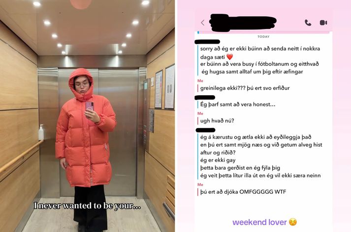 Ekki fyrsti fótboltamaður Binna: „Við getum alveg hist aftur og riðið“ Magnús Jochum Pálsson skrifar 20. janúar 2026 13:15 Binni Glee er að norðan og sló í gegn í raunveruleikaþáttunum Æði. Hann segist fá fjölmörg skilaboð frá opinberlega gagnkynhneigðum mönnum sem eru jafnvel í sambandi. Vísir/Vilhelm Raunveruleikastjarnan Brynjar Steinn Gylfason, betur þekktur sem Binni Glee, birti á TikTok í gær skjáskot af samskiptum sínum við ónefndan knattspyrnumann. Viðkomandi segist þar eiga kærustu og sé ekki samkynhneigður en vilji samt hitta Binna aftur til að sofa hjá honum. „Omg sá þetta trend og ég þurfti að vera með því þetta var galið og líka útaf umræðunni á beauty tips 😫,“ skrifar Binni við TikTok-færslu sem hann birti í gær. Fyrir skömmu birtust nafnlausar færslur á Beautytips þar sem konur ræddu samskipti kærasta sinna á Grindr við samkynhneigða menn. Færsla Brynjars inniheldur tvær myndir. Annars vegar má sjá hann í síðri bleikri úlpu í lyftu með textanum „I never wanted to be your...“ úr „Purple Rain“ eftir tónlistarmanninn Prins. Hins vegar má sjá skjáskot af Snapchat-samskiptum Binna við ónefndan mann þar sem textinn er botnaður með orðunum „weekend lover“. Myndirnar sem Binni birti á TikTok. Þar ræðir Binni við ónefndan knattspyrnumann sem hefur greinilega haldið framhjá kærustu sinni með Binna og er spenntur fyrir öðrum hittingi. „Sorry að ég er ekki búinn að senda neitt í nokkra daga sæti ❤️ er búinn að vera busy í fótbolanum og eittthvað[.] Ég hugsa samt alltaf um þig eftir æfingar,“ stendur í skilaboðum ónefnda mannsins. „Greinilega ekki??? þú ert svo erfiður,“ svarar Binni. „Ég þarf samt að vera honest,“ segir maðurinn þá. „Ugh hvað nú?“ spyr Binni. „Ég á kærustu og ætla ekki að eyðileggja það en þú er samt mjög næs og við getum alveg hist aftur og riðið? Ég er ekki gay[.] Þetta bara gerðist en ég fýla þig[.] Ég veit þetta lítur illa út en ég vil ekki særa neinn,“ skrifar knattspyrnumaðurinn. „Þú ert að djóka. OMFGGGG,G WTF,“ svarar Binni. Fjölmargir hafa síðan horft á myndbandið, rétt um 50 þúsund manns og fjöldi fólks skrifað ummæli við færsluna. Sjálfur sagðist Binni vona að viðkomandi myndi sjá færsluna. „Ef fólk vissi um skilaboðin sem ég er að fá“ Vísir heyrði í Brynjari sem sagði að skilaboðin væru ekki fölsuð heldur sönn og þau væru ekki einsdæmi. Fleiri en fimm fótboltamenn hefðu sent honum skilaboð og í öllum tilfellum hefðu þeir átt frumkvæðið að samskiptunum. Binni Glee starfar á Hrafnistu og er einn öflugasti áhrifavaldur landsins.Vísir/Hulda Margrét Binni sagðist sjálfur hafa séð sambærilegt trend á TikTok og ákveðið að vera með. Sjálfur taldi hann sig vera að fæla fótboltagaurana frá með færslunni en hún hefði haft þveröfug áhrif, fleiri fótboltagaurar hefðu addað honum á Snapchat í kjölfarið, sumir nafnlaust en aðrir ekki. „Margir sem halda að þetta sé djók eða ekki rétt, ef fólk bara vissi um skilaboðin sem ég er að fá, allir vinir minir vita af þessu, þetta er bara raunveruleikinn,“ sagði Binni í samtali við fréttastofu. Binni sagðist þó aldrei mundu afhjúpa nöfn fólks sem hann ætti í samskiptum við. „Ég myndi aldrei opinbera nöfn, það er ljótt. En það er samt líka ljótt hvað þeir eru að gera í samböndunum sínum,“ sagði hann. Hinsegin Fótbolti Æði Samfélagsmiðlar Mest lesið Móðirin hljóp frá þremur börnum og „fór í Kanann“ Lífið Valdi sér fylkingu í Beckham-deilunum Lífið Ekki fyrsti fótboltamaður Binna: „Við getum alveg hist aftur og riðið“ Lífið Opinberar erjur Beckham-fjölskyldunnar: „Ég vil ekki sættast við fjölskyldu mína“ Lífið Vesturbæingar blótuðu þorrann langt fram á nótt Lífið Ótrúlegur dagur Vignis: Lottóvinningur, 180 í pílu og sigur á Carlsen Lífið Eldri bróðir lagði línur að lífinu í New York Lífið Stjörnulífið: Áslaug náði ekki að tala Trump til Lífið „Ég hef aldrei séð dansandi poka“ Lífið Líkamsumhirða sem þróast í þráhyggju Menning Fleiri fréttir Ekki fyrsti fótboltamaður Binna: „Við getum alveg hist aftur og riðið“ Ótrúlegur dagur Vignis: Lottóvinningur, 180 í pílu og sigur á Carlsen Vesturbæingar blótuðu þorrann langt fram á nótt Valdi sér fylkingu í Beckham-deilunum Móðirin hljóp frá þremur börnum og „fór í Kanann“ „Ég hef aldrei séð dansandi poka“ Eldri bróðir lagði línur að lífinu í New York Opinberar erjur Beckham-fjölskyldunnar: „Ég vil ekki sættast við fjölskyldu mína“ Fagna tíu árum af ást Þekkja Kringlugestir borgarstjórann? Aron Mola ástfanginn í bíó Krútteyjurnar Ischia og Sikiley: Ástu leist ekki á einnar evru húsin Rybak snýr aftur en frægir bræður sniðganga Havana-heilkennið heldur áfram að kveikja samsæriskenningar Stjörnulífið: Áslaug náði ekki að tala Trump til „Kynlíf okkar hjóna hefur breyst mikið síðustu ár“ Greipur telur Trump hafa ruglast á Grænlandi og Íslandi „Ég er til í að gera allt svo ég þurfi ekki að grafa þriðja barnið mitt í viðbót“ Krakkatía vikunnar: Fjöll, friðarsúlan og geimurinn Auðunn Lúthersson selur austurbæjarperlu Skautafjör á Laugarvatni í dag Fréttatía vikunnar: Bruni, Grænland og handbolti Íþróttapar keypti einbýlishús í Hafnarfirði á 162 milljónir Svona heldur Rakel sér unglegri Gugga í gúmmíbát og Patrekur Jaime í eina sæng „Átti ekki efni á Icelandair til Tene en hér er ég“ „Við náðum að nýta hverja einustu stund með pabba“ „Þessu hef ég verið háður býsna lengi“ Eigandi lúxushótels selur miðbæjarperlu Lúxusferðaforstjóri og kaupmaður selja í gamla Vesturbænum Sjá meira