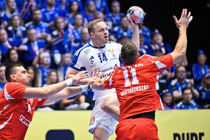 Uppgjörið: Ísland - Ungverjaland 24-23 | Ísland fer með tvö stig í millirðil Hjörtur Leó Guðjónsson skrifar 20. janúar 2026 21:22 Íslensku strákarnir höfðu ástæðu til að fagna. EPA/Johan Nilsson/TT SWEDEN OUT SWEDEN OUT Ísland vann frækinn eins marks sigur gegn Ungverjum í hreinum úrslitaleik um efsta sæti F-riðils á EM í handbolta í kvöld. Það var strax ljóst að Ungverjarnir myndu reynast íslensku strákunum erfiðir. Þungir leikmenn ungverska liðsins réðu nokkuð vel við snögga útilínu Íslands og tapaðir boltar og misnotuð dauðafæri virtust ætla að reynast íslenska liðinu dýrkeypt. Gísli Þorgeir fékk oft og tíðum að finna fyrir því.EPA/Johan Nilsson/TT SWEDEN OUT SWEDEN OUT Þá voru vandræði á ritaraborðinu ekki að gera neinum neinn greiða, en þau höfðu svo sem líklega sömu áhrif á bæði lið. Þrátt fyrir erfiðleika Íslands í sóknarleiknum í upphafi leiks stóð vörnin vel og Viktor Gísli Hallgrímsson stóð vaktina vel í markinu. Það varð til þess að Ungverjar náðu aldrei meira en tveggja marka forskoti í stöðunni 4-6. Viktor Gísli var maður leiksins.EPA/Johan Nilsson SWEDEN OUT Íslenska liðið fann hins vegar taktinn betur eftir það og skoraði þrjú mörk í röð og kom Íslandi í forystu þegar um stundarfjórðungur var liðinn af leiknum. Líkt og Ungverjar náði íslenska liðið þó ekki meira en tveggja marka forystu, sem Ungverjar voru nokkuð fljótir að þurrka út. Ísland fékk tækifæri til að ná tveggja marka forystu á ný undir lok fyrri hálfleiks en sirkusmark Óðins var dæmt af áður en Ungverjar nýttu sína síðustu sókn og jöfnuðu metin í 14-14 áður en tíminn rann út. Síðari hálfleikur byrjaði vel fyrir íslenska liðið þar sem Viktor Gísli varð í fyrstu sókn Ungverja áður en Orri Freyr Þorkelsson skoraði á hinum endanum. Orri Freyr Þorkelsson átti góða innkomu.EPA/Johan Nilsson/TT SWEDEN OUT SWEDEN OUT Stuttu síðar fékk Ýmir Örn Gíslason hins vegar að líta beint rautt spjald fyrir að fara í andlit andstæðings og hann tók því ekki meiri þátt í leiknum. Elvar Örn Jónsson virtist einnig vera að glíma við einhver meiðsli eftir fyrri hálfleikinn og kom heldur ekki meira við sögu og því voru báðir þristarnir úr byrjunarliðinu frá. Sóknarleikur Íslands var heldur stirður næstu mínútur og til að mynda kom kafli þar sem íslensku strákarnir skoruðu ekki mark í um átta mínútur. Á hinum endanum var Viktor Gísli Hallgrímsson þó heldur betur betri en enginn og varði hvert skotið á fætur öðru sem reyndist íslenska liðinu vægast sagt vel. Líkt og í fyrri hálfleik fann íslenska liðið betri takt og náði upp tveggja marka forskoti. Það forskot lifði þó ekki lengi og Ungverjar jöfnuðu á ný. Svona gekk þetta lengst af og hvorugu liðinu tókst að hrista hitt af sér. Ómar Ingi Magnússon sækir að marki Ungverja.EPA/Johan Nilsson/TT SWEDEN OUT SWEDEN OUT Viggó Kristjánsson kom Íslandi aftur í tveggja marka forystu með marki úr vítakasti þegar rétt rúm mínúta var til leiksloka og kom liðinu skrefi nær sigrinum áður en Viktor Gísli varði í markinu á hinum endanum. Íslensku strákarnir nýttu sér allar þær sekúndur sem þeir gátu í sinni síðustu sókn. Ekki tókst liðinu að koma boltanum í netið, en íslensku strákarnir gerðu nóg. Þeir átu sekúndur af klukkunni og Ungverjar höfðu aðeins tíma til að skora eitt mark í viðbót. Niðurstaðan varð að lokum frækinn eins marks sigur gegn Ungverjum, 24-23, og tryggði sér þar með efsta sæti F-riðils og tvö stig inn í milliriðil. Landslið karla í handbolta EM karla í handbolta 2026