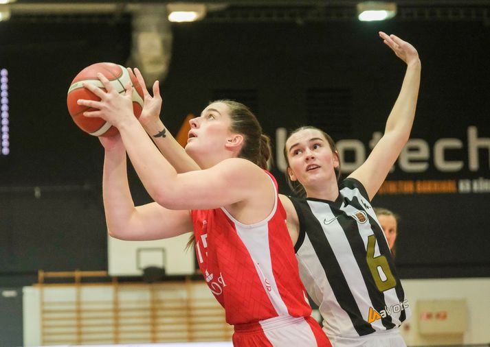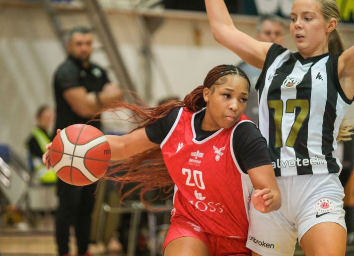 Valur fór með 66-77 sigur af hólmi þegar liðið sótti KR heim á Meistaravelli í Vesturbæinn í Reykjavíkurslag í 15. umferð Bónus-deildar kvenna í körfubolta í kvöld. Fyrir leikinn var KR í þriðja sæti deildarinnar með 20 stig og Valur sæti neðar með 18 stig. Valur jafnaði þar af leiðandi KR að stigum með þessum sigri. KR hafði betur í fyrri umferð deildarinnar á Hlíðarenda, 93-100, og Valur komst því upp fyrir KR með sigrinum. Toppbarátta deildarinnar er vægast sagt hnífjöfn en Grindavík, Haukar, Njarðvík, Valur og KR hafa öll 20 stig í fyrsta til fimmta sæti. Valur var skrefinu á undan í jöfnun fyrstaa leikhluta. Valur byggði hægt og rólega upp forskot í leikhlutanum. Reshawna Rosie Stone kláraði leikhlutann með því að setja niður þriggja stiga körfu og Valur fór með átta stiga forystu inn í annan leikhluta. Valskonur héldu áfram að bæta við forskot sitt hægt og bítandi í upphafi annars leikhluta og voru komnar 11 stigum yfir, 19-33 þegar leikhlutinn var hálfnaður. Dagbjört Dögg Karlsdóttir setti þá niður þrist og Valskonur í fínum málum. Valur fór síðan með 14 stiga forystu inn í búningsklefann hálfleik. Dagbjört Dögg Karlsdóttir ræðst hér að körfu KR og Jiselle Thomas er til varnar. Vísir/Anton Brink Valur hélt svo áfram frá því sem frá var horfið í byrjun þriðja leiklhuta. Reshawna Rosie Stone skoraði þar tvær þriggja stiga körfur með skömmu millibili og kom Val 18 stigum yfir, 30-48. Valur leiddi með 16 stigum yfir þegar við erum að fara inn í fjórða og síðasta leikhlutann. KR-ingar náðu hins vegar að velgja Val undir uggum með góðum spretti sínum undir lok fjórða leikhluta. Rebekka Rut Steingrímsdóttir setti muninn niður í sjö stig, 60-67, þegar rúmar tvær mínútur voru eftir af leiknum. Valur var aftur á móti sterkari á svellinu á lokamínútunum og niðurstaðan 11 stiga sigur Vals. Daníel Andri Haraldsson, þjálfari KR, var ekki par sáttur við dómara leiksins. Vísir/Anton Brink Daníel Andri: Frákastabaráttan varð okkur að falli „Við urðum því miður undir í frákastabaráttunni að þessu sinni og það var okkur að falli. Þær fengu of margar seinni tilraunir til þess að skora og því fór sem fór,“ sagði Daníel Andri Halldórsson, þjálfari KR, að leik loknum. „Það hjálpaði okkur heldur ekki að dómararnir áttu ekki sitt besta kvöld. Valur er með líkamlega sterkt lið og það er erfitt að eiga við þær þegar þær við fáum ekki eðlileg köll fyrir ólöglegar hindranir, tog og slátt. Ég held að tveir af þremur dómurum leiksins hafi dæmt fyrri leik liðanna og þar var það sama uppi á teningnun, Ég fékk svo ekki skýringar á köllunum þeirra þegar ég leitaði eftir því sem er leitt,“ sagði Daníel Andri enn fremur. Jamal Abiad: Varnarleikurinn skilaði þessum sigri „Við náðum að herða vörnina og bæta okkur í baráttunni undir körfunni undir lok leiksins en það var því miður of seint. Það er einnig vont að hafa tapað niður forystunni í innbyrðisviðureignum liðanna. Við munum hins vegar halda áfram að berjast fyrir stigum í síðustu þremur leikjum deildarinnar og freista þess að enda eins ofarlega og mögulegt,“ sagði hann um framhaldið. „Við spiluðum fantagóða vörn í nánast 40 mínútur og það var lykillinn að þessum sigri. Við náðum góðri forystu fljótlega og það var þétt vörn sem lagði grunninn að því. Þær náðu góðu áhlaupi undir lokin en sem betur fer stóðumst við það og sigldum mikilvægum sigri í höfn.,“ sagði Jamal Abiad, þjálfari Vals, eftir leik. „Þetta er mjög jöfn deild á þessu tímabili og allir leikir eru erfiðir. Baráttan á toppnum er gríðarlega jöfn og hver sigur mjög dýrmætur. Við erum mjög glaðar með þennan sigur og höldum núna áfram að reyna að safna stigum í komandi leikjum,“ sagði Jamal þar að auki. „Það eru þrír leikir eftir í deildarkeppninni og við ætlum okkur að enda í í efri helmingi deildarinnar. Til þess að svo verði þurfum við að leggja jafn mikið í varnarleikinn og við gerðum í kvöld og gefa allt í leikina,“ sagði hann um komandi verkefni Valsliðsins. Jamal Abiad, þjálfari Vals, var sáttur við varnarleik lærimeyja sinna. Vísir/Anton Brink Atvik leiksins Þegar Valskonur lentu í vandræðum í þessum leik sá Reshawna Rosie Stone um að klippa þær úr snörunni. Stone skoraði 28 stig í þessum leik og nokkrar körfur komu úr nánast vonlausum færum. Frábær leikur hjá Reshawna Rosie Stone. Reshawna Rosie Stone smeygir sér framhjá Rebekku Rut Steingrímsdóttur. Vísir/Anton Brink Stjörnur og skúrkar Áðurnefnd Reshawna Rosie Stone var stigahæst á vellinum með 28 stig en Dagbjört Dögg Karlsdóttir fann einnig fjölina sína í Vesturbænum og skilaði 20 stigum á töfluna. Ásta Júlía Grímsdóttir og Þóranna Kika Hodge-Carr lögðu svo 12 stig í púkkinn hjá gestunum en þess utan reif Ásta Júlía niður 13 fráköst og Þóranna Kika átta. Ásta Júlía Grímsdóttir var öflug undir körfunni fyrir Valsliðið. Vísir/Anton Brink Eve Braslis skoraði mest fyrir KR, 17 stig, en Molly Kaiser fylgdi fast á hæla hennar með sín 14 stig. Kristrún Ríkey Ólafsdóttir og Jiselle Thomas settu niður 11 stig hvor. Dómarar leiksins Dómarar leiksins, þeir Kristinn Óskarsson, Ingi Björn Jónsson og Bjarni Rúnar Lárusson höfðu fín tök á þessum leik og fá af þeim sökum sjö í einkunn fyrir kvöldverk sitt. Dómarar leiksins fengu að heyra það úr stúkunni og þjálfari KR vandaði þeim ekki kveðjuna að leik loknum. Vísir/Anton Brink Stemming og umgjörð Vel var mætt á þennan slag Reykjavíkurstórveldanna og áhorfendur beggja liða létu vel í sér heyra. Full mikið af köllunum fóru í átt að fínum dómurum leiksins fyrir m