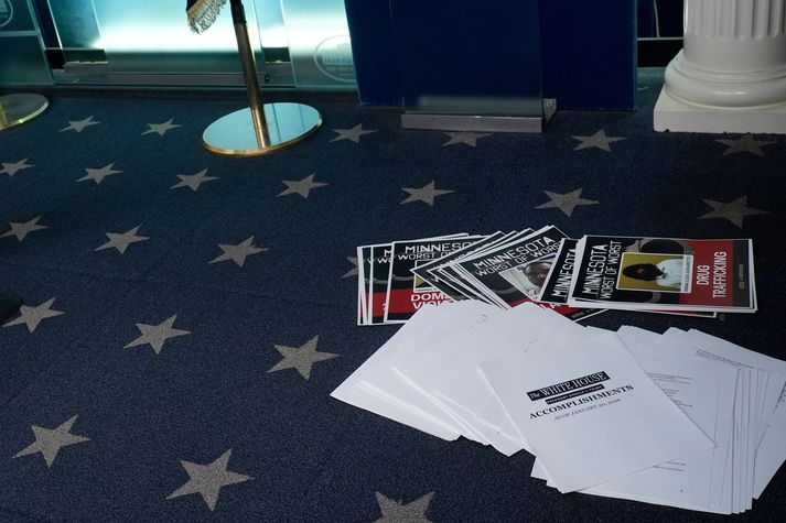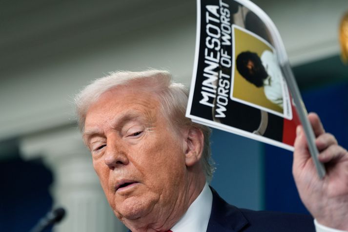 Donald Trump Bandaríkjaforseti mætti á blaðamannafund í Hvíta húsinu sem Karoline Leavitt, samskiptastjóri Hvíta hússins, heldur alla jafna. Leavitt sagði í færslu á samfélagsmiðlum að „einstakur gestur“ myndi mæta á blaðamannafundinn. Fundurinn, sem hófst tæpum klukkutíma of seint, var að mestu leyti um afrek forsetans á þessu fyrsta ári af öðru kjörtímabili hans. Í byrjun fundarins gaf Trump sér góðan tíma í að sýna myndir af fólki sem á að hafa verið handtekið af ICE í Minnesota-fylki. Undir ljósmyndunum stóð hvaða glæpi fólkið á myndum átti að hafa framið. Trump með eina slíka mynd í hendi.AP „Þau eru að handtaka morðingja og fíkniefnasala og helling af vondu fólki, og þetta eru þau sem hafa nýlega verið handtekin,“ sagði forsetinn. „Þetta eru allt glæpamenn, ólöglegir innflytjendur, fíkniefnasalar, andlega veikir, þeir eru morðingjar en þeir eru andlega veikir.“ Hann sagði að alls hefðu tíu þúsund hefðu verið handteknir af ICE í Minnesota-fylki og að allir væru glæpamenn. Minntist á morðið Mikil óánægjualda hefur riðið yfir Minnesota-fylki eftir að fulltrúi ICE skaut hina 37 ára gömlu Renee Good til bana. Myndband af atvikinu var birt á samfélagsmiðlum. Trump vísaði í morðið á blaðamannafundinum og viðurkenndi að stundum gerðu fulltrúar ICE mistök. „Þetta eru erfiðar aðstæður,“ sagði Trump, sem fullyrti einnig að yfir sextíu prósent fulltrúa ICE væru af spænskum ættum. Það sem Trump talaði þó mest um varðandi morðið var að foreldrar Good, sér í lagi faðir hennar, hefðu verið mikill stuðningsmaður hans. „Ég vona að hann sé það enn,“ sagði forsetinn. Afrekabókin lenti á gólfinu Trump mætti einnig með blaðabunka sem á stóð stórum stöfum: Afrek. Hann tók til að lesa upp hluti sem hann hefði afrekað, og sparaði ekki skotin á Joe Biden, fyrrverandi Bandaríkjaforseta. „Við erum með afrekabók sem við bjuggum til, þetta er blaðsíða eftir blaðsíðu. Ég gæti staðið hér og lesið í viku og ég væri ekki búinn.“ Meðal þeirra fjölda afreka sem forsetinn nefndi á fundinum var að ólöglegum flutningum yfir landamæri Bandaríkjanna hefði fækkað um 99,999 prósent. Í átta mánuði hefði enginn komið ólöglega til Bandaríkjanna. Blaðabunkarnir tveir sem forsetinn henti á gólfið þegar hann hafði lokið við að kynna þá.AP „Hellingur af fólki kemur löglega til landsins, það þarf að sanna að það elski landið og að það þurfi ekki á velferð að halda.“ Einnig hefði hagkerfi Bandaríkjanna aldrei verið betra, verðbólgan fari hjaðnandi og fjöldi bílaverksmiðja væru að rísa í landinu vegna tolla hans. „Þú munt komast að því“ Trump talaði í yfir klukkustund án þess að svara spurningum viðstaddra blaðamanna. Þegar blaðamennirnir fengu tækifæri til að spyrja sneru þó nokkrar spurningar að Grænlandi. „Þú munt komast að því,“ sagði hann aðspurður hversu langt hann væri tilbúinn að ganga til að ná stjórn á Grænlandi. Trump greip einnig tækifærið og talaði um Atlantshafsbandalagið. Hann telur sig hafa gert of mikið fyrir bandalagið og eytt of miklum pening í það. Þá segir hann að enginn hafi gert jafn mikið fyrir bandalagið og hann sjálfur. Hann segist þó þurfa á Atlantshafsbandalaginu að halda upp á öryggi Bandaríkjanna. Trump var einnig spurður hvort að hann vildi vera áfram í bandalaginu. „Ég hef átt svo gott samband við bandalagið, ég hef gert það svo miklu betra, miklu strekara. Ég er ekki sammála öllu því sem það hefur gert en það var gert áður en ég kom,“ svaraði forsetinn. Ísland eða Grænland? Þá minntist forsetinn á Ísland en deildar meiningar eru um hvort að hann hafi ætlað að segja Grænlandi en mismælt sig. Ísland bar á góma þegar Trump var spurður út í viðbrögð sín við fríverslunarsamningi ESB. „Við höfum aldrei verið ríkari og það er tollum og réttri notkun þeirra að þakka. Við höfum aldrei verið öruggari. Sem dæmi myndu Íslendingar án tollanna ekki einu sinni vera að ræða það við okkur. Við sjáum hvað gerist,“ sagði Trump.
