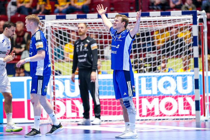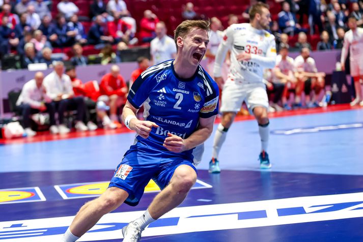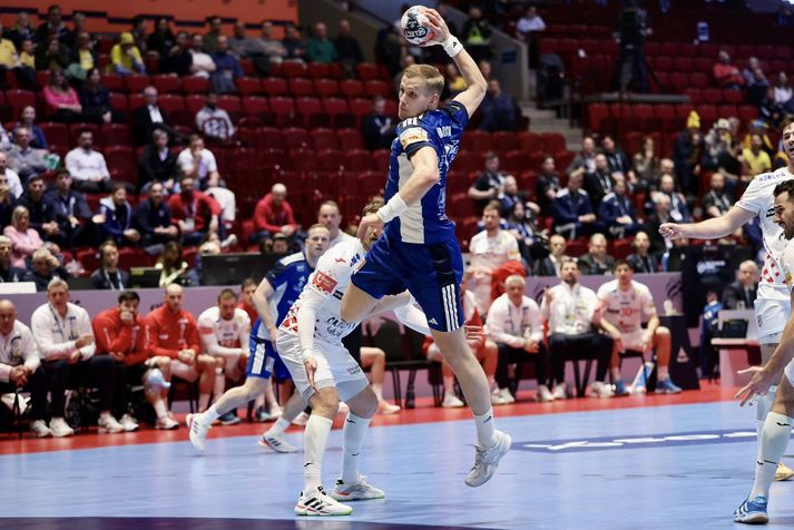 Uppgjörið: Ísland - Króatía 30-29 | Aftur súrt tap gegn Króötunum hans Dags Hjörtur Leó Guðjónsson skrifar 23. janúar 2026 10:01 Íslenska karlalandsliðið í handbolta þurfti að sætta sig við súrt tap gegn Króötum í dag. Vísir/Vilhelm Íslenska karlalandsliðið í handbolta mátti þola súrt eins marks tap gegn lærisveinum Dags Sigurðssonar í króatíska landsliðinu á EM í handbolta í dag. Króatíska liðið setti tóninn strax í upphafi leiks og ljóst var að strákarnir okkar þyrftu að standa af sér mikinn barning næstu 60 mínúturnar. Króatar skoruðu í fyrstu fjórum sóknum sínum í leiknum, gegn aðeins tveimur mörkum Íslands, en á sama tíma tókst lærisveinum Dags að næla sér tvívegis í tveggja mínútna brottvísun og að lumbra á Ómari Inga Magnússyni í einni sókn til viðbótar. Á þeim tíma meiddist einnig Dino Slavic, markvörður Króata, við það að skutla sér á eftir skoti Elliða Snæs Viðarssonar frá miðju. Inn á í hans stað kom Dominik Kuzmanovic, sem átti eftir að reynast íslenska liðinu erfiður. Elliði Snær Viðarsson skýtur að marki Króata.Vísir/Vilhelm Króatar héldu tveggja til þriggja marka forskoti næstu mínútur, eða alveg þar til á 20. mínútu þegar Orri Freyr Þorkelsson skoraði úr hraðaupphlaupi og minnkaði muninn niður í eitt mark. Stuttu síðar varð íslenska liðið þó fyrir áfalli þegar Haukur Þrastarson fékk eitt stykki olnboga af fullum þunga í kjálkann er hann reyndi að verjast Zvonimir Srna. Haukur fékk langa aðhlynningu á blóðugu gólfinu, en gekk að lokum óstuddur af velli. Hann kom sér þó inn í klefa áður en fyrri hálfleik lauk, en mætti aftur út í sal eftir hálfleikshléið. Haukur Þrastarson fékk þungt högg á kjálkann í fyrri hálfleik.Vísir/Vilhelm Áfram voru Króatar með yfirhöndina og strákarnir okkar að elta. Króatíska liðið náði þriggja marka forskoti á ný þegar rétt tæpar tvær mínútur voru eftir af fyrri hálfleik og misnotað víti í næstu sókn Íslands leiddi til þess að Króatar náðu fjögurra marka forskoti fyrir hlé. Íslenska liðið tapaði reyndar boltanum í sinni síðustu sókn í fyrri hálfleik og Króatar fengu tækifæri til að auka muninn enn frekar, en þá var heppnin með okkur og staðan var 15-19 þegar liðin gengu til búningsherbergja. Janus Daði Smárason fórnar höndum í leik dagsins.Vísir/Vilhelm Líklega var varnarleikur íslenska liðsins umræðuefnið í hálfleiksræðu Snorra Steins, enda erfitt að vinna handboltaleiki þegar liðið fær á sig 19 mörk á hverjum 30 mínútum. Hálfleikshléið virtist hafa gert íslensku strákunum gott því Króatar skoruðu aðeins eitt mark á fyrstu rúmu átta mínútum seinni hálfleiks. Á sama tíma skoraði íslenska liðið fjögur mörk og minnkaði muninn aftur niður í eitt. Óðinn Þór Ríkharðsson fagnar einu af sínum mörkum.Vísir/Vilhelm Tapaðir boltar í tveimur sóknum í röð hjá íslenska liðinu hleyptu Króötum þó aftur þremur mörkum yfir. Íslenska liðið minnkaði niður í tvö áður en Dagur Sigurðsson tók leikhlé fyrir Króata þegar rúmur stundarfjórðungur var til leiksloka. Áfram voru strákarnir okkar að elta og næstu mínútur hélst munurinn í tveimur til þremur mörkum. Ómari Inga Magnússyni tókst þó loksins að minnka muninn í eitt mark á 51. mínútu með marki úr vítakasti og við tóku æsispennandi lokamínútur. Þegar um sjö og hálf mínúta var eftir af leiknum tók Snorri Steinn leikhlé fyrir íslenska liðið til að stilla upp í skot fyrir Þorstein Leó Gunnarsson, en skot hans fór yfir markið. Snorri Steinn fylgist með af hliðarlínunni.Vísir/Vilhelm Íslenska liðið þurfti því að halda eltingaleik sínum áfram, en eins og fyrr í leiknum brást okkur bogalistinn þegar mest á reyndi. Skot af íslensku vörninni sem endaði í netinu kom Króötum í þriggja marka forskot þegar rúmar tvær mínútur voru til leiksloka og miðað við hvað var búið að skora lítið í seinni hálfleik virtist fjallið vera orðið óklífandi fyrir íslenska liðið. Óðinn Þór Ríkharðsson minnkaði muninn í tvö mörk þegar rúm mínúta var eftir og aftur þegar tæp mínúta var eftir. Hann minnkaði svo muninn niður í eitt mark þegar um tíu sekúndur voru til leiksloka, en þá var það orðið of seint og Króatar fögnuðu að lokum eins marks sigri, 29-30. Ísland og Króatía eru því jöfn að stigum í milliriðli II, með tvö stig eftir tvo leiki. Liðin sitja í 1.-4. sæti riðilsins, ásamt Svíum og Slóvenum. EM karla í handbolta 2026 Landslið karla í handbolta