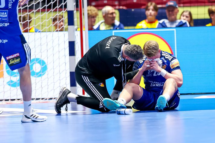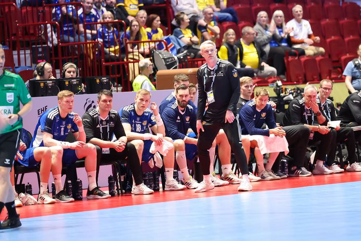 Íslenska karlalandsliðið í handbolta mátti þola súrt eins marks tap gegn lærisveinum Dags Sigurðssonar í króatíska landsliðinu á EM í handbolta í dag. Króatíska liðið setti tóninn strax í upphafi leiks og ljóst var að strákarnir okkar þyrftu að standa af sér mikinn barning næstu 60 mínúturnar. Króatar skoruðu í fyrstu fjórum sóknum sínum í leiknum, gegn aðeins tveimur mörkum Íslands, en á sama tíma tókst lærisveinum Dags að næla sér tvívegis í tveggja mínútna brottvísun og að lumbra á Ómari Inga Magnússyni í einni sókn til viðbótar. Á þeim tíma meiddist einnig Dino Slavic, markvörður Króata, við það að skutla sér á eftir skoti Elliða Snæs Viðarssonar frá miðju. Inn á í hans stað kom Dominik Kuzmanovic, sem átti eftir að reynast íslenska liðinu erfiður. Elliði Snær Viðarsson skýtur að marki Króata.Vísir/Vilhelm Króatar héldu tveggja til þriggja marka forskoti næstu mínútur, eða alveg þar til á 20. mínútu þegar Orri Freyr Þorkelsson skoraði úr hraðaupphlaupi og minnkaði muninn niður í eitt mark. Stuttu síðar varð íslenska liðið þó fyrir áfalli þegar Haukur Þrastarson fékk eitt stykki olnboga af fullum þunga í kjálkann er hann reyndi að verjast Zvonimir Srna. Haukur fékk langa aðhlynningu á blóðugu gólfinu, en gekk að lokum óstuddur af velli. Hann kom sér þó inn í klefa áður en fyrri hálfleik lauk, en mætti aftur út í sal eftir hálfleikshléið. Haukur Þrastarson fékk þungt högg á kjálkann í fyrri hálfleik.Vísir/Vilhelm Áfram voru Króatar með yfirhöndina og strákarnir okkar að elta. Króatíska liðið náði þriggja marka forskoti á ný þegar rétt tæpar tvær mínútur voru eftir af fyrri hálfleik og misnotað víti í næstu sókn Íslands leiddi til þess að Króatar náðu fjögurra marka forskoti fyrir hlé. Íslenska liðið tapaði reyndar boltanum í sinni síðustu sókn í fyrri hálfleik og Króatar fengu tækifæri til að auka muninn enn frekar, en þá var heppnin með okkur og staðan var 15-19 þegar liðin gengu til búningsherbergja. Janus Daði Smárason fórnar höndum í leik dagsins.Vísir/Vilhelm Líklega var varnarleikur íslenska liðsins umræðuefnið í hálfleiksræðu Snorra Steins, enda erfitt að vinna handboltaleiki þegar liðið fær á sig 19 mörk á hverjum 30 mínútum. Hálfleikshléið virtist hafa gert íslensku strákunum gott því Króatar skoruðu aðeins eitt mark á fyrstu rúmu átta mínútum seinni hálfleiks. Á sama tíma skoraði íslenska liðið fjögur mörk og minnkaði muninn aftur niður í eitt. Óðinn Þór Ríkharðsson fagnar einu af sínum mörkum.Vísir/Vilhelm Tapaðir boltar í tveimur sóknum í röð hjá íslenska liðinu hleyptu Króötum þó aftur þremur mörkum yfir. Íslenska liðið minnkaði niður í tvö áður en Dagur Sigurðsson tók leikhlé fyrir Króata þegar rúmur stundarfjórðungur var til leiksloka. Áfram voru strákarnir okkar að elta og næstu mínútur hélst munurinn í tveimur til þremur mörkum. Ómari Inga Magnússyni tókst þó loksins að minnka muninn í eitt mark á 51. mínútu með marki úr vítakasti og við tóku æsispennandi lokamínútur. Þegar um sjö og hálf mínúta var eftir af leiknum tók Snorri Steinn leikhlé fyrir íslenska liðið til að stilla upp í skot fyrir Þorstein Leó Gunnarsson, en skot hans fór yfir markið. Snorri Steinn fylgist með af hliðarlínunni.Vísir/Vilhelm Íslenska liðið þurfti því að halda eltingaleik sínum áfram, en eins og fyrr í leiknum brást okkur bogalistinn þegar mest á reyndi. Skot af íslensku vörninni sem endaði í netinu kom Króötum í þriggja marka forskot þegar rúmar tvær mínútur voru til leiksloka og miðað við hvað var búið að skora lítið í seinni hálfleik virtist fjallið vera orðið óklífandi fyrir íslenska liðið. Óðinn Þór Ríkharðsson minnkaði muninn í tvö mörk þegar rúm mínúta var eftir og aftur þegar tæp mínúta var eftir. Hann minnkaði svo muninn niður í eitt mark þegar um tíu sekúndur voru til leiksloka, en þá var það orðið of seint og Króatar fögnuðu að lokum eins marks sigri, 29-30. Ísland og Króatía eru því jöfn að stigum í milliriðli II, með tvö stig eftir tvo leiki. Liðin sitja í 1.-4. sæti riðilsins, ásamt Svíum og Slóvenum.
