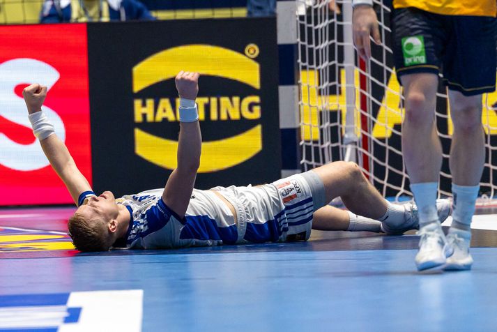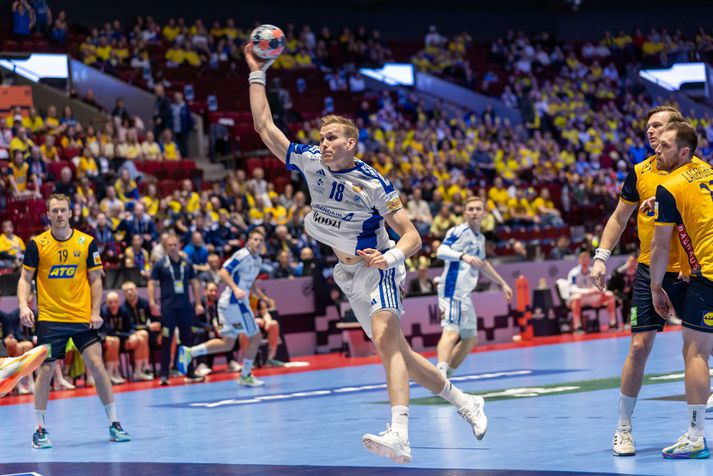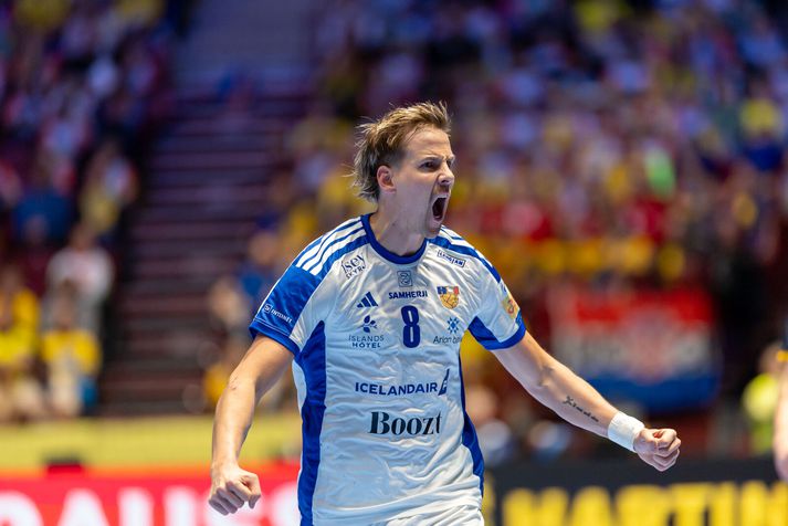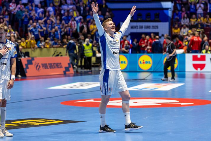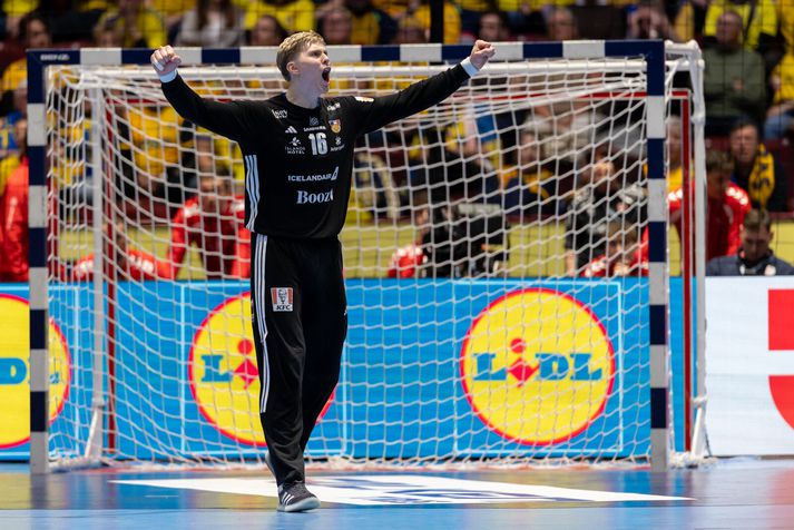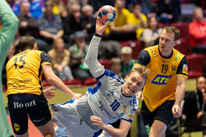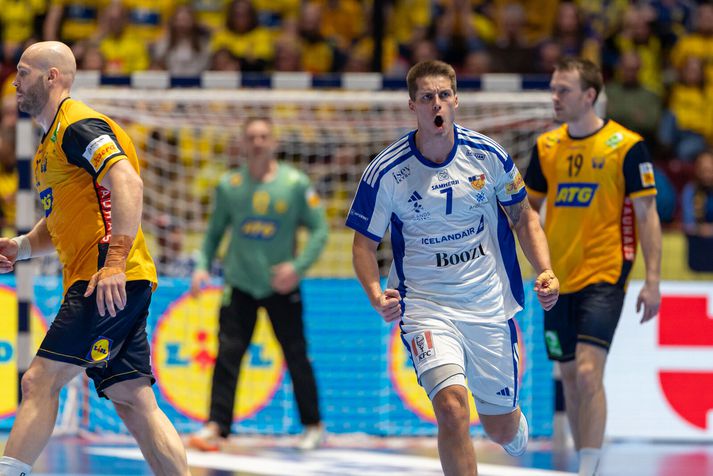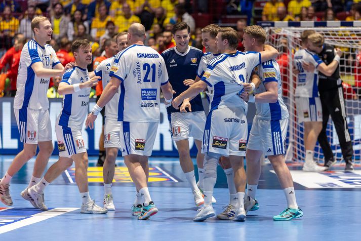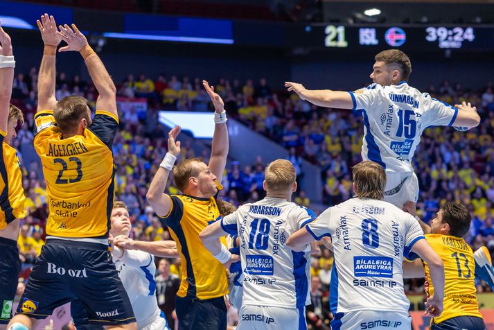 Niðurstaðan var átta marka stórsigur íslenska landsliðsins og öllu snúið á hvolf í milliriðlinum. Án vafa eitt besta kvöld strákanna okkar á stórmóti í handbolta frá upphafi. Strákarnir okkar sýndu hreinlega frábæran leik, fyrst með því að fara illa með Svíana í fyrri hálfleik og svo með því að ganga frá þeim á síðustu fimmtán mínútunum eftir að Svíar höfðu minnkað muninn í eitt mark. Íslenska landsliðið vann síðustu fimmtán mínútur leiksins 12-5 og niðurlægði sænska landsliðið á þeirra eigin heimavelli. Vilhelm Gunnarsson, ljósmyndari Vísis, var á leiknum í Malmö og náði þessum flottu myndum hér fyrir neðan. Viggó Kristjánsson átti stórleik og skoraði úr öllum ellefu skotunum sem hann tók í leiknum.Vísir/Vilhelm Svíar voru á heimavelli en íslenska stuðningsfólkið lét samt vel í sér heyra allan tímann og það munaði miklu um það.Vísir/Vilhelm Íslenska liðið sýndi hversu samheldið og öflugt það getur verið á góðum degi. Að vinna Svía með átta mörkum á þeirra eigin heimavelli er magnaður árangur.Vísir/Vilhelm Elliði Snær Viðarsson gaf allt sitt í leikinn og fékk á endanum krampa eftir að hafa skorað mikilvægt mark.Vísir/Vilhelm Þessi risastóri íslenski fáni hefur verið áberandi á Evrópumótinu.Vísir/Vilhelm Bjarki Már Elísson átti mjög góðan leik í vinstri horninu og þetta er sá Bjarki sem við munum eftir.Vísir/Vilhelm Elliði Snær Viðarsson skorar hér í leiknum en hann náði ellefu löglegum stöðvunum í vörninni.Vísir/Vilhelm Gísli Þorgeir Kristjánsson keyrði hvað eftir annað á sænsku vörnina, bjó til fimmtán skotfæri fyrir félaga sína og fiskaði fjögur víti.Vísir/Vilhelm Það var gaman að vera Íslendingur í Malmö í gær. Hér má sjá Arnar Frey Arnarsson kátan eftir leik.Gísli Þorgeir Kristjánsson Þorsteinn Leó Gunnarsson reynir hér skot en hann kom inn á völlinn til að taka lokasókn í einni sókninni þegar Ísland var að fá á sig leiktöf.Vísir/Vilhelm Íslensku marki er hér fagnað af mikilli innlifun.Vísir/Vilhelm Haukur Þrastarson lét heldur betur ekki vaða yfir sig í leiknum í gær.Vísir/Vilhelm Viktor Gísli Hallgrímsson varði vel allan leikinn og fagnar hér með íslenska stuðningsfólkinu sem svaraði með: „“ Viktor Gísli...Viktor Gísli....Viktor Gísli.“Vísir/Vilhelm Ýmir Örn Gíslason var öflugur í íslensku vörninni og fagnar hér í leikslok.Vísir/Vilhelm Snorri Steinn Guðjónsson setti þennan leik frábærlega upp.Vísir/Vilhelm Vísir/Vilhelm Vísir/Vilhelm Vísir/Vilhelm Vísir/Vilhelm