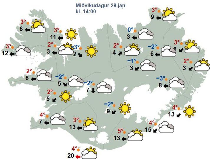 Áfram hvasst með suðurströndinni Atli Ísleifsson skrifar 28. janúar 2026 07:12 Hiti verður á bilinu núll til sex stig, en um eða undir frostmarki á Norður- og Austurlandi. Vísir/Anton Brink Austlægar áttir ráða ríkjum á landinu þessa dagana og verður áfram hvassviðri eða stormur með suðurströndinni, en hægari vindur annars staðar. Þetta segir á vef Veðurstofunnar. Þar kemur fram að útlit sé fyrir skúri eða él á austanverðu landinu, en víða bjart veður vestantil. Í höfuðborginni bætir í vindinn upp úr hádegi og verður einna hvassast við Esjuna. Hiti verður á bilinu núll til sex stig, en um eða undir frostmarki á Norður- og Austurlandi. Á morgun dregur loks úr vindinum á öllu landinu og bætir í úrkomuna um sunnan- og austanvert landið. Líkur eru á að einhverjir dropar nái inn á suðvesturhornið í fyrramálið. Hægur vindur og úrkomulítið á föstudaginn. Ekki er útlit fyrir snjókomu á láglendi að neinu ráði næstu vikuna. Spákort fyrir klukkan 14 í dag.Veðurstofan Veðurhorfur á landinu næstu daga Á fimmtudag: Minnkandi austanátt, 5-13 m/s síðdegis, hvassast syðst. Skúrir eða slydduél, en bjart með köflum og þurrt að mestu norðan- og vestantil. Hiti 0 til 8 stig, mildast sunnanlands. Á föstudag: Austlæg átt 3-10 m/s, hvassast syðst. Dálítil él eða skúrir austantil, en styttir upp síðdegis. Annars að mestu þurrt. Hiti um frostmark, en víða vægt frost norðanlands. Á laugardag: Austlæg átt 5-13 m/s og skúrir eða slydduél, en þurrt norðantil. Hiti um eða undir frostmarki, en upp í 5 stig með suðurströndinni. Á sunnudag: Austan 8-13 m/s og slydda eða rigning, en úrkomulítið norðanlands. Hiti frá frostmarki fyrir norðan upp í 5 stig syðst. Á mánudag: Suðaustlæg átt og rigning, einkum sunnantil, en lengst af þurrt fyrir norðan. Hlýnar heldur. Á þriðjudag: Útlit fyrir stífa sunnan- og suðaustanátt og talsverða rigningu sunnanlands. Hiti 3 til 8 stig. Veður Mest lesið Kvaddi hundinn sem bjargaði lífi hennar uppi í rúmi Innlent Dómari stöðvar brottflutning Liam og föður hans Erlent Mannfallið að nálgast tvær milljónir Erlent Róa á nýnasistamið í leit að ICE-liðum Erlent Innlit á Litla-Hraun í erlendri heimildarmynd Innlent Maður sprautaði illa lyktandi vökva á Ilhan Omar Erlent Tónninn breytist með yfirmannaskiptum hjá ICE Erlent Rúmlega tvöhundruð skjálftar við Lambafell í Þrengslum Innlent Höfðu afskipti af „trylltum“ manni og ofurölvi útlendingi Innlent Svíar líta til kjarnorkuvopna Erlent Fleiri fréttir Áfram hvasst með suðurströndinni Slær áfram í storm á suðurströndinni Djúp lægð veldur stormi syðst á landinu Þurrt og bjart víða um landið Hvasst syðst á landinu Kólnandi veður og víða bjart Ákveðin austanátt á landinu öllu og víða snarpar hviður Víða rigning með köflum og bætir í vind í kvöld Róleg austanátt en hvessir á morgun Víða rigning og kólnar í veðri Minnkandi norðlæg átt en bætir í vind á morgun Þurrt og bjart suðvestantil en snjór og él víða Líkur á smá slyddu og snjókomu syðst Stíf norðvestlæg átt ásamt ofankomu Gæti slegið í storm og hringvegurinn lokaður Óvissustig á vegi milli Kirkjubæjarklausturs og Jökulsárlóns Gular veðurviðvaranir framundan Útlit fyrir hríðarveður á austasta hluta landsins í kvöld Frost og hægur vindur Norðaustlæg átt og allvíða él Veginum lokað við Skaftafell og fólk leitar í fjöldahjálparstöð Vara við eldingum á Suðausturlandi Gular viðvaranir vegna norðaustan hríðar Áfram kalt á landinu Óvenjulega hlýr desember Áfram kalt og lægðir sækja að landinu Hægir vindar og snjókoma norðan- og austantil Þykknar upp og snjóar Allt að tuttugu stiga frost en bjart víða Rólegt veður en kalt næstu daga Sjá meira
