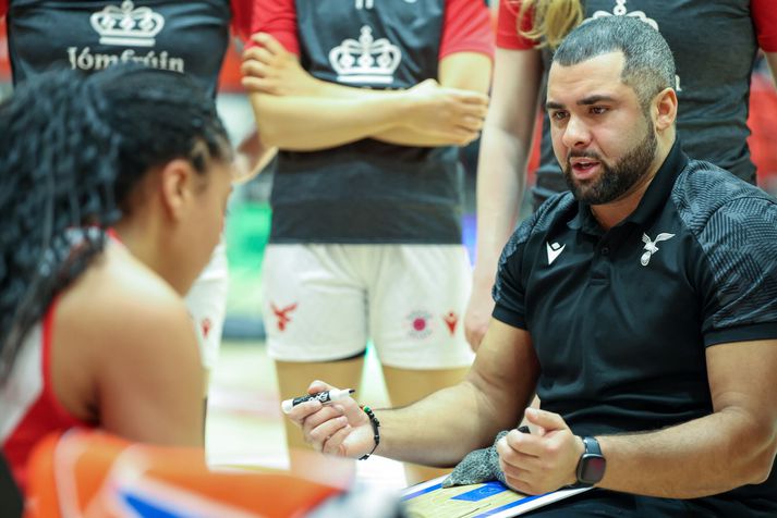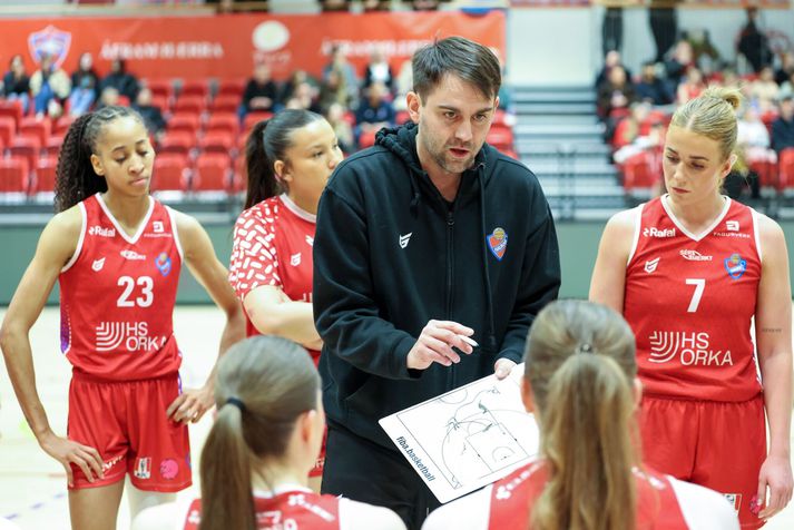 Valskonur tóku á móti Íslandsmeisturum Hauka í Bónus-deild kvenna í kvöld en fyrir leikinn voru liðin jöfn að stigum í 4. og 5. sæti í þéttum pakka í efri hluta deildarinnar en Haukar slíta sig frá Val eftir leik kvöldsins sem lauk með 90-97 sigri Hauka. Dagbjört Dögg sækir á körfunaVísir/Pawel Eftir nokkuð flata byrjun á tímabilinu hafa Haukar verið að sækja í sig veðrið og voru með fjóra sigra í röð fyrir leikinn og héldu uppteknum hætti í kvöld. Gestirnir náðu fljótt upp smá forskoti og leiddu með ellefu eftir góða lokarispu í fyrsta leikhluta. Alyssa Cerino hóf annan leikhluta með látum og setti átta stig í röð. Þá rönkuðu Haukar við sér og héldu muninum um það bil í tíu stigum og í hálfleik munaði aftur ellefu stigum, staðan 42-53 og Haukar í bílstjórasætinu fram að þessu. Alyssa Cerino var stigahæst Valskvenna og hélt þeim inni í leiknum með þristum ofar en einu sinniVísir/Pawel Valskonur komu mjög einbeittar út í seinni hálfleikinn og skoruðu fyrstu níu stig hálfleiksins án svars. Emil tók leikhlé í stöðunni 51-53. Heimakonur komus svo yfir í stöðunni 55-54 en þá fór Eyjólfur loks að hressast og á sama tíma virtust Valskonur missa einbeitinguna, þá sérstaklega varnarmegin, og fengu á sig nokkrar ódýrar körfur. Staðan 65-73 fyrir lokasprettinn. Haukar voru með pálmann í höndunum þegar þær ýttu muninn upp í tíu stig í upphafi fjórða leikhluta en Valskonur neituðu að gefast upp og minnkuðu muninn í þrjú stig í kjölfarið. Þær komust þó ekki nær og ég set spurningamerki við nokkrar ákvarðanir í sóknarleik Vals í lokin en skotin voru bara engan vegin að detta á ögurstundu. Tinna Guðrún á fleygiferð í kvöld. Hún skilaði 16 stigum í hús.Vísir/Pawel Þær neituðu þó að gefast upp og minnkuðu muninn aftur í þrjú og lokasekúndur leiksins urðu æsispennandi en Haukar héldu haus og lokuðu þessum leik með sanngjörnum 90-97 sigri. Atvik leiksins Áhlaup Vals í upphafi síðari hálfleiks má færa til bókar sem atvik leiksins. Þær hófu leikhlutann á 13-1 áhlaupi og komust einu stigi yfir. Þetta gerði það að verkum að seinni hálfleikurinn varð virkilega spennandi og úr varð hin besta skemmtun fyrir áhorfendur. Stjörnur og skúrkar Amandine Justine Toi var frábær í liði Hauka og stigahæst á vellinum með 31 stig. Krystal-Jade Freeman skilaði góðri tvöfaldri tvennu með 16 stig og tíu fráköst. Þóra Kristín stýrði leik Hauka með styrkri hendi í kvöld. 15 stig frá henni og sex stoðsendingar.Vísir/Pawel Hjá Val var Alyssa Cerino stigahæst með 24 stig og átti nokkra risastóra þrista þegar neyðin var stærst. Þóranna Kika Hodge-Carr kom næst með 21 stig og níu fráköst en hún var mjög öflug undir lokin þegar Valskonur freistuðu þess að taka lokaáhlaup. Þóranna Kika var öflug í liði Vals í kvöld.Vísir/Pawel Dómarar Sigmundur Már Herbertsson, Bjarki Þór Davíðsson og Federick Alfred U Capellan dæmdu leikinn í kvöld. Ég tók varla eftir að þeir væru á gólfinu í fyrri hálfleik og það er alltaf besta jafnvægið. Eftir því sem leið á leikinn komu nokkrir áhugaverðir dómar og ódýrar villur og var augljóst að stuðningsmenn Vals voru ekki á eitt sáttir með þeirra frammistöðu að þessu sinni. Dómaratríó kvöldsinsVísir/Pawel Tap Vals verður þó varla skrifað á dómgæsluna sem var heilt yfir þokkaleg. Stemming og umgjörð Það verður að hrósa Völsurum fyrir flotta umgjörð og góða mætingu í kvöld. Pálmar Ragnarsson var mættur með heilan herskara af yngri flokka iðkendum sem héldu uppi fjörinu bæði fyrir leik og á milli leikhluta. Ég held að ég hafi bara ekki séð jafn góða mætingu í stúkuna á Hlíðarenda síðan í úrslitakeppninni síðasta vor. Viðtöl Emil Barja: „Stefna á að vinna restina af leikjunum“ Emil Barja fer yfir málin með sínum konumVísir/Pawel Emil Barja, þjálfari Hauka, var sáttur með sigurinn í kvöld en viðurkenndi að Valskonur hefðu náð að skjóta honum skelk í bringu í upphafi síðari hálfleiks. „Algjörlega. Ég held að þær hafi meira að segja komist yfir, komust einu stigi yfir. Ég er ótrúlega ánægður bara að við létum þær ekki keyra yfir okkur. Náðum aðeins að koma til baka og þétta raðirnar og tókum þetta.“ „Við vissum alveg að þær væru að fara að taka áhlaup og þetta væri ekkert að fara að enda í einhverjum 20 stigum. Bara ótrúlega mikill karakter að geta tekið þetta á sig og bara komið til baka og byrjað upp á nýtt okkar áhlaup. Ég er mjög ánægður með leikinn.“ Emil fékk góða frammistöðu úr ýmsum áttum í kvöld og var að vonum sáttur með það. „Mér fannst allar sem voru með boltann, ég treysti þeim til að skora. Ég held að það sé líka svolítið styrkleikinn okkar. Við erum með fullt af skorurum sem geta stigið upp og tekið yfir leikinn. Við gátum alltaf fundið rétta „mis-match-ið“ sem við vorum að leita að og sótt á það.“ Sigurinn í kvöld er Haukum afar mikilvægur í ljósi þess hve deildin er jöfn á þessum tímapunkti. „Miðað við hvað deildin er jöfn akkúrat núna skiptir þetta alveg gríðarlegu máli. Við erum jöfn núna í efsta með nokkrum liðum eftir úrslitin í gær. Við verðum bara að halda áfram okkar. Byrjum á því að komast áfram í þennan efri hluta sem lítur ágætlega út núna. Svo erum við bara að stefna á að vinna restina af leikjunum.“ Þrátt fyrir að landa sigri og ágæta frammistöðu er alltaf rými fyrir bætingu og lítur Emil sérstaklega til frákastanna. „Eins og ég sagði fyrir leikinn þá erum við búin að leggja hvílíkt mikla áherslu á fráköst og það er það eina sem við töluðum um en við töpum þeim með tíu. Vorum að vinna reyndar ef