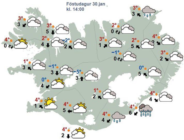 Víðast úrkomulítið en skúrir og slydduél austantil Atli Ísleifsson skrifar 30. janúar 2026 07:11 Hiti verður í kringum frostmark. Vísir/Vilhelm Veðurstofan gerir ráð fyrir fremur hægri austlægri átt í dag og rigning eða snjókoma austantil fram eftir morgni. Það verða skúrir eða slydduél suðaustanlands seinnipartinn, en úrkomulítið í öðrum landshlutum. Á vef Veðurstofunnar segir að hiti verði í kringum frostmark. „Það er litlar breytingar að sjá á morgun, skýjað með köflum og stöku skúrir eða él á landinu. Síðdegis bætir þó heldur í vindinn við suðurströndina. Á sunnudag er útlit fyrir ákveðna austan- og suðaustanátt með hlýnandi veðri. Rigning eða slydda með köflum, en að mestu þurrt á Norðurlandi,“ segir á vef Veðurstofunnar. Spákort fyrir klukkan 14.Veðurstofan Veðurhorfur á landinu næstu daga Á laugardag: Fremur hæg austlæg átt, en 8-13 m/s syðst. Skýjað með köflum og stöku skúrir eða él, en lengst af bjart um landið suðvestanvert. Hiti um eða undir frostmarki Á sunnudag: Austan 5-13 og dálítil rigning eða slydda, en að mestu þurrt norðanlands. Hlýnandi veður, hiti 1 til 7 stig síðdegis. Á mánudag: Hæg suðaustanátt, víða bjartviðri norðan heiða og vægt frost. Skýjað syðra og smáskúrir suðaustanlands, hiti 0 til 5 stig. Á þriðjudag: Suðaustanátt og skúrir eða él, en þurrt á Norður- og Vesturlandi. Hiti um eða yfir frostmarki. Á miðvikudag: Austanátt og él á austanverðu landinu, en léttskýjað vestantil. Kólnar í veðri. Á fimmtudag: Austlæg átt og snjókoma eða slydda með köflum, en að mestu þurrt á Norðurlandi. Veður Mest lesið Hýdd 140 sinnum fyrir áfengisneyslu og kynlíf utan hjónabands Erlent Njósnastjóri Trumps leitar að kosningasvindli Erlent „Muni ekki valda neinu öðru en umferðaröngþveiti“ Innlent Lögregla í eltingaleikjum við afbrotamenn Innlent Hafði aldrei heyrt um handbolta fyrr en hún kynntist handboltaóðu þjóðinni Innlent Myndbirtingar foreldra geti skapað hættu Innlent Trump segir Pútín hafa samþykkt hlé á árásum á Kænugarð Erlent „Mér þykir leiðinlegt að þetta gangi ekki betur“ Innlent Reyndi að frelsa Mangione vopnaður pítsaskera Erlent Óvissustigi lýst yfir vegna snjóflóðahættu Innlent Fleiri fréttir Víðast úrkomulítið en skúrir og slydduél austantil Mildri austanátt beint til landsins Áfram hvasst með suðurströndinni Slær áfram í storm á suðurströndinni Djúp lægð veldur stormi syðst á landinu Þurrt og bjart víða um landið Hvasst syðst á landinu Kólnandi veður og víða bjart Ákveðin austanátt á landinu öllu og víða snarpar hviður Víða rigning með köflum og bætir í vind í kvöld Róleg austanátt en hvessir á morgun Víða rigning og kólnar í veðri Minnkandi norðlæg átt en bætir í vind á morgun Þurrt og bjart suðvestantil en snjór og él víða Líkur á smá slyddu og snjókomu syðst Stíf norðvestlæg átt ásamt ofankomu Gæti slegið í storm og hringvegurinn lokaður Óvissustig á vegi milli Kirkjubæjarklausturs og Jökulsárlóns Gular veðurviðvaranir framundan Útlit fyrir hríðarveður á austasta hluta landsins í kvöld Frost og hægur vindur Norðaustlæg átt og allvíða él Veginum lokað við Skaftafell og fólk leitar í fjöldahjálparstöð Vara við eldingum á Suðausturlandi Gular viðvaranir vegna norðaustan hríðar Áfram kalt á landinu Óvenjulega hlýr desember Áfram kalt og lægðir sækja að landinu Hægir vindar og snjókoma norðan- og austantil Þykknar upp og snjóar Sjá meira