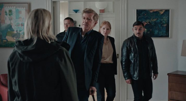 Danska konan er sex þátta svört kómedía í leikstjórn Benedikts Erlingssonar sem skrifar sjálfur handritið með Ólafi Agli Egilssyni. Þetta eru fyrstu sjónvarpsþættirnir sem Benedikt leikstýrir, þeir eru framleiddir af Slot Machine í samstarfi við Gullslottið, Zik Zak Filmworks og RÚV og voru frumsýndir á Rúv 1. janúar 2026. Þættirnir hafa verið í bígerð um árabil, frá því Benedikt leikstýrði Hross í oss árið 2014. Upphaflega stóð til að Charlotte Bøving, þá eiginkona Benedikts, myndi leika dönsku konuna en þau skildu árið 2020 og hætti Charlotte í kjölfarið við að leika í þáttunum. Trine Dyrholm, ein fremsta leikkona Dana, fer í staðinn með aðalhlutverkið en hún hefur leikið í rúmlega sextíu verkum á nær fjörutíu ára ferli, þar má nefna Festen (1998), I Kina spiser de hunde (1999) Hævnen (2010), Et kongelig affære (2012) og Pigen med nålen (2024). Leikhópurinn er fjölmennur; Kristín Þóra Haraldsdóttir, Hilmar Guðjónsson, Halldóra Geirharðsdóttir, Hjálmar Hjálmarsson, Björn Thors, Halla Vilhjálmsdóttir, Atli Rafn Sigurðsson og Juan Camillo Estrada fara með hlutverk í þáttunum auk fjölda annarra. Lesendur athugi að ákveðnum söguhlutum er spillt í umfjölluninni hér að neðan. Hvað er um að vera í blokkinni? Miðaldra kona á fjórum fótum reitir arfa og ergir sig á ketti sem hefur skitið í beðið. Hún narrar köttinn í gildru og kemur honum fyrir kattarnef. Þar er snúið á haus hinu sígilda Hollywood-handritsbragði „Save the Cat“ sem á að afla söguhetjunni samúðar hjá áhorfendum með því að láta hana vinna góðverk snemma í sögunni, til dæmis bjarga ketti úr háska. Miskunnarlaust kattarmorðið ætti að gera áhorfendur fráhverfa konunni en ofstopafull viðbrögðin og fáránleg hefnigirndin gera það líka spaugilegt og vekja forvitni okkar. Danska konan er mikill náttúruverndarsinni. Brátt kemur í ljós að konan er danskur hjúkrunarfræðingur, fyrrverandi hermaður og leyniþjónustumaður, heitir Ditte Jensen (Dyrholm) og er nýflutt í blokkina. Eftir þessa hressilegu byrjun fylgjast áhorfendur með Ditte kynnast nágrönnunum. Hún hneykslast á lélegri dönskukunnáttu Íslendinganna og uppgötvar fljótt að íbúar blokkarinnar glíma allir við einhverja bresti þó misalvarlegir séu. Greyið Ástríður (Halla Vilhjálms) býr með ofsafengna hjólreiðamanninum Skarphéðni (Atla Rafni); einstæða móðirin Gulla (Kristín Þóra) getur illa séð um börn sín sem þjást öll af skjáfíkn; Soffía (Halldóra Geirharðs) felur áfengissýki sína fyrir eiginmanninum Kristni (Hjálmari Hjálmars) og dótturinni Björk (Eddu Guðnadóttur) sem er farin að sofa hjá. Formaður húsfélagsins Magnús (Björn Thors) ekur um á mengandi risajeppa og miðaldra pönkarinn Þórir (Hilmar Guðjóns) getur ekki hætt að djamma. Þá eru ónefndir innflytjendurnir Juan Camillo (Juan Camillo) og Salima (Raffaella Brizuela Sigurðardóttir) sem eiga von á barni og brottvísun úr landi. Íbúarnir í blokkinni eru misbreyskir. Meginþráður seríunnar eru tilraunir Ditte til að ýmist hjálpa þessu fólki, stöðva óæskilega hegðun þeirra eða refsa þeim. Ditte beitir þar þeim aðferðum sem hún kann, skemmdarverkum, blekkingum, ofbeldi og ógnarstjórn. Fortíðin bankar aftur á móti upp á dyrnar hjá Ditte. Annars vegar í formi áfallastreituröskunar sem felur í sér martraðir og dagdrauma um hryllileg atvik úr stríðinu og hins vegar í formi gamals félaga úr leyniþjónustunni sem vill að hún vinni fyrir sig eitt lokaverkefni. Aumir Íslendingar, nýlenduherrar og sænskur glæpon Áhorfendur fá strax góða kynningu á íbúum blokkarinnar og þessum litla heimi þeirra. Það er bæði gert með því að láta Ditte rekast á nágranna sína á ganginum og svo sést dýnamíkin ögn betur á húsfundum. Eftir að hafa séð um köttinn er Ditte fljót að finna sér næsta skotmark í Þórði sem heldur hávær partý langt fram á nótt – martröð blokkaríbúans – án þess að gefa nágrönnunum nokkurn gaum. Vandamálin sem Ditte tekst á við eru raunveruleg og áhorfendur hafa samúð með afstöðu Ditte hvort sem það er í tengslum við skjáfíkn barna, heimilisofbeldi, ofstopafullt djammlíferni, brottvísun innflytjenda eða stafrænt kynferðisofbeldi. Ditte leysir þetta allt með valdi og offorsi. Oftar en ekki fer hún alveg yfir strikið en samt missir hún okkur áhorfendur ekki, þar má þakka bæði snjöllu handriti og óstöðvandi sjarma Trine Dyrholm. Fólkið í blokkinni fylgist með því sem er að gerast. Í augum Ditte helgar tilgangurinn meðalið og hún gengur alltaf alla leið við að leysa málin. Þar taka við hasarsenur þar sem Ditte klæðir sig í nælongrímu og fer á stjá. Benedikt byggir vel upp spennu með tónlist og klippingu og sýnir hvað hann er frumlegur hasarleikstjóri, hvort sem það eru óvenjuleg hryðjuverk á ríkisstofnun, snjallsímabað eða óheppilegt hjólreiðaslys. Karakterarnir eru hálfgerðar erkitýpur: húsfreyja sem verður fyrir heimilisofbeldi, alkahólisti sem felur vín sitt, djammari sem þroskast ekki, saklausir innflytjendur og hrokafullur kallakall. Þessar persónur fá líka mismikinn tíma á skjánum og verða sumar því heldur grunnar og eintóna. Að hluta til er það þó með vilja gert, við kynnumst fólkinu gegnum Ditte og fáum jafneinfalda mynd af þeim og hún. Sænski mafíósinn er vígalegur með sitt mikla skegg. Gegnum fyrstu fjóra þættina tekst Ditte á við vandamál íbúanna óáreitt en svo eykst flækjustigið með tilkomu tveggja norrænna manna. Leyniþjónustuforinginn Jens Jørgensen (Jens Albinus) krefur Ditte um að vinna eitt lokaverkefni fyrir danska ríkið og sænski mafíósinn Ingmar Strömberg (Fyr Thorvaldur Strømberg) fer að abbast upp á Þórð vegna fíkniefn