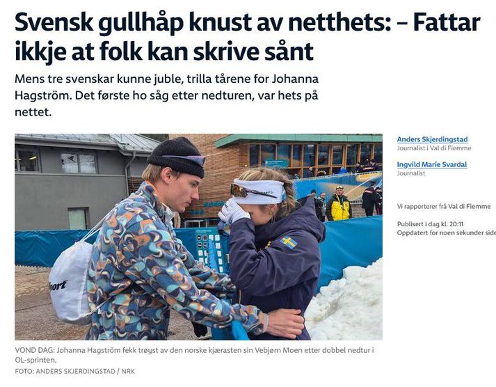 Gullverðlaunin í sprettgöngu kvenna fóru til Linn Svahn, silfrið til Jonnu Sundling og bronsið til Maju Dahlqvist. Á áhorfendapöllunum fékk Karl Gústaf konungur því að upplifa sögulegan dag í sænskum skíðagöngum. En þegar sænski þjóðsöngurinn ómaði yfir Ólympíuleikvanginn var dagurinn fyrir löngu búinn að taka hörmulega stefnu fyrir fjórðu konuna í sænska liðinu. Tárin streymdu Tárin streymdu þegar Johanna Hagström var í viðtali við norska sjónvarpið. Ekki vegna þess að það væru mikil vonbrigði að falla úr leik í átta manna úrslitum, heldur vegna þess sem mætti henni þegar hún leit á símann sinn. „Þegar maður situr og reynir að melta það að maður sé dottinn út, þá er ljóst að ég hef fengið mörg falleg skilaboð. En ég renndi snöggt yfir og sá athugasemd á Instagram sem birtist sem ég vildi alls ekki sjá,“ segir Johanna Hagström við norska ríkisútvarpið, greinilega snortin. NRK Hagström sagði frá nokkrum niðrandi skilaboðum eftir að hún féll úr leik í sprettgöngu Ólympíuleikanna. Fólk hugsar ekki áður en það skrifar Hagström segir að hún hafi ekki upplifað mörg svipuð tilvik sjálf en viti að aðrir hafi gert það. „Fólk hugsar ekki áður en það skrifar og á að hafa svo margar skoðanir á hlutunum, og það skil ég ekki. Maður á að halda því fyrir sjálfan sig. Það má hafa skoðun, en maður þarf ekki að skrifa hana. Ég skil ekki hvernig fólk getur skrifað svona,“ sagði Hagström. Í samtali við sænska ríkisútvarpið sagði hún að athugasemdin hafi snúist um valið í sprettgöngu Ólympíuleikanna. Ég veit að ég á þetta sæti skilið „Ég veit að ég á þetta sæti skilið, en það voru nokkrar athugasemdir um að Emma (Ribom) hefði sko ekki dottið út í átta manna úrslitum,“ útskýrir hún. „Mér finnst þetta alveg rangt. Þetta á ekki heima neins staðar. Það hefði alveg eins getað verið Johanna sem stæði hér með verðlaun,“ segir Maja Dahlqvist, liðsfélagi Hagström, með bronsverðlaun um hálsinn. Barist fyrir þessu í fjögur ár Landsliðsþjálfari Svía, Anders Byström, segir að hans ráð sé að íþróttafólkið fylgist ekki með því sem er skrifað til þess á stórmóti. Samt sem áður sættir hann sig ekki við það sem Hagström upplifði. „Maður verður að hugsa um að þessir íþróttamenn hafa barist fyrir þessu í fjögur ár og svo fær maður svona endi, þá á maður ekki að strá meira salti í sárið. Það eru mörg nettröll sem sitja þarna,“ sagði Byström við NRK.