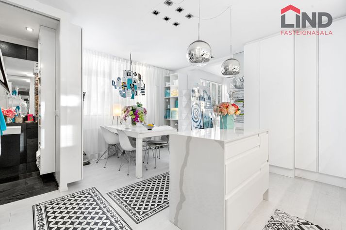 Vala Matt selur á Ásvallagötunni Magnús Jochum Pálsson skrifar 11. febrúar 2026 12:09 Vala Matt er að selja en hún sýndi ófáar íbúðirnar í sjónvarpsþáttunum Innlit/útlit á Stöð 2 forðum daga. Fjölmiðlakona Valgerður Matthíasdóttir, betur þekkt sem Vala Matt, hefur sett íbúð sína að Ásvallagötu 69 á sölu. Íbúðin er þriggja herbergja, 62,5 fermetrar og er ásett verð hennar 65,9 milljónir króna. Íbúðin er á fyrstu hæð í fjórbýlishúsi við Ásvallagötu sem var byggt árið 1938. Í lýsingu á fasteignavef Vísis kemur fram að íbúðin hafi verið sérstaklega teiknuð og hönnuð af Völu sjálfri og endurnýjuð töluvert. Hellulagt er fyrir framan íbúðina. Gengið er upp tröppur frá hellulögðum palli fyrir framan húsið inn í íbúðina. Eldhúsið tekur þar við manni en þar er ný og sérhönnuð eldhúsinnrétting og eldhúseyja með kvartsteini. Inni í innréttingunni er uppþvottavél ásamt þvottavél með þurrkara. Borðstofan liggur við eldhúsið og nýtur birtu frá glugga. Borðstofuborðið er við stóran glugga. Eldhúsið og borðstofa eru saman. Blöndunartækin eru forvitnileg. Blöndunartækin í eldhúsinu gefa íbúðinni ákveðna sérstöðu og eru býsna athyglisverð. Þar er hægt að fá kalt sódavatn beint úr öðrum krananum og bullandi heitt vatn úr hinum. Frá eldhúsinu er gengið inn í bjarta stofu með stórum gluggum. Einn veggurinn þar er þakinn speglum sem stækka rýmið. Baðherbergið liggur einnig frá eldhúsinu, það er flísalagt með svörtum Mustang-náttúrusteini og svo er svefnherbergi með töluverðu skápaplássi. Einn veggur stofunnar er þakinn speglum sem stækka hana töluvert. Baðherbergið er lítið og huggulegt. Í kjallara er lítil geymsla og stórt sameiginlegt rými sem áður var þvottahús en er nú notað fyrir frystikistur og skápa. Fyrir framan húsið er búið að leggja hellur og setja skrautmöl og skýli fyrir ruslatunnurnar. Hægt er að skoða fleiri myndir af íbúðinni á fasteignavef Vísis og hjá Fasteignasölunni Lind. Fasteignamarkaður Reykjavík Hús og heimili Mest lesið Britney selur réttinn að tónlist sinni fyrir milljarða Lífið Vala Matt selur á Ásvallagötunni Lífið „Ég sé að hann er löngu farinn“ Lífið Glímdi við kaupfíkn og fór í gjaldþrot: „Það kemur alltaf að skuldadögum“ Lífið Dillandi danskur Bond til bjargar blokkinni Gagnrýni Í fyrsta sinn á föstu á Valentínusardaginn 52 ára Tónlist Varð milljón krónum ríkari í mátunarklefa á Tenerife Lífið Múmían rís í fjórða sinn Bíó og sjónvarp Frestar tónleikum heilsunnar vegna Lífið Gullin regla að sýna ekki allt hold í einu Tíska og hönnun Fleiri fréttir Vala Matt selur á Ásvallagötunni „Ég sé að hann er löngu farinn“ Frestar tónleikum heilsunnar vegna Britney selur réttinn að tónlist sinni fyrir milljarða Mínútuþögn á minningarleik um Patrek Frey Varð milljón krónum ríkari í mátunarklefa á Tenerife Yfirlýst lesbía Búið á tólf stöðum í tólf ára sambandi Fjörugt Food and fun framundan „Þetta er erfiðasta mýta sem næringarfræðin hefur þurft að díla við lengi“ Glímdi við kaupfíkn og fór í gjaldþrot: „Það kemur alltaf að skuldadögum“ Eyddi öllu út beint eftir Ofurskálina Brynja Dan og Jóhann selja slotið eftir breytingar Listapör, dansfjölskylda og rjómi senunnar á Garðinum Fram, fram, framakonur Maturinn í Ofurskálinni: Vængirnir étnir í tonnatali Glæsilegustu bollur landsins ruku út Svona var hálfleiksatriði Bad Bunny: „Guð blessi Ameríku“ Úr Eurovision í jógað: „Var ekki nógu góð við sjálfa mig eftir þetta“ Quang Le „virkilega indæll og mjög næs náungi“ Stjörnulífið: „Já, ég er klámfíkill“ Er óeðlilegt að gift fólk frói sér? Prinsinum hafi verið hent út á miðnætti Hamilton ætlar ekki að bruna Tímabilið sem flestir vilja gleyma Festist í lyftu í New York Að vera neitað um listamannalaun reyndist algjör frelsun Krakkatía vikunnar: Fáni, Esbjerg og Ormstunga Þúsund hlauparar í stuði í Norðurljósahlaupi ON Söngvari 3 Doors Down látinn Sjá meira