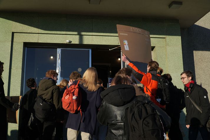 Nokkrir tugir stúdenta komu sér fyrir með mótmælaspjöld í aðalbyggingu Háskóla Íslands í aðdraganda fundarins sem hófst klukkan 13 og lauk um fjögurleytið.