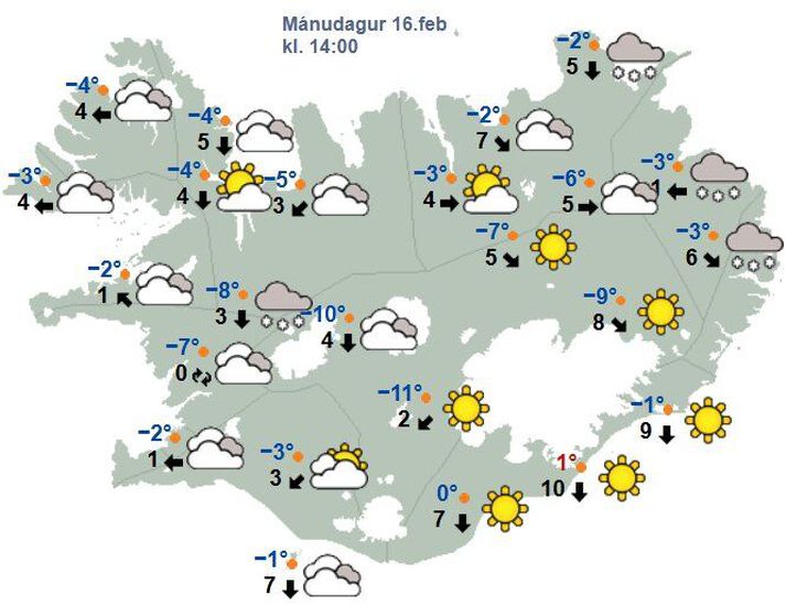 Draga kalt heimskautaloft yfir landið næstu daga Atli Ísleifsson skrifar 16. febrúar 2026 07:06 Gera má ráð fyrir frosti þremur til átján stig í dag. Vísir/Vilhelm Hæð yfir Grænlandi og lægðir vestur af Noregi halda áfram að draga kalt heimskautaloft yfir landið næstu daga. Gera má ráð fyrir frosti þremur til átján stig í dag þar sem kaldast verður inn til landsins. Á vef Veðurstofunnar segir að heldur meiri hreyfing verði þó á lægðum í kringum landið þessa vikuna sem færi yfir úrkomubakka víða um land og því ætti hlé að verða á þurrkatíðinni um landið sunnanvert. Á þriðjudag verður allhvasst eða hvasst austantil á landinu, einkum á Austfjörðum, og einnig um vestanvert landið síðdegis. Víða úrkomulítið fyrir utan stöku él norðantil, en útlit fyrir að hríð bresti á um landið suðvestanvert þegar líða fer á þriðjudaginn sem gæti varað inn í miðvikudaginn. Þá mun draga hægt úr vindi og ofankomu sunnantil, en byrja að snjóa norðantil síðdegis. Á fimmtudag er útlit fyrir að það verði framhald á snjókomunni norðanlands þó dragi heldur úr frosti. Annars þurrt að mestu. Spákort fyrir klukkan 14.Veðurstofan Veðurhorfur á landinu næstu daga Á þriðjudag: Norðaustlæg átt 8-15 m/s norðvestan- og vestantil, hvassara austast um tíma, en annars hægari. Dálítil él norðantil, en snjókoma sunnantil. Hiti frá frostmarki við Suðurströndina, niður í 12 stiga frost fyrir norðan. Á miðvikudag: Norðlæg átt 5-13 m/s. Él um landið sunnanvert, en snjókoma norðanlands. Frost 0 til 8 stig. Á fimmtudag: Norðaustan 3-13 m/s, hvassast norðvestantil. Snjókoma eða él um landið norðanvert. Frost 0 til 6 stig. Á föstudag: Norðaustan 5-15 m/s, hvassast norðvestantil og með Suðurströndinni. Snjókoma eða él norðanlands. Hiti um frostmark við ströndina en vægt frost inn til landsins. Á laugardag: Útlit fyrir austlæga átt og rigningu, snjókomu eða slyddu, einkum norðantil. Hlýnar upp fyrir frostmark við ströndina í flestum landshlutum. Á sunnudag: Útlit fyrir ákveðna norðaustlæga átt og talsverða úrkomu, einkum suðaustantil, en hægari og úrkomuminna suðvestantil. Heldur hlýrra syðst, annars hiti víða um og undir frostmarki. Veður Mest lesið Obama gefur út yfirlýsingu um mögulega tilvist geimvera Erlent Fríska upp á kjarnorkumannvirki í laumi Erlent Mánudagsmorgunn í Kaffistofu Samhjálpar Innlent Draga kalt heimskautaloft yfir landið næstu daga Veður Íhugar að leggja á sykurskatt Innlent Fimm sóttir upp á Fjarðarheiði í nótt Innlent „Eins og knattspyrnuþjálfari sem er á bekknum“ Innlent Sinueldur við Framheimilið Innlent Manntjón meðal almennings í Úkraínu jókst um 26 prósent Erlent Happdræti Háskólans varar við svikurum Innlent Fleiri fréttir Draga kalt heimskautaloft yfir landið næstu daga Vara við snörpum vindhviðum Köldu heimskautalofti enn beint til landsins Kaldri norðlægri átt beint til landsins Dálítil él norðan- og austantil en annars bjart að mestu Dregur úr vindi og kólnar í kvöld Vindasamt víða á landinu Áfram léttskýjað á Suðvesturhorninu Éljagangur og slabb í kortunum Skil að ganga yfir landið með tilheyrandi úrkomu Ekkert lát á austlægum áttum Allhvass vindur og svalari en síðustu daga Áfram austanátt og kólnar í kvöld Ekkert óvenjulegt við kalt og bjart veður Hvassast við suðurströndina Má búast við skúrum eða éljum Víðast úrkomulítið en skúrir og slydduél austantil Mildri austanátt beint til landsins Áfram hvasst með suðurströndinni Slær áfram í storm á suðurströndinni Djúp lægð veldur stormi syðst á landinu Þurrt og bjart víða um landið Hvasst syðst á landinu Kólnandi veður og víða bjart Ákveðin austanátt á landinu öllu og víða snarpar hviður Víða rigning með köflum og bætir í vind í kvöld Róleg austanátt en hvessir á morgun Víða rigning og kólnar í veðri Minnkandi norðlæg átt en bætir í vind á morgun Þurrt og bjart suðvestantil en snjór og él víða Sjá meira