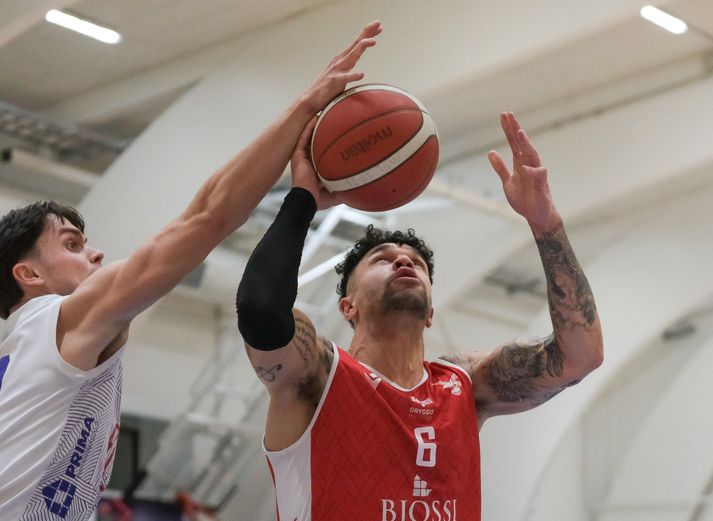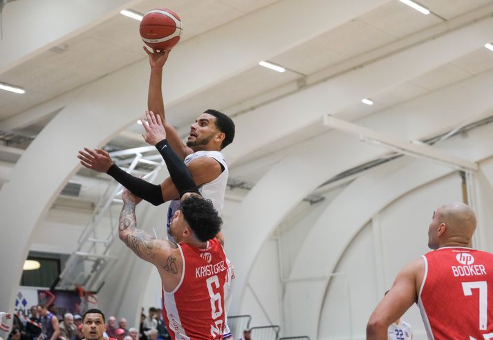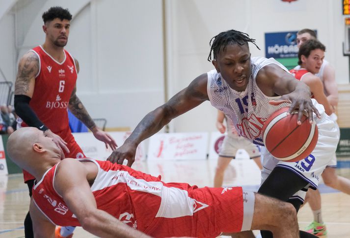 Fran Aron Booker leggur allt í sölurnar. David Okeke ryður honum um koll.Vísir / Anton Brink