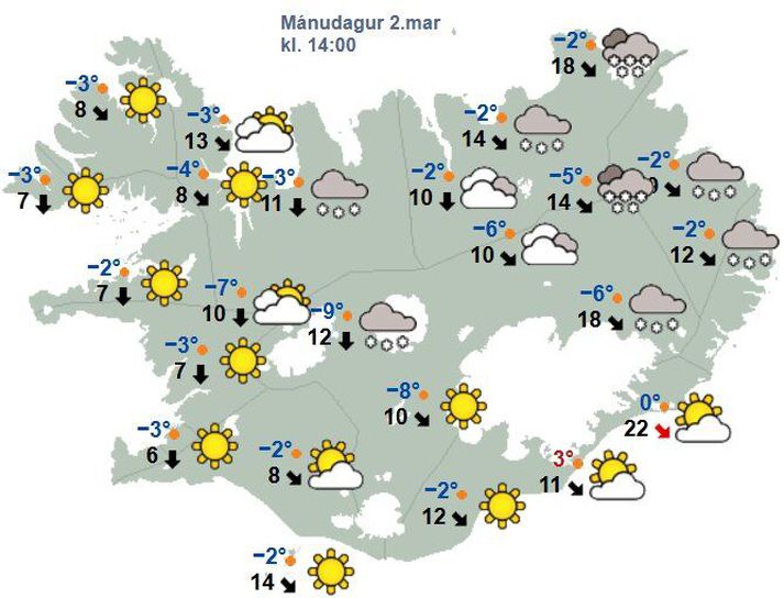 Í hugleiðingum veðurfræðings segir að auk þessa mikla vinds sé útlit fyrir snjókomu og skafrenningskóf á svæðinu frá Tröllaskaga og austur á firði. Frost á landinu verður á bilinu núll til átta stig. „Gular viðvaranir taka gildi í tilheyrandi landshlutum í dag, og versti kaflinn á spásvæðunum Austurlandi að Glettingi og Austfjörðum hefur verið rammaður inn með appelsínugulri viðvörun. Þar má búast við stórhríð þegar verst lætur og einnig er spáð slíkri veðurhæð að möguleiki er á foktjóni, t.d. að losni þakplötur á stöku stað. Á vestanverðu landinu verður vindur mun hægari, yfirleitt kaldi eða strekkingur og él fram eftir degi, en þurrt að mestu suðvestanlands. Svalt í veðri. Í kvöld styttir upp fyrir austan, þá fer einnig að draga úr vindi og í fyrramálið verður þetta illviðri úr sögunni. Á morgun nálgast næsta lægð úr suðvestri. Þá gengur í allhvassa eða hvassa suðaustanátt sunnan- og vestanlands með snjókomu og síðar rigningu eða slyddu, og líkur eru á að færð spillist á einhverjum fjallvegum um tíma. Á norðaustanverðu landinu verður vindur hins vegar hægari og lengst af úrkomulítið. Hlýnar í veðri,“ segir á vef Veðurstofunnar. Seint á morgun dregur úr vindi, og á miðvikudag er svo útlit fyrir sunnan kalda eða strekking með éljum sunnan- og vestantil,“ segir í hugleiðingum veðurfræðings. Spákort fyrir klukkan 14.Veðurstofan Veðurhorfur á landinu næstu daga Á þriðjudag: Gengur í suðaustan 13-20 m/s með snjókomu og síðan rigningu eða slyddu, en hægari og úrkomulítið um landið norðaustanvert. Hlýnandi, hiti 0 til 8 stig síðdegis. Suðaustan og sunnan 8-15 um kvöldið og kólnar vestanlands með éljum. Á miðvikudag: Sunnan og suðvestan 5-13 og él sunnan- og vestanlands, annars bjart að mestu. Frost víða 0 til 5 stig. Á fimmtudag: Suðlæg átt 5-13 og él, en bjartviðri um landið norðaustanvert. Hiti breytist lítið. Vaxandi suðaustanátt um kvöldið með slyddu eða snjókomu sunnanlands. Á föstudag: Ákveðin sunnanátt og snjókoma eða él, en styttir upp á Norðaustur- og Austurlandi. Hiti um eða undir frostmarki. Á laugardag: Hvöss sunnan- og suðaustanátt og snjókoma eða slydda, en rigning um tíma á láglendi. Úrkomuminna seinnipartinn. Hiti um eða yfir frostmarki. Á sunnudag: Suðvestanátt og él, en bjart að mestu norðaustanlands. Hiti kringum frostmark.