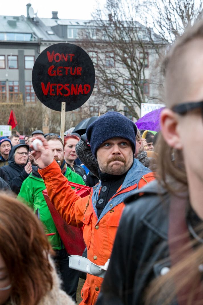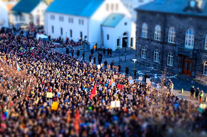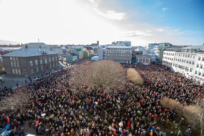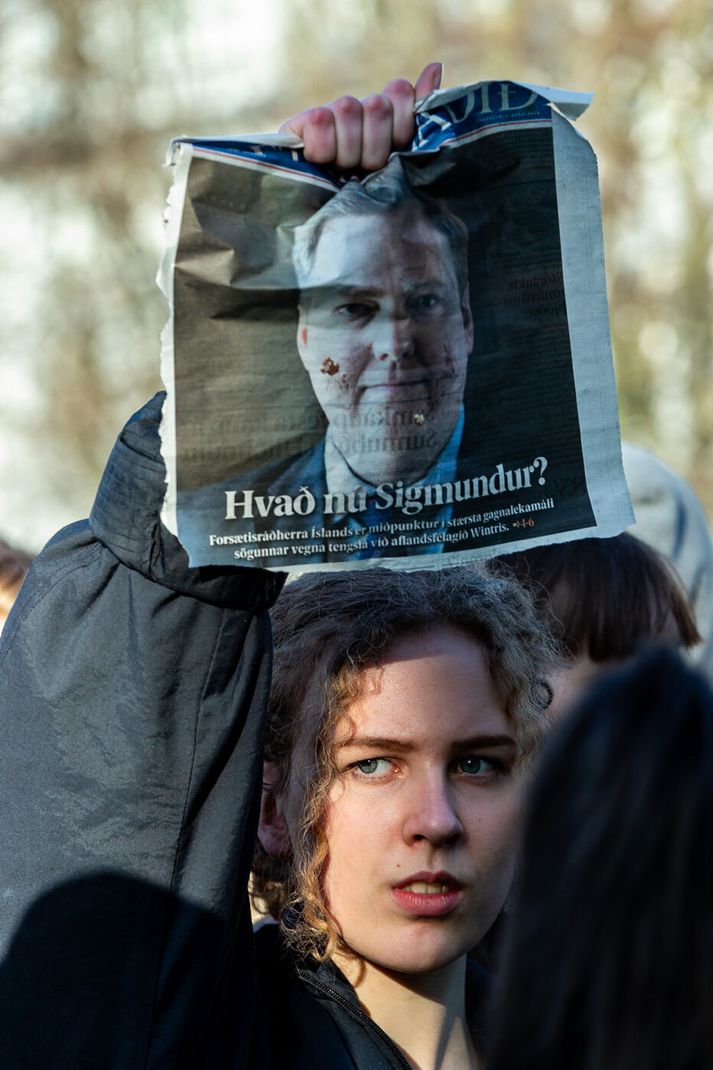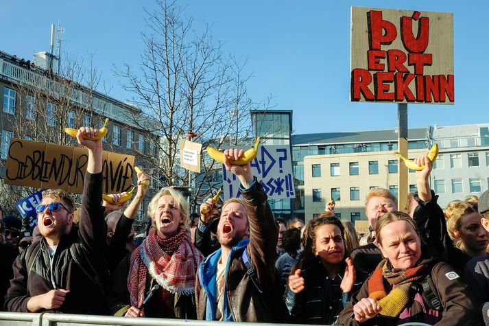 Vilhelm Gunnarsson ljósmyndari Vísis var á svæðinu þessa daga og fangaði stemninguna, sem minnti um margt á tímann í kringum búsáhaldabyltinguna. Birting Panama-skjalanna vorið 2016 hafði víðtæk áhrif á íslenskt samfélag og stjórnmál á skömmum tíma. Umfjöllun fjölmiðla um tengsl Sigmundar Davíðs Gunnlaugssonar forsætisráðherra og eiginkonu hans við aflandsfélagið Wintris vakti hörð viðbrögð og mikla reiði meðal almennings. Sérstaka athygli vakti viðtal við Sigmund Davíð í þætti Kastljóss þar sem hann gekk út þegar hann var spurður um félagið, atvik sem síðar varð táknrænt fyrir málið. Birting Panama-skjalanna vorið 2016 hafði víðtæk áhrif á íslenskt samfélag og stjórnmál á skömmum tíma.Vísir/Vilhelm Vigdís Hauksdóttir virðir fyrir sér mannfjöldann á Austurvelli. Í einni frétt var deginum lýst sem „leikhúsi fáránleikans“, þar sem stjórnmálamenn funduðu á bak við luktar dyr á meðan þúsundir mótmælenda stóðu fyrir utan Alþingishúsið og kröfðust breytinga.Vísir/Vilhelm Þann 4. apríl safnaðist fjöldi fólks á Austurvelli til að krefjast afsagnar forsætisráðherrans. Mótmælendur kölluðu slagorð á borð við „Segðu af þér“ og „Burt með ríkisstjórnina“. Margir komu með potta og pönnur, sem minnti á búsáhaldabyltinguna eftir bankahrunið. Daginn eftir, þann 5. apríl, náðu mótmælin hámarki. Talið var að um 20–22 þúsund manns hefðu safnast saman á Austurvelli og í nágrenni, sem gerði mótmælin að einni fjölmennustu samkomu í sögu Íslands. Í fréttum var bent á að miðborgin væri nánast full af fólki og að umferð hefði þyngst verulega í kringum Alþingi. Lögreglumennirnir virðast rólegir en viðbúnir og sýna hvernig yfirvöld fylgdust náið með aðstæðum meðan mótmælin stóðu yfir.Vísir/Vilhelm Mótmælendur halda á banönum á lofti á meðan þeir hrópa slagorð. Vísir/Vilhelm Mótmælin vöktu einnig mikla athygli erlendis. Fjölmargir erlendir fjölmiðlar og sjónvarpsstöðvar voru á staðnum og fylgdust með atburðunum. Í einni frétt kom fram að allt að 75 sjónvarpsstöðvar víða um heim hefðu óskað eftir að sýna frá mótmælunum. Fréttir sögðu frá því að eggjum og öðrum hlutum hefði verið kastað í átt að Alþingishúsinu og að lögregla fylgdist grannt með aðstæðum. Einnig var talað um að grín og kaldhæðni á samfélagsmiðlum hefði smám saman vikið fyrir alvöru og reiði eftir því sem krísan dýpkaði. Þessi mynd fangar hvernig fjölmiðlaumfjöllunin sjálf varð að tákni í mótmælunum.Vísir/Vilhelm Loftmynd yfir Austurvöll sýnir gríðarlegan mannfjölda sem hefur safnast fyrir framan Alþingishúsið.Vísir/Vilhelm Sigmundur Davíð Gunnlaugsson forsætisráðherra á leið á fund með þingflokki Framsóknarflokksins.Vísir/Vilhelm Í kjölfar mótmælanna fór Sigmundur Davíð á fund forseta Íslands og óskaði eftir þingrofi, en beiðninni var hafnað. Stuttu síðar tilkynnti hann að hann myndi stíga til hliðar sem forsætisráðherra og Sigurður Ingi Jóhannsson tók við embættinu. Málið hafði einnig áhrif á orðspor Íslands erlendis og varð eitt stærsta pólitíska áfall landsins frá bankahruni. Panama-málið hafði þannig bæði áhrif á ríkisstjórnina, ímynd landsins og pólitíska umræðu, auk þess sem það varð hluti af stærri umræðu um gagnsæi og ábyrgð í stjórnmálum.Vísir/Vilhelm Óttarr Proppé og Birgitta Jónsdóttir, þingmenn Bjartrar framtíðar og Pírata, fylgjast grannt með gangi mála.Vísir/Vilhelm Myndin fangar augnablik rétt áður en eggi er kastað.Vísir/Vilhelm Sumir líktu stemningunni við tímann í kringum búsáhaldabyltinguna.Vísir/Vilhelm Sigmundur Davíð Gunnlaugsson lætur af embætti forsætiráðherra.Vísir/Vilhelm Á gangstéttinni má sjá brotin egg, banana, tómata og annað sem hefur verið kastað í átt að húsinu.Vísir/Vilhelm Mótmælin á þessum dögum urðu lykilþáttur í þeirri atburðarás sem leiddi til þess að Sigmundur Davíð steig til hliðar sem forsætisráðherra. Samkomurnar á Austurvelli voru jafnframt taldar meðal stærstu mótmæla sem haldin hafa verið á Íslandi frá bankahruninu.
