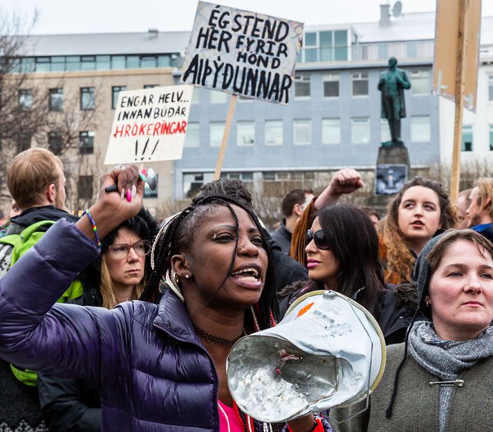 Þriggja daga leikhús fáránleikans Auður Ösp Guðmundsdóttir skrifar 8. mars 2026 08:01 Talið er að 22 þúsund manns hafi mætt á Austurvöll til að krefjast afsagnar ríkisstjórnar Sigmundar Davíðs Gunnlaugssonar eftir að upp komst um tengsl hans við aflandsfélagið Wintris. Andrúmsloftið einkenndist af miklum tilfinningum, hávaða og táknrænum mótmælaaðgerðum. Vísir/Vilhelm Stemningin á Austurvelli dagana 4.–6. apríl 2016, í kjölfar uppljóstrana úr Panama-skjölunum um tengsl forsætisráðherra við aflandsfélag einkenndist af mikilli reiði, samstöðu og pólitískri spennu. Slagorð á borð við „Sigmundur, segðu af þér“ og „Burt með ríkisstjórnina“ heyrðust úr mannfjöldanum. Á örfáum dögum breyttist miðborg Reykjavíkur í vettvang einna stærstu mótmæla í íslenskri stjórnmálasögu. Vilhelm Gunnarsson ljósmyndari Vísis var á svæðinu þessa daga og fangaði stemninguna, sem minnti um margt á tímann í kringum búsáhaldabyltinguna. Birting Panama-skjalanna vorið 2016 hafði víðtæk áhrif á íslenskt samfélag og stjórnmál á skömmum tíma. Umfjöllun fjölmiðla um tengsl Sigmundar Davíðs Gunnlaugssonar forsætisráðherra og eiginkonu hans við aflandsfélagið Wintris vakti hörð viðbrögð og mikla reiði meðal almennings. Sérstaka athygli vakti viðtal við Sigmund Davíð í þætti Kastljóss þar sem hann gekk út þegar hann var spurður um félagið, atvik sem síðar varð táknrænt fyrir málið. Birting Panama-skjalanna vorið 2016 hafði víðtæk áhrif á íslenskt samfélag og stjórnmál á skömmum tíma.Vísir/Vilhelm Vigdís Hauksdóttir virðir fyrir sér mannfjöldann á Austurvelli. Í einni frétt var deginum lýst sem „leikhúsi fáránleikans“, þar sem stjórnmálamenn funduðu á bak við luktar dyr á meðan þúsundir mótmælenda stóðu fyrir utan Alþingishúsið og kröfðust breytinga.Vísir/Vilhelm Þann 4. apríl safnaðist fjöldi fólks á Austurvelli til að krefjast afsagnar forsætisráðherrans. Mótmælendur kölluðu slagorð á borð við „Segðu af þér“ og „Burt með ríkisstjórnina“. Margir komu með potta og pönnur, sem minnti á búsáhaldabyltinguna eftir bankahrunið. Daginn eftir, þann 5. apríl, náðu mótmælin hámarki. Talið var að um 20–22 þúsund manns hefðu safnast saman á Austurvelli og í nágrenni, sem gerði mótmælin að einni fjölmennustu samkomu í sögu Íslands. Í fréttum var bent á að miðborgin væri nánast full af fólki og að umferð hefði þyngst verulega í kringum Alþingi. Lögreglumennirnir virðast rólegir en viðbúnir og sýna hvernig yfirvöld fylgdust náið með aðstæðum meðan mótmælin stóðu yfir.Vísir/Vilhelm Mótmælendur halda á banönum á lofti á meðan þeir hrópa slagorð. Vísir/Vilhelm Mótmælin vöktu einnig mikla athygli erlendis. Fjölmargir erlendir fjölmiðlar og sjónvarpsstöðvar voru á staðnum og fylgdust með atburðunum. Í einni frétt kom fram að allt að 75 sjónvarpsstöðvar víða um heim hefðu óskað eftir að sýna frá mótmælunum. Fréttir sögðu frá því að eggjum og öðrum hlutum hefði verið kastað í átt að Alþingishúsinu og að lögregla fylgdist grannt með aðstæðum. Einnig var talað um að grín og kaldhæðni á samfélagsmiðlum hefði smám saman vikið fyrir alvöru og reiði eftir því sem krísan dýpkaði. Þessi mynd fangar hvernig fjölmiðlaumfjöllunin sjálf varð að tákni í mótmælunum.Vísir/Vilhelm Loftmynd yfir Austurvöll sýnir gríðarlegan mannfjölda sem hefur safnast fyrir framan Alþingishúsið.Vísir/Vilhelm Sigmundur Davíð Gunnlaugsson forsætisráðherra á leið á fund með þingflokki Framsóknarflokksins.Vísir/Vilhelm Í kjölfar mótmælanna fór Sigmundur Davíð á fund forseta Íslands og óskaði eftir þingrofi, en beiðninni var hafnað. Stuttu síðar tilkynnti hann að hann myndi stíga til hliðar sem forsætisráðherra og Sigurður Ingi Jóhannsson tók við embættinu. Málið hafði einnig áhrif á orðspor Íslands erlendis og varð eitt stærsta pólitíska áfall landsins frá bankahruni. Panama-málið hafði þannig bæði áhrif á ríkisstjórnina, ímynd landsins og pólitíska umræðu, auk þess sem það varð hluti af stærri umræðu um gagnsæi og ábyrgð í stjórnmálum.Vísir/Vilhelm Óttarr Proppé og Birgitta Jónsdóttir, þingmenn Bjartrar framtíðar og Pírata, fylgjast grannt með gangi mála.Vísir/Vilhelm Myndin fangar augnablik rétt áður en eggi er kastað.Vísir/Vilhelm Sumir líktu stemningunni við tímann í kringum búsáhaldabyltinguna.Vísir/Vilhelm Sigmundur Davíð Gunnlaugsson lætur af embætti forsætiráðherra.Vísir/Vilhelm Á gangstéttinni má sjá brotin egg, banana, tómata og annað sem hefur verið kastað í átt að húsinu.Vísir/Vilhelm Mótmælin á þessum dögum urðu lykilþáttur í þeirri atburðarás sem leiddi til þess að Sigmundur Davíð steig til hliðar sem forsætisráðherra. Samkomurnar á Austurvelli voru jafnframt taldar meðal stærstu mótmæla sem haldin hafa verið á Íslandi frá bankahruninu. Einu sinni var... Panama-skjölin Myndasögur Vilhelms Ljósmyndun Mest lesið Hver er maðurinn? Lífið Tískan vopnið í keppni gegn krabbameini Tíska og hönnun Þriggja daga leikhús fáránleikans Lífið Tók með sér leynihráefnið, Camembert-brennivín Lífið „Eru þær í alvöru tvíburar?“ Lífið Krakkatía vikunnar: Hundar, kettir og eldingar Lífið Laufey „splittaði G-inu“ á tónleikum í Dublin Lífið „Þú ert stærsta súperstjarnan á plánetunni jörð“ Tónlist Salurinn fylltist í þrígang á fimmtíu ára afmælistónleikum Lífið Dorrit segir þetta besta tímann til að fara til Abu Dhabi Lífið Fleiri fréttir Þriggja daga leikhús fáránleikans Krakkatía vikunnar: Hundar, kettir og eldingar Hver er maðurinn? Tók með sér leynihrá