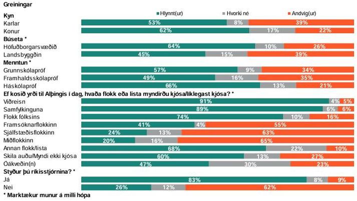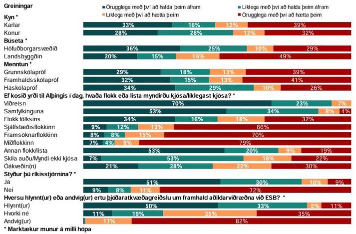 Til stendur að greiða atkvæði um hvort Ísland eigi að halda áfram aðildarviðræðum við Evrópusambandið þann 29. ágúst. Samkvæmt upplýsingum frá Gallup eru 33 prósent þátttakenda alfarið hlynnt atkvæðagreiðslunni, tólf prósent mjög hlynnt, þrettán prósent frekar hlynnt, tólf prósent hvorki né, sjö prósent frekar andvíg, fimm prósent mjög andvíg og átján prósent alfarið andvíg. Þá eru karlar fremur andvígir atkvæðagreiðslunni en konur, en 39 prósent karla eru andvígir henni en 52 prósent hlynntir. Litið til kvenna eru 22 prósent andvígar og 62 prósent kvenna hlynntar. Það kemur ef til vill lítið á óvart að kjósendur Viðreisnar séu hvað hlynntastir atkvæðagreiðslunni enda hefur slík atkvæðagreiðsla verið eitt þeirra helsta baráttumál. Kjósendur Miðflokksins og Sjálfstæðisflokksins eru andvígastir og rúmur helmingur kjósenda Framsóknarflokksins einnig. Konur, höfuðborgarbúar, háskólamenntaðir og kjósendur Viðreisnar og stuðningsmenn ríkisstjórnarinnar eru hlynntari atvkæðagreiðslunni en aðrir. Gallup Marktækur munur var á skoðun þeirra sem styðja ríkisstjórnina og þá sem eru andvígir henni. 83 prósent þeirra sem eru hlynntir ríkisstjórninni eru hlynntir atkvæðagreiðslunni. Sjá nánar: Þjóðaratkvæðagreiðsla um framhald ESB-viðræðna Þátttakendur í könnun Gallup, sem voru rúmlega átta hundruð, voru einnig spurðir hvernig þeir myndu líklegast greiða atkvæði ef þjóðaratkvæðagreiðslan væri haldin í dag. Ekki munaði miklu, 52 prósent sögðust kjósa með áframhaldandi aðildarviðræðum en 48 prósent myndu vilja hætta þeim. Þau sem kysu Viðreisn og Samfylkingu ef kosið yrði til Alþingis í dag telja helst að þau myndu kjósa með framhaldi aðildar viðræðna fremur en þau sem myndu kjósa stjórnarandstöðuflokkana. Þau sem eru hlynnt þjóðaratkvæðagreiðslunni telja frekar að þau myndu kjósa með framhaldi aðildarviðræðna en nánast öll sem eru andvíg þjóðaratkvæðagreiðslunni myndu kjósa með því að hætta þeim. Lítill munur er á kynjunum aðspurð hvort þau kysu af eða á ef gengið yrði til atkvæðagreiðslunnar í dag. Gallup Tengd skjöl Puls_0326_ESB_ThjodaratkvaediagreidslaPDF238KBSækja skjal