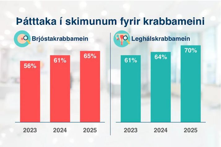Þetta kemur fram í tilkynningu frá heilbrigðisráðuneytinu en þar kemur einnig fram að Alma D. Möller heilbrigðisráðherra segi aukna þátttöku skipta gríðarlega miklu máli. „Skipulögð skimun fyrir krabbameinum getur bjargað mannslífum. Þannig má greina krabbamein á forstigi eða grípa inn í áður en krabbamein myndast og stórauka líkur á lækningu. Ég hvet konur til að mæta þegar boðið kemur,“ segir Alma. Þátttaka í krabbameinsskimunum aukist mikið síðustu árin.Skjáskot/Stjórnarráðið Á vef Stjórnarráðsins kemur fram að þátttaka kvenna í skimunum fyrir leghálskrabbameini hafi verið 70 prósent á síðasta ári og um 65 prósent í skimunum fyrir brjóstakrabbameini . Þátttakan hefur þar af leiðandi aukist um allt að sex prósentustig milli ára og hefur hækkað jafnt og þétt undanfarin ár. Leghálsskimun – lítið mál! Konur á aldrinum 23 til 64 ára fá reglulega boð í leghálsskimun. Í janúar fór í loftið vitundarvakningin „Leghálsskimun – lítið mál!“ sem var samstarfsverkefni Krabbameinsfélags höfuðborgarsvæðisins, Krafts, Lífskrafts, Ungra athafnakvenna og SKS, sem er samhæfingarstöð krabbameinsskimana. Þar mátti sjá konur framkvæma daglegar athafnir svo sem að fjarlægja hár af líkama sínum, skipta um dömubindi og fá gat í eyrað. Yfirskriftin var „við erum ýmsu vanar“. Konur hvetji konur til að mæta „Það er afskaplega jákvætt að sjá þessa miklu aukningu í þátttöku í skimunum fyrir krabbameini á síðasta ári,“ segir Ágúst Ingi Ágústsson, yfirlæknir Samhæfingarstöðvar krabbameinsskimana. „Við erum að þokast jafnt og þétt upp á við. Þar vinna margar hendur gott verk, enda hefur þurft samstarf og samstillt átak fjölmargra sem koma að þessum skimunum og hvetja til þeirra á síðustu árum.“ Kannanir sýna að langflestar konur sem fá boð í skimun ætla sér að mæta en að sumar þeirra fresti því að koma í skimun af einhverjum ástæðum. Ágúst segir mikilvægt að sofna ekki á verðinum. „Þó að það sé gott að sjá að þátttaka í skimunum sé að aukast megum við ekki sofa á verðinum. Við þurfum áfram að hvetja konur til að mæta í skimun, og til að spjalla við vinkonur, mæður, dætur og frænkur og minna á skimunina. Svo væri ekki síður tilvalið að spjalla við erlendar vinkonur eða samstarfskonur og hvetja þær til að mæta,“ segir Ágúst Ingi.