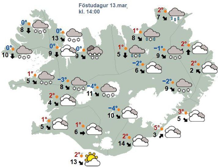 Stífri norðanátt beint til landsins og vegir lokaðir Atli Ísleifsson skrifar 13. mars 2026 07:13 Sunnanlands verður úrkomulítið þó að reikna megi með dálitlum éljum suðvestanlands. Vísir/Vilhelm Lægðasvæði norðaustur af landinu beinir stífri norðvestlægri átt yfir landið með snjókomu á norðanverðu landinu og víða skafrenningi á fjallvegum. Sunnanlands verður úrkomulítið þó að reikna megi með dálitlum éljum suðvestanlands. Á vef Veðurstofunnar segir að það verði hvassast suðaustantil í dag, en suðvestanlands muni lægja smám saman. Gulu viðvaranirnar sem voru í gildi í nótt á norðvestanverðu landinu eru nú allar fallnar úr gildi. „Lægðardrag kemur nær landi úr norðri í kvöld og þá hvessir heldur og vindátt verður vestlægari á Norður- og Austurlandi en jafnframt dregur úr úrkomu. Dálítill úrkomubakki kemur inn á Norðurland í fyrramálið með snjókomu eða slyddu,“ segir á vef Veðurstofunnar. Holtavörðuheiðin lokuð Vegum var víða lokað á Vestfjörðum í gær og í gærkvöldi vegna snjóflóðahættu. Lögreglan á Vestfjörðum lokaði seint í gærkvöldi veginum um Eyrarhlíð, á milli Ísafjarðar og Hnífsdals. Ratsjá Veðurstofunnar greindi þrjú snjóflóð ofan Flateyrar í gær, eitt í Innra‑Bæjargili og tvö í Skollahvilft. Stærstu tvö snjóflóðin náðu að varnargörðunum ofan bæjarins en sköpuðu ekki hættu í byggð. Snjóflóðahætta er á Flateyrarvegi var veginum verður lokað í gærkvöldi þá féllu mörg flóð á veginn um Súðavíkurhlíð og hefur hann verið lokaður frá því fyrir hádegið í gær. Búist er við næstu upplýsingum um væntanlega opnun á þessum svæðum um klukkan tíu. Að auki greindi Veðurstofan frá því í gær að snjóflóð hafi fallið á veg í Súgandafirði, utan við Suðureyri. Líklegt er að fleiri snjóflóð hafi fallið á svæðinu en þar sem skyggni er takmarkað koma þau væntanlega ekki í ljós fyrr en birtir nú í morgunsárið.Og samkvæmt upplýsingasíðu Vegagerðar nú í morgunárið er að auki lokað á Steingrímsfjarðarheiði og um Þröskulda. Veðurhorfur á landinu næstu daga Spákort fyrir klukkan 14 í dag.Veðurstofan Á laugardag: Vestlæg átt, 8-15 m/s austantil á landinu, en hægari vestanlands. Snjókoma eða él á fyrir norðan og slydda eða rigning við ströndina, en bjart sunnan heiða. Dregur úr vindi og úrkomu eftir hádegi, en vaxandi austanátt seinnipartinn og þykknar upp sunnanlands. Strekkings eða allhvöss austanátt vestantil á landinu um kvöldið, en mun hægari austanlands. Snjókoma eða slydda syðst, en víða él eða snjókoma fyrir norðan. Hiti 0 til 5 stig. Á sunnudag: Norðaustan 13-20, hvassast norðvestantil og við suðausturströndina, en mun hægari norðaustanlands. Snjó- eða slydduél, en léttir til suðvestanlands eftir hádegi. Hiti 1 til 5 stig. Á mánudag: Vaxandi norðaustanátt með éljum, en úrkomulítið sunnanlands. Norðaustan hvassviðri og bætir í ofankomu fyrir norðan. Hiti breytist lítið. Á þriðjudag: Stíf norðanátt með talsverðri ofankomu fyrir norðan, lengst af mun hægari vindur og slydda eða rigning austast á landinu, en þurrt að kalla suðvestanlands. Kólnandi. Á miðvikudag: Minnkandi norðanátt með éljum og léttir víða til. Frystir um allt land. Á fimmtudag: Útlit fyrir ákveðna sunnanátt með slyddu en síðar rigningu, einkum sunnan- og vestanlands og hlánar. Veður Mest lesið Lentu í harkalegum árekstri augnablikum eftir nauðgun Innlent Bandarísk herflugvél fórst í Írak Erlent Virðast ekki hafa gert ráð fyrir að sundið myndi lokast Erlent Ekkert lát á árásum Ísraela og hvatt til rýmingar á stóru svæði Erlent Íslendingar skipi sér í hóp með öfgaríkjum Innlent Stunginn með skrúfjárni við Steinhellu Innlent Rannsaka hvernig tíðir og meðganga geta haft áhrif á Parkinson í konum Innlent Áætla að 188 frelsissviptir útlendingar hefðu verið vistaðir í nýja úrræðinu Innlent Sporðamælingar í sjálfboðavinnu í 40 ár: Brasið alltaf dálítið eftirsóknarvert Innlent Landsréttur tók ekki heldur mark á lygilegri frásögn Innlent Fleiri fréttir Stífri norðanátt beint til landsins og vegir lokaðir Reiknað með stormi vestantil og hríðarviðvaranir í gildi Færð geti víða spillst hratt Él og slydduél í dag og önnur lægð á morgun Eldingu laust niður á höfuðborgarsvæðinu Gul viðvörun og enn líkur á eldingum Varað við þrumuveðri með tíðum eldingum Kröpp lægð yfir landinu og úrkoman blönduð Gular veðurviðvaranir í kortunum Köldu lofti beint til landsins Gular viðvaranir á suðvesturhorninu Ört dýpkandi lægð á leiðinni og appelsínugular viðvaranir Appelsínugul viðvörun á morgun Vara við stórhríð á Austurlandi Snjókoma víða en bjart sunnan heiða Væta sunnantil og töluverð hláka í höfuðborginni Hvetja fólk til að fara fyrr heim vegna veðurs Gul viðvörun á höfuðborgarsvæðinu vegna snjókomu Snjókoma á höfuðborgarsvæði í dag og á morgun Úrkomusvæði með snjókomu fer yfir vesturhelming landsins Gular veðurviðvaranir á Austurlandi Snýst í norðanátt og snarpar hviður austantil Útlit fyrir lægðagang og umhleypinga Hvöss austanátt fylgir alldjúpri lægð í dag Gul veðurviðvörun á Suðausturlandi Hitinn að skríða yfir frostmark sunnan heiða Herðir á frosti í kvöld Él og snjókoma norðan- og austantil Snjókoman náði ekki yfir Hellisheiðina Útlit fyrir hríðarbyl á Suðurlandi Sjá meira