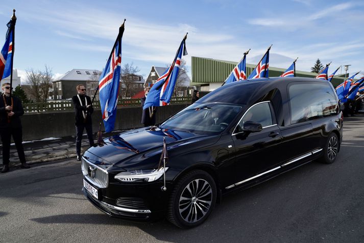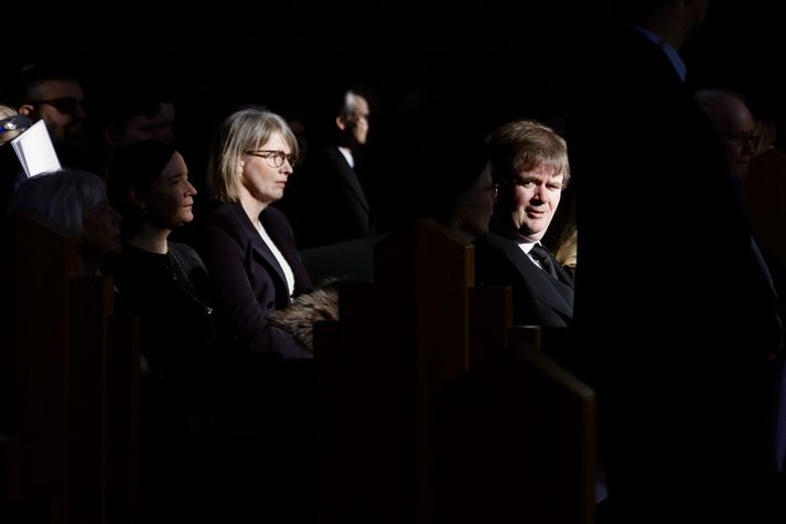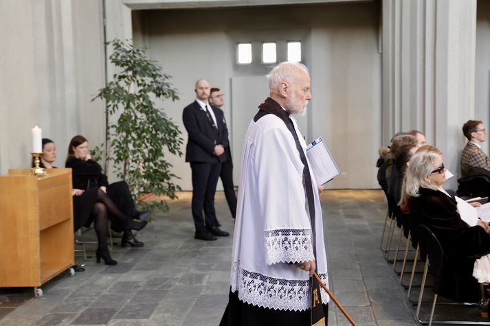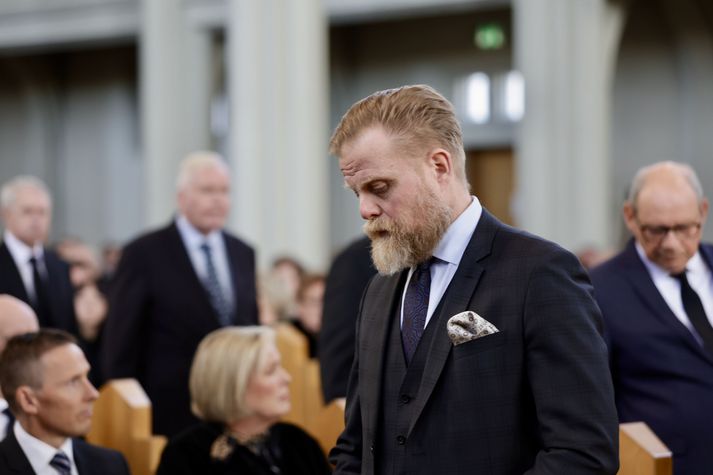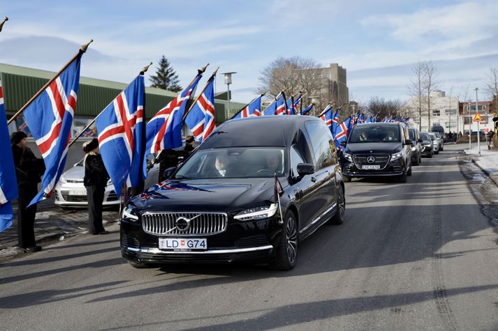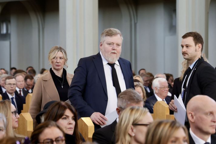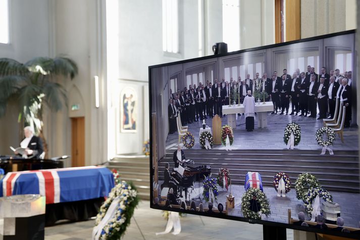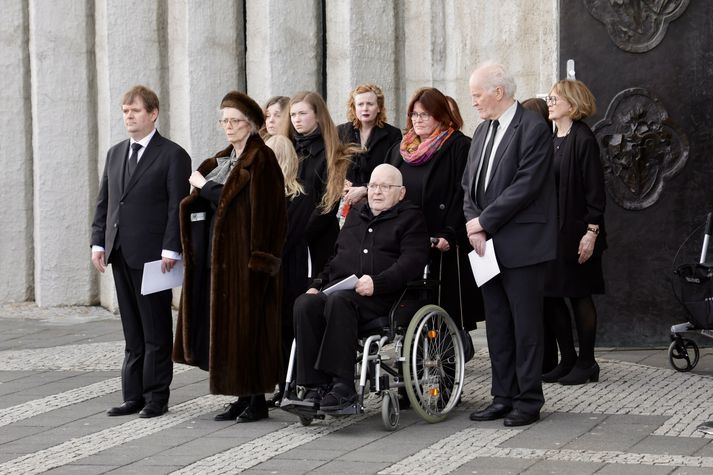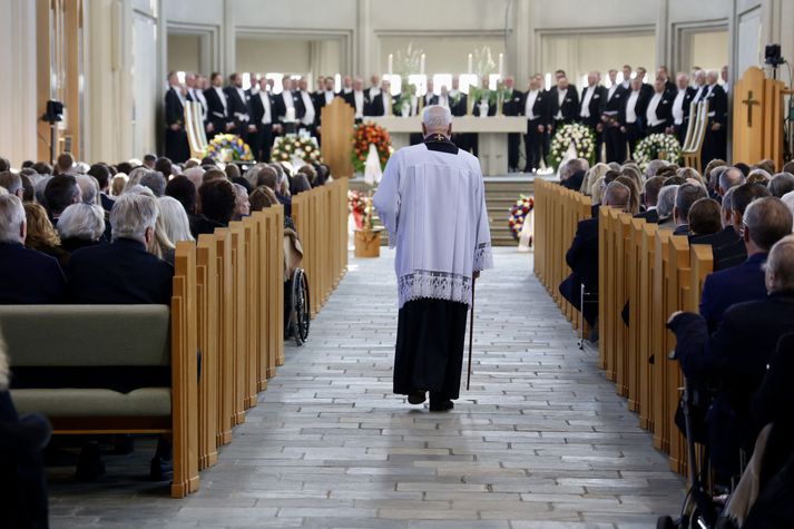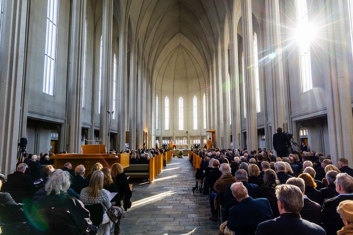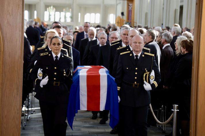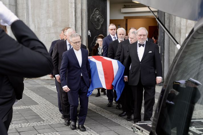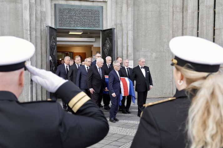 Síðasta opinbera útförin var þegar Halldór Ásgrímsson fyrrverandi forsætisráðherra var borinn til grafar 2015. Þá var opinber útför þegar Steingrímur Hermannsson fyrrverandi forsætisráðherra var kvaddur árið 2010. Opinberar útfarir voru tíðari á árum áður en virtir listamenn á borð við Kjarval og Laxness voru meðal þeirra sem hlutu opinbera útför. Séra Geir Waage gengur inn kirkjugólfið við upphaf athafnar.vísir/Vilhelm Séra Geir Waage stýrði athöfninni og flutti minningarorð um Davíð. Þar vitnaði hann meðal annars til sálma Davíðs úr Biblíunni. Kristinn Sigmundsson söng ásamt karlakórnum Fóstbræðrum og Sigurgeir Agnarsson lék Slá þú hjartans hörpustrengi eftir Bach á selló við upphaf athafnar. Í lok athafnar var lagið Ísland er land þitt flutt áður en Tómas Guðni Eggertsson organisti spilaði Við Reykjavíkurtjörn, lag Gunnars Þórðarsonar sem Davíð samdi textann við til Ástríðar konu sinnar. Ástríður Thorarensen eiginkona Davíðs og Þorsteinn Davíðsson sonur þeirra á fremsta bekk ásamt Heiðrúnu Geirsdóttur eiginkonu sinni og dætrum þeirra tveimur.Vísir/Vilhelm Vilhelm Gunnarsson ljósmyndari Vísis var með myndavélina á lofti og myndaði gesti og það sem fyrir augu bar. Sólin skein inn um háa glugga Hallgrímskirkju á meðan útför stóð.Vísir/Vilhelm Séra Geir Waage les upp úr guðspjallinu. Geir er tengdafaðir Þorsteins sonar Davíðs.Vísir/Vilhelm Karlakórinn Fóstbræður undir stjórn Árna Harðarsonar söng við útförina.vísir/Vilhelm Daði Már Kristófersson fjármálaráðherra.vísir/Vilhelm Líkmennirnir og vinir Davíðs þeir Haraldur Johannessen ritstjóri, Hannes Hólmsteinn Gissurarson prófessor í stjórnmálafræði, Þórólfur Gíslason kaupfélagsstjóri, Þórarinn Eldjárn skáld og Kjartan Gunnarsson fyrrverandi framkvæmdastjóri Sjálfstæðisflokksins sátu á fremsta bekk.Vísir/Vilhelm Bjarni Benediktsson var formaður Sjálfstæðisflokksins í sextán ár en Davíð í fjórtán. 27 ára seta Ólafs Thors í stóli formanns verður seint leikin eftir. Þóra Margrét Baldvinsdóttir eiginkona Bjarna var með í för í dag.Vísir/vilhelm Ólafur Ragnar fyrrverandi forseti ásamt Dorrit Moussaieff eiginkonu sinni.Vísir/Vilhelm Ólafur Börkur Þorvaldssson hæstaréttardómari og Ásgeir Jónsson seðlabankastjóri voru á meðal líkmanna.Vísir/Vilhelm Guðrún Karls Helgudóttir biskup Íslands fylgdist með Geir Waage stýra athöfninni.Vísir/Vilhelm Halla Tómasdóttir forseti og Björn Skúlason eiginmaður hennar. Kristrún Frostadóttir forsætisráðherra og Benedikt Bogason forseti Hæstaréttar voru með þeim á öðrum bekk en öll þrjú eru handhafar forsetavalds.Vísir/vilhelm Skjáir voru í kirkjunni til að auðvelda fólki að fylgjast með athöfninni.Vísir/Vilhelm Líkmennirnir tíu ganga inn í kirkjuna. Gunnlaugur Sævar Gunnlaugsson, Ólafur Börkur Þorvaldsson, Ásgeir Jónsson, Eiríkur Jónsson, Albert Jónsson, Haraldur Johannessen, Hannes Hólmsteinn Gissurarson, Þórólfur Gíslason, Þórarinn Eldjárn og Kjartan Gunnarsson.Vísir/Vilhelm Ráðherrar ríkisstjórnarinnar gáfu ekki kost á viðtölum eftir ríkisstjórnarfund í dag vegna skamms tíma á milli fundar og fram að útför. Hér eru Jóhann Páll Jóhannsson og Alma Möller.Vísir/Vilhelm Guðrún Hafsteinsdóttir formaður Sjálfstæðisflokksins virðir líkmennina Hannes Hólmstein, Þórólf Gíslason, Þórarinn Eldjárn og Kjartan Gunnarsson fyrir sér.Vísir/vilhelm Katrín Jakobsdóttir og Bjarni Benediktsson fallast í faðma en þau voru saman í ríkisstjórn frá 2017 til 2024. Vísir/Vilhelm Guðna Th. Jóhannessyni fyrrverandi forseta vísað til sætis.vísir/vilhelm Geir Haarde og Friðrik Sophusson takast í hendur. Inga Jóna Þórðardóttir eiginkona Geirs er til hægri.vísir/vilhelm Þorsteinn Pálsson og Sigurður Ingi Jóhannsson takast í hendur. Eitt af mörgum handaböndum Sjáflstæðismanns og Framsóknarmanns en flokkarnir hafa mannað marga ríkisstjórnina saman.vísir/vilhelm Séra Geir Waage gengur inn í kirkju og studdist við staf.vísir/vilhelm Þórarinn Eldjárn og Kjartan Gunnarsson voru góðir vinir Davíðs en allir þrír voru MR-ingar og höfðu gaman af bókum og listum.Vísir/Vilhelm Ráðherrarnir Eyjólfur Ármannsson og Þorbjörg Sigríður Gunnlaugsdóttir hleypa Þorgerði Katrínu Gunnarsdóttur félaga sínum úr ríkisstjórninni í sæti sitt.vísir/vilhelm Stórsöngvarinn Kristinn Sigmundsson söng við athöfnina.vísir/vilhelm Guðrún Bryndís Karlsdóttir biskup bent á hvar hún á að sitja.vísir/vilhelm Halla Tómasdóttir forseti Ísands mætir til athafnar svartklædd líkt og flestir gestir í dag.vísir/vilhelm Ásgeir Jónsson seðlabankastjóri var meðal líkmanna en Davíð var um tíma einn þriggja seðlabankastjóra landsins.Vísir/vilhelm Sigmundur Davíð Gunnlaugsson formaður Miðflokksins mætir ásamt Önnu Sigurlaugu Pálsdóttur eiginkonu sinni.Vísir/vilhelm Hannes Hólmsteinn Gissurarson hefur lýst Davíð Oddssyni sem sínum besta vini.Vísir/vilhelm Geir Haarde tók við formennsku í Sjálfstæðisflokknum af Davíð á sínum tíma. Þá var hann fjármálaráðherra í ríkisstjórn Davíðs.vísir/vilhelm Þorsteinn Davíðsson sonur Davíðs og héraðsdómari var á fremsta bekk.Vísir/vilhelm Þórdís Kolbrún Reykfjörð Gylfadóttir þingmaður Sjálfstæðisflokksins.Vísir/Vilhelm Guðni Ágústsson fyrrverandi formaður Framsóknarflokksins og Lilja Dögg Alfreðsdóttir nýkjörinn formaður flokksins sátu hlið við hlið.Vísir/vilhelm Árni Harðarson stýrði Karlakórnum Fóstbræðrum.vísir/Vilhelm Fjölskylda Davíðs fyrir utan Hallgrímskirkju að athöfn lokinni. Horfa á eftir kistunni á leið í líkbílinn.vísir/vilhelm Lögregluþjónar báru kistu Davíðs úr kirkjunni og fram í andyri þar sem líkmenn tók