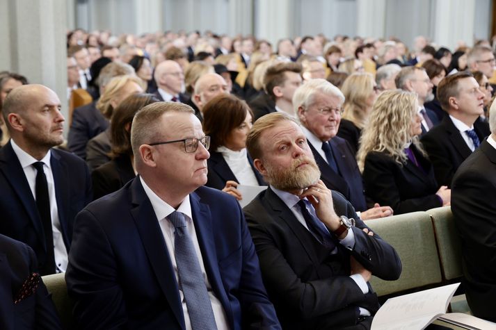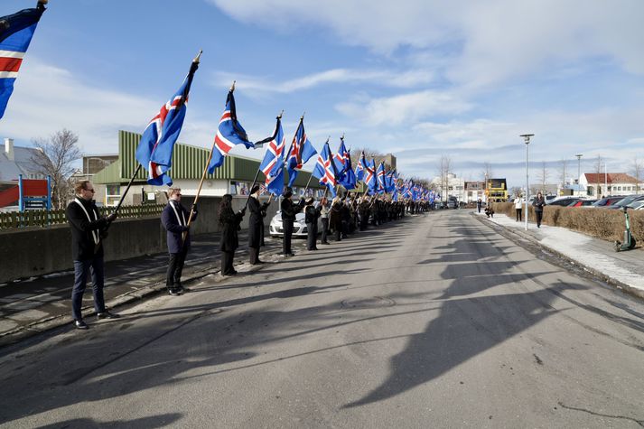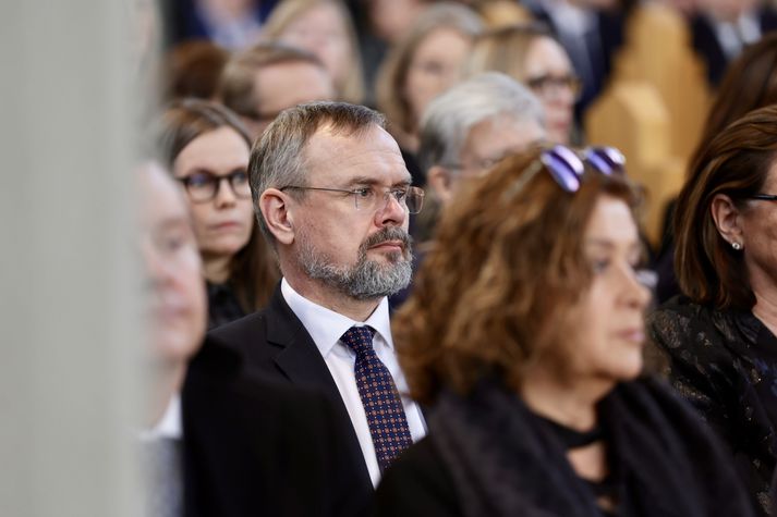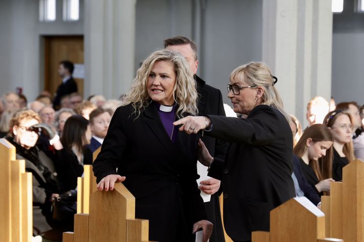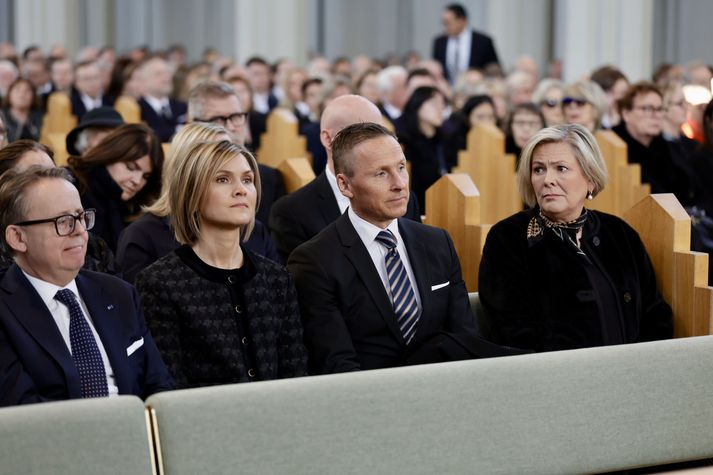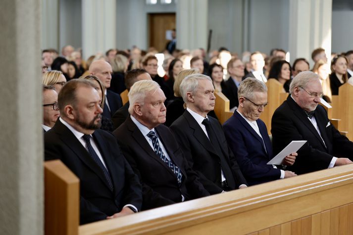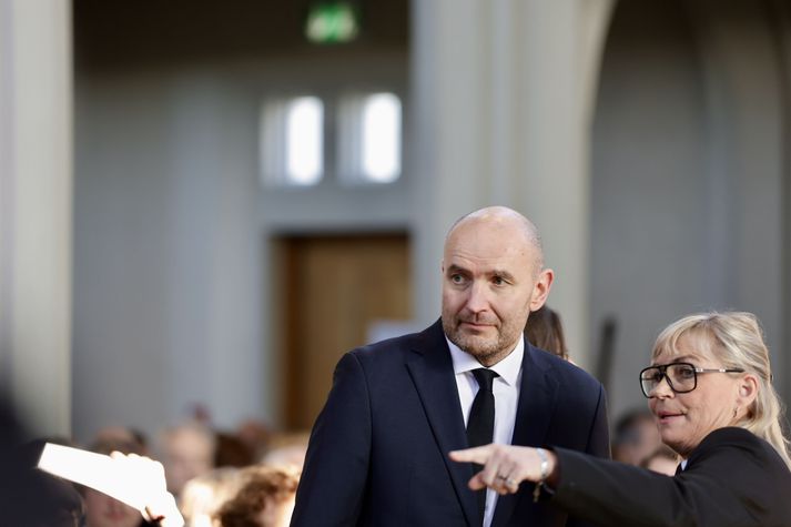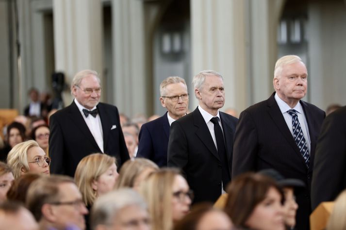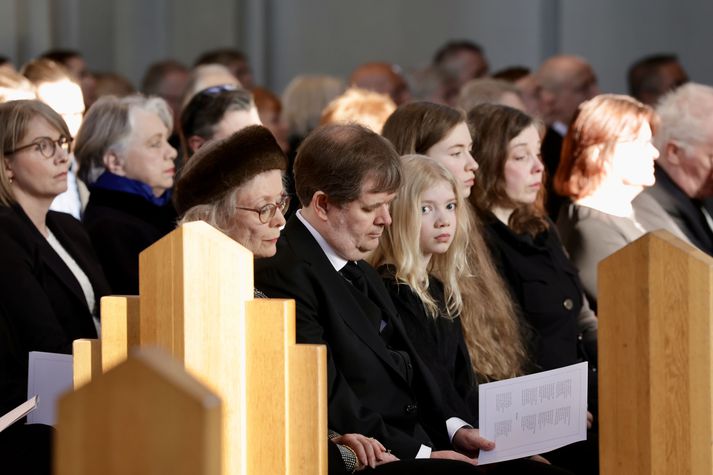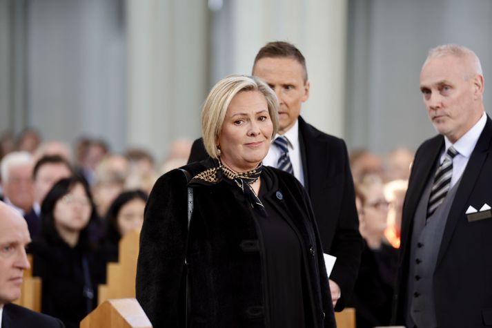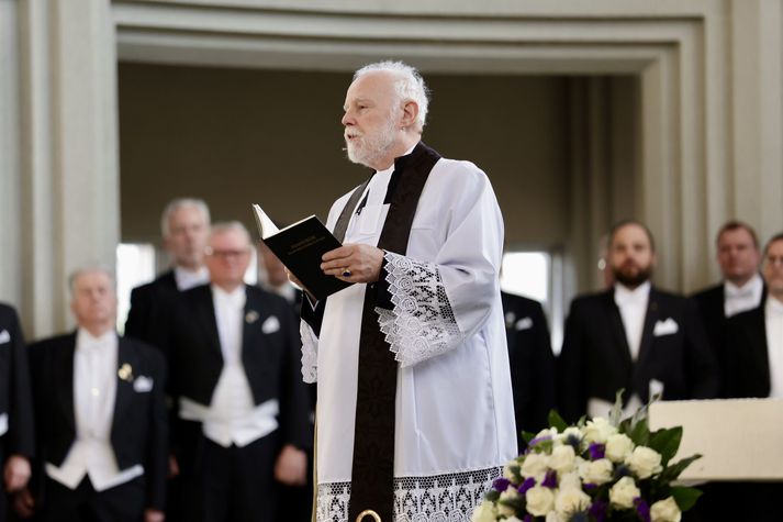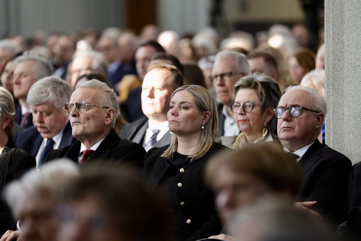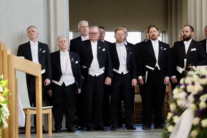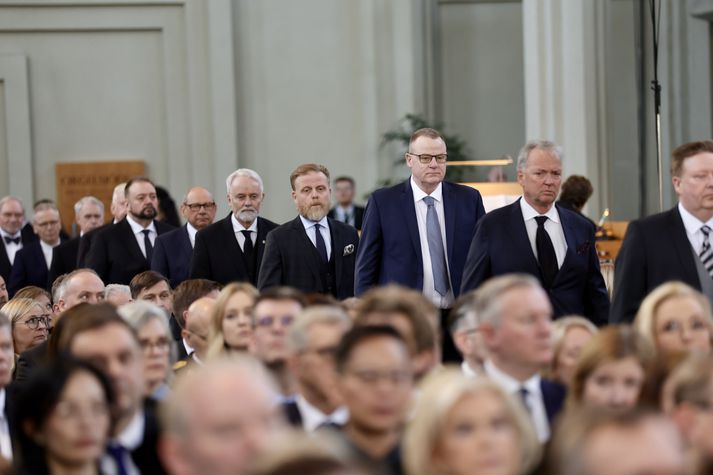 Síðasta opinbera útförin var þegar Halldór Ásgrímsson fyrrverandi forsætisráðherra var borinn til grafar 2015. Þá var opinber útför þegar Steingrímur Hermannsson fyrrverandi forsætisráðherra var kvaddur árið 2010. Opinberar útfarir voru tíðari á árum áður en virtir listamenn á borð við Kjarval og Laxness voru meðal þeirra sem hlutu opinbera útför. Séra Geir Waage gengur inn kirkjugólfið við upphaf athafnar.vísir/Vilhelm Séra Geir Waage stýrði athöfninni og flutti minningarorð um Davíð. Þar vitnaði hann meðal annars til sálma Davíðs úr Biblíunni. Kristinn Sigmundsson söng ásamt karlakórnum Fóstbræðrum og Sigurgeir Agnarsson lék Slá þú hjartans hörpustrengi eftir Bach á selló við upphaf athafnar. Í lok athafnar var lagið Ísland er land þitt flutt áður en Tómas Guðni Eggertsson organisti spilaði Við Reykjavíkurtjörn, lag Gunnars Þórðarsonar sem Davíð samdi textann við til Ástríðar konu sinnar. Ástríður Thorarensen eiginkona Davíðs og Þorsteinn Davíðsson sonur þeirra á fremsta bekk ásamt Heiðrúnu Geirsdóttur eiginkonu sinni og dætrum þeirra tveimur.Vísir/Vilhelm Vilhelm Gunnarsson ljósmyndari Vísis var með myndavélina á lofti og myndaði gesti og það sem fyrir augu bar. Sólin skein inn um háa glugga Hallgrímskirkju á meðan útför stóð.Vísir/Vilhelm Séra Geir Waage les upp úr guðspjallinu. Geir er tengdafaðir Þorsteins sonar Davíðs.Vísir/Vilhelm Karlakórinn Fóstbræður undir stjórn Árna Harðarsonar söng við útförina.vísir/Vilhelm Daði Már Kristófersson fjármálaráðherra.vísir/Vilhelm Líkmennirnir og vinir Davíðs þeir Haraldur Johannessen ritstjóri, Hannes Hólmsteinn Gissurarson prófessor í stjórnmálafræði, Þórólfur Gíslason kaupfélagsstjóri, Þórarinn Eldjárn skáld og Kjartan Gunnarsson fyrrverandi framkvæmdastjóri Sjálfstæðisflokksins sátu á fremsta bekk.Vísir/Vilhelm Bjarni Benediktsson var formaður Sjálfstæðisflokksins í sextán ár en Davíð í fjórtán. 27 ára seta Ólafs Thors í stóli formanns verður seint leikin eftir. Þóra Margrét Baldvinsdóttir eiginkona Bjarna var með í för í dag.Vísir/vilhelm Ólafur Ragnar fyrrverandi forseti ásamt Dorrit Moussaieff eiginkonu sinni.Vísir/Vilhelm Ólafur Börkur Þorvaldssson hæstaréttardómari og Ásgeir Jónsson seðlabankastjóri voru á meðal líkmanna.Vísir/Vilhelm Guðrún Karls Helgudóttir biskup Íslands fylgdist með Geir Waage stýra athöfninni.Vísir/Vilhelm Halla Tómasdóttir forseti og Björn Skúlason eiginmaður hennar. Kristrún Frostadóttir forsætisráðherra og Benedikt Bogason forseti Hæstaréttar voru með þeim á öðrum bekk en öll þrjú eru handhafar forsetavalds.Vísir/vilhelm Skjáir voru í kirkjunni til að auðvelda fólki að fylgjast með athöfninni.Vísir/Vilhelm Líkmennirnir tíu ganga inn í kirkjuna. Gunnlaugur Sævar Gunnlaugsson, Ólafur Börkur Þorvaldsson, Ásgeir Jónsson, Eiríkur Jónsson, Albert Jónsson, Haraldur Johannessen, Hannes Hólmsteinn Gissurarson, Þórólfur Gíslason, Þórarinn Eldjárn og Kjartan Gunnarsson.Vísir/Vilhelm Ráðherrar ríkisstjórnarinnar gáfu ekki kost á viðtölum eftir ríkisstjórnarfund í dag vegna skamms tíma á milli fundar og fram að útför. Hér eru Jóhann Páll Jóhannsson og Alma Möller.Vísir/Vilhelm Guðrún Hafsteinsdóttir formaður Sjálfstæðisflokksins virðir líkmennina Hannes Hólmstein, Þórólf Gíslason, Þórarinn Eldjárn og Kjartan Gunnarsson fyrir sér.Vísir/vilhelm Katrín Jakobsdóttir og Bjarni Benediktsson fallast í faðma en þau voru saman í ríkisstjórn frá 2017 til 2024. Vísir/Vilhelm Guðna Th. Jóhannessyni fyrrverandi forseta vísað til sætis.vísir/vilhelm Geir Haarde og Friðrik Sophusson takast í hendur. Inga Jóna Þórðardóttir eiginkona Geirs er til hægri.vísir/vilhelm Þorsteinn Pálsson og Sigurður Ingi Jóhannsson takast í hendur. Eitt af mörgum handaböndum Sjáflstæðismanns og Framsóknarmanns en flokkarnir hafa mannað marga ríkisstjórnina saman.vísir/vilhelm Séra Geir Waage gengur inn í kirkju og studdist við staf.vísir/vilhelm Þórarinn Eldjárn og Kjartan Gunnarsson voru góðir vinir Davíðs en allir þrír voru MR-ingar og höfðu gaman af bókum og listum.Vísir/Vilhelm Ráðherrarnir Eyjólfur Ármannsson og Þorbjörg Sigríður Gunnlaugsdóttir hleypa Þorgerði Katrínu Gunnarsdóttur félaga sínum úr ríkisstjórninni í sæti sitt.vísir/vilhelm Stórsöngvarinn Kristinn Sigmundsson söng við athöfnina.vísir/vilhelm Guðrún Bryndís Karlsdóttir biskup bent á hvar hún á að sitja.vísir/vilhelm Halla Tómasdóttir forseti Ísands mætir til athafnar svartklædd líkt og flestir gestir í dag.vísir/vilhelm Ásgeir Jónsson seðlabankastjóri var meðal líkmanna en Davíð var um tíma einn þriggja seðlabankastjóra landsins.Vísir/vilhelm Sigmundur Davíð Gunnlaugsson formaður Miðflokksins mætir ásamt Önnu Sigurlaugu Pálsdóttur eiginkonu sinni.Vísir/vilhelm Hannes Hólmsteinn Gissurarson hefur lýst Davíð Oddssyni sem sínum besta vini.Vísir/vilhelm Geir Haarde tók við formennsku í Sjálfstæðisflokknum af Davíð á sínum tíma. Þá var hann fjármálaráðherra í ríkisstjórn Davíðs.vísir/vilhelm Þorsteinn Davíðsson sonur Davíðs og héraðsdómari var á fremsta bekk.Vísir/vilhelm Þórdís Kolbrún Reykfjörð Gylfadóttir þingmaður Sjálfstæðisflokksins.Vísir/Vilhelm Guðni Ágústsson fyrrverandi formaður Framsóknarflokksins og Lilja Dögg Alfreðsdóttir nýkjörinn formaður flokksins sátu hlið við hlið.Vísir/vilhelm Árni Harðarson stýrði Karlakórnum Fóstbræðrum.vísir/Vilhelm Fjölskylda Davíðs fyrir utan Hallgrímskirkju að athöfn lokinni. Horfa á eftir kistunni á leið í líkbílinn.vísir/vilhelm Lögregluþjónar báru kistu Davíðs úr kirkjunni og fram í andyri þar sem líkmenn tók